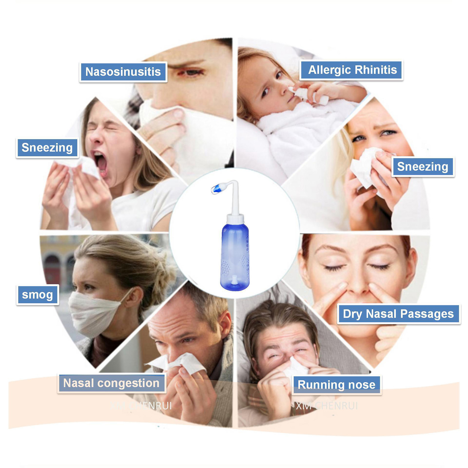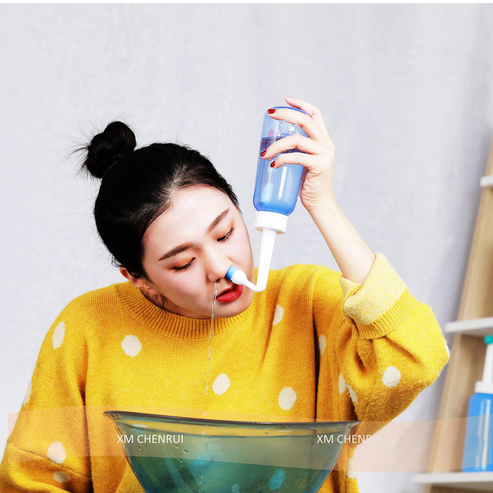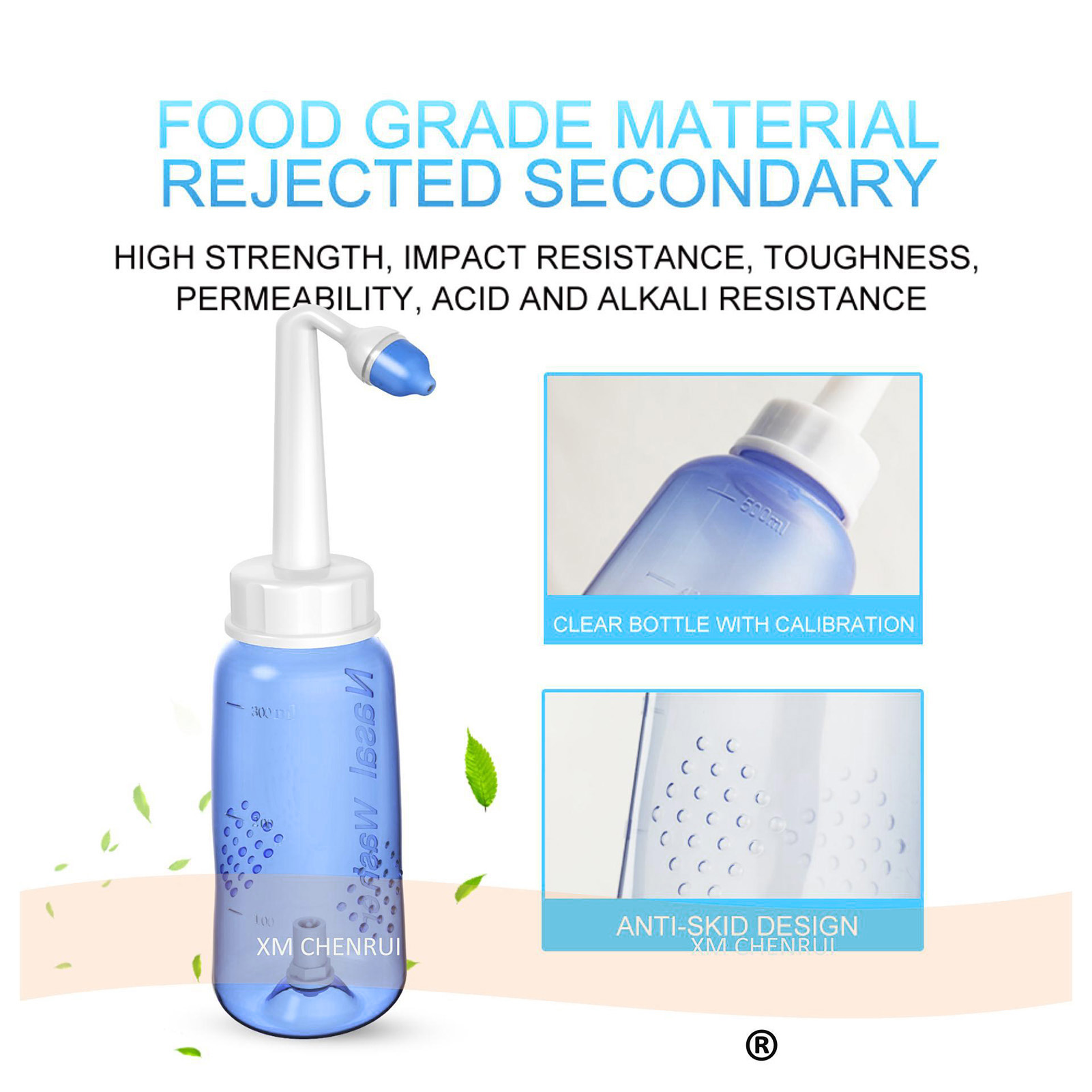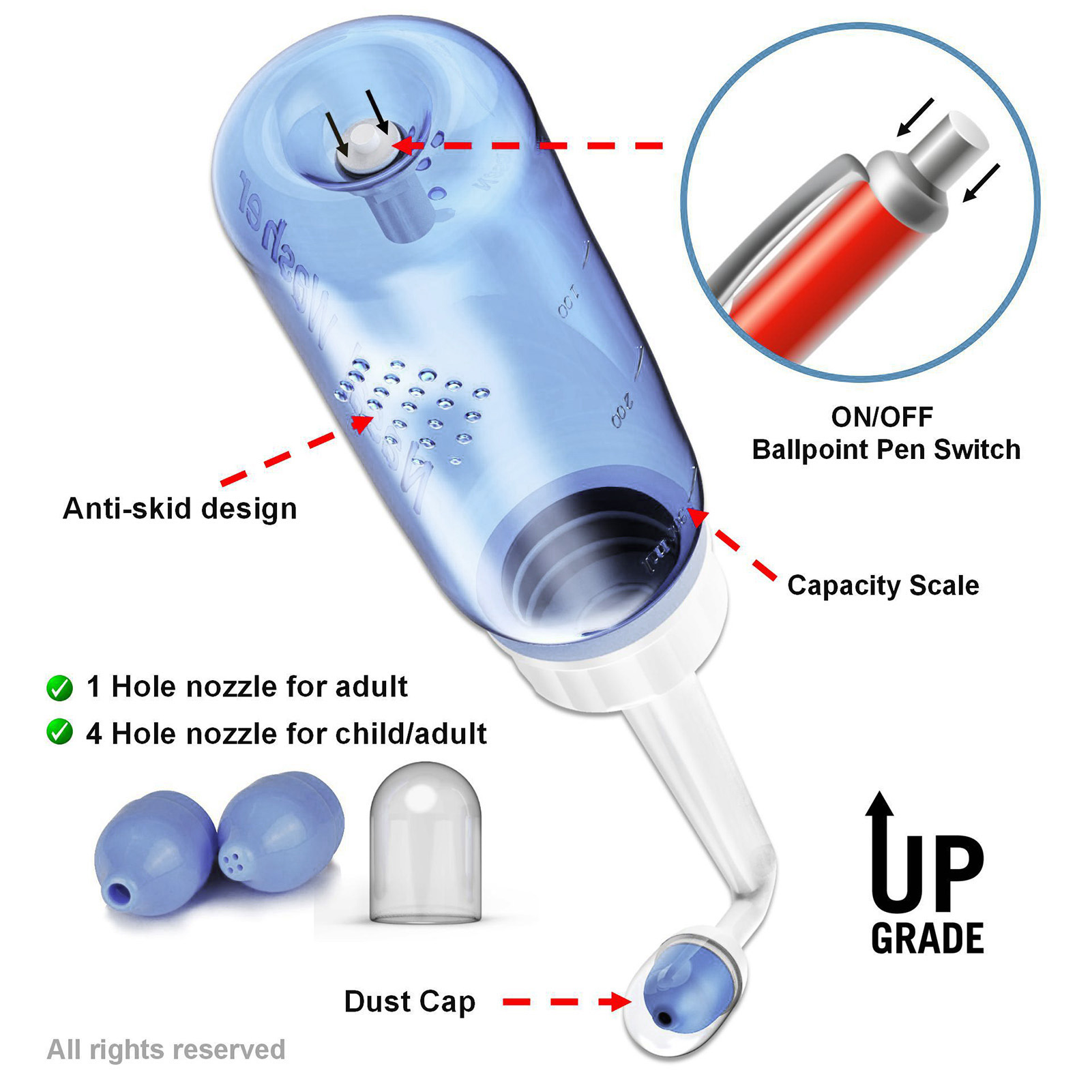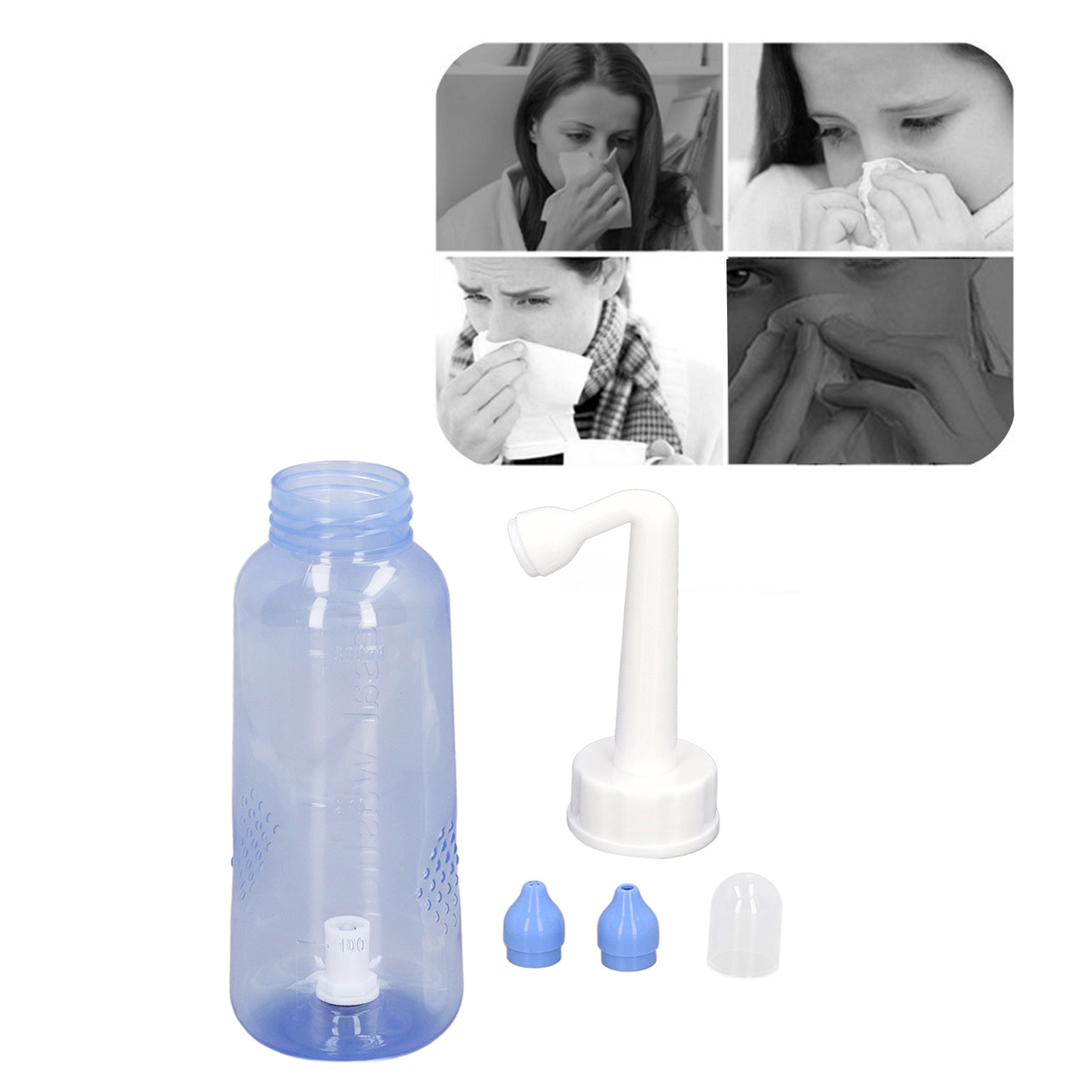 1、Practical: Gently irrigating nasal passages and sinus rinse out mucus and various irritants. 300ml capacity is enough to clean your nose well and help you breathe better. 2、Operation: Adopts special locking switch design, simply turn the bottle upside down and press the button, and then press it to stop water flow, more convenient and fast. 3、Soothing Stream: The stream of the bottle gently flows through the nostrils. It's not trying to force water through your congestion, hydrating and soothing. 4、Ergonomic Design: This nasal rinse bottle with non slip particle design, making nasal flushing easier and more comfortable. Warm water to rinse the nasal cavity is more comfortable. 5、Two Nozzles: This sinus rinse come with 2pcs nozzles. 1 hole nozzle is for adult, the other with 4 holes to make the flow more slow to adapt child's needs. Ideal for family or individual daily nasal care.