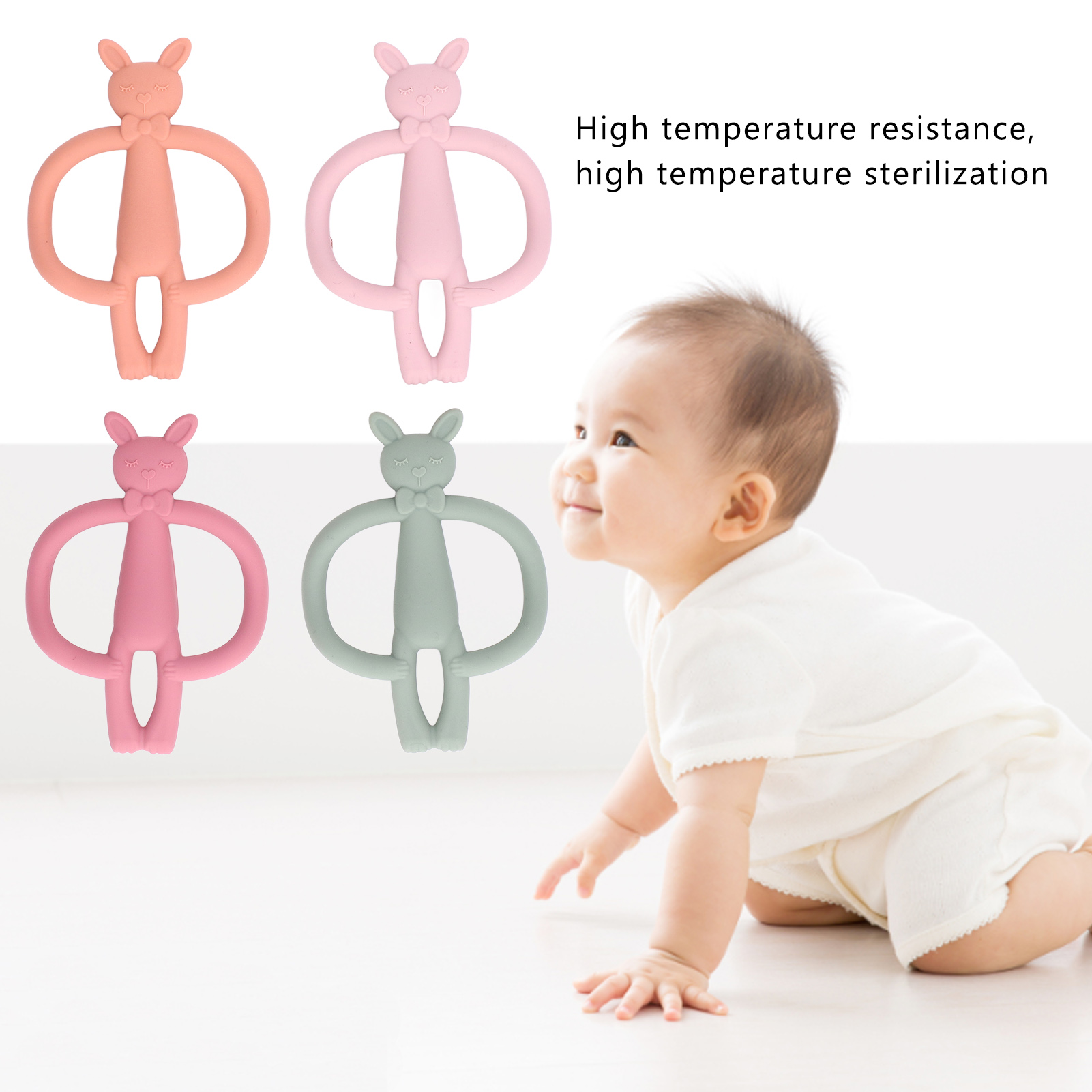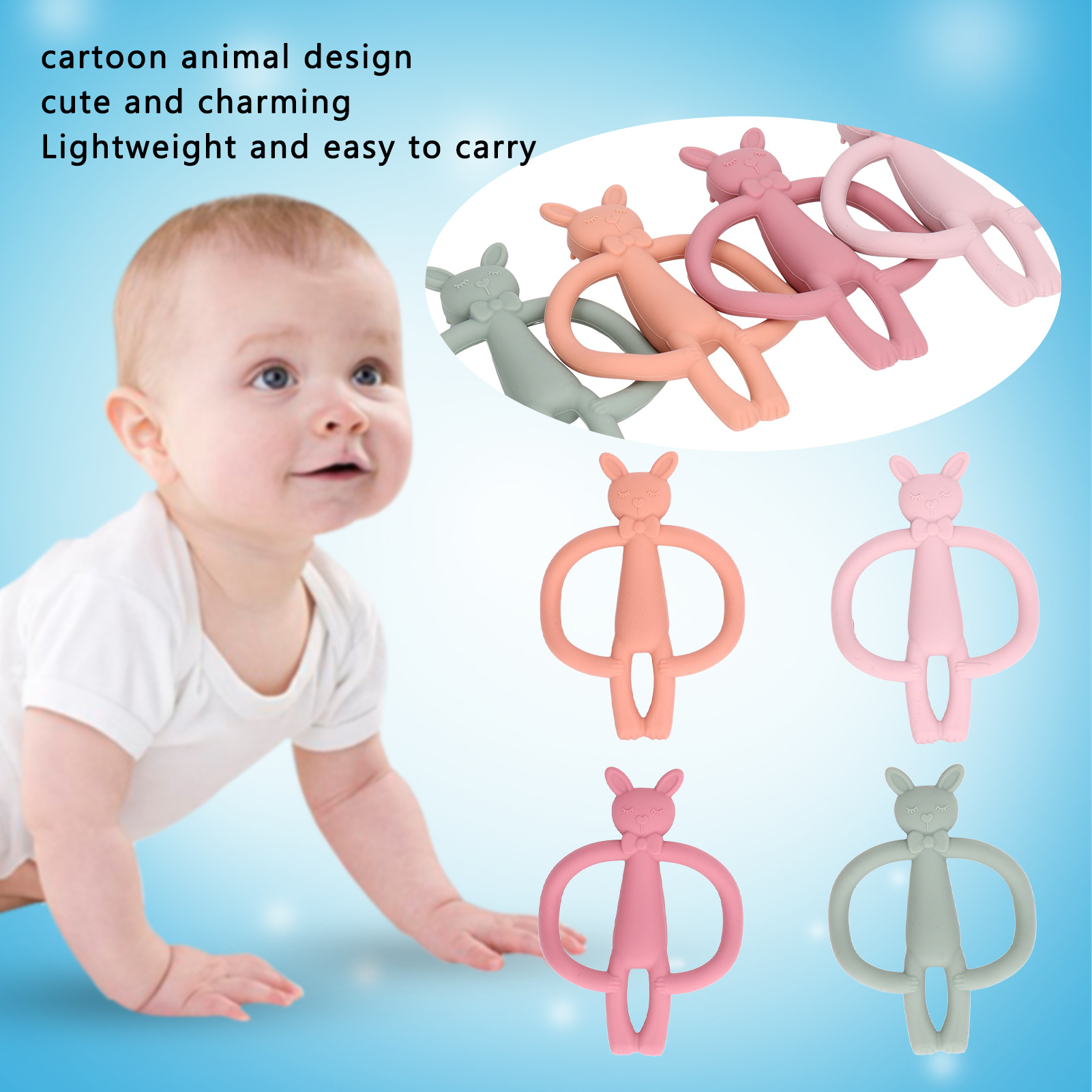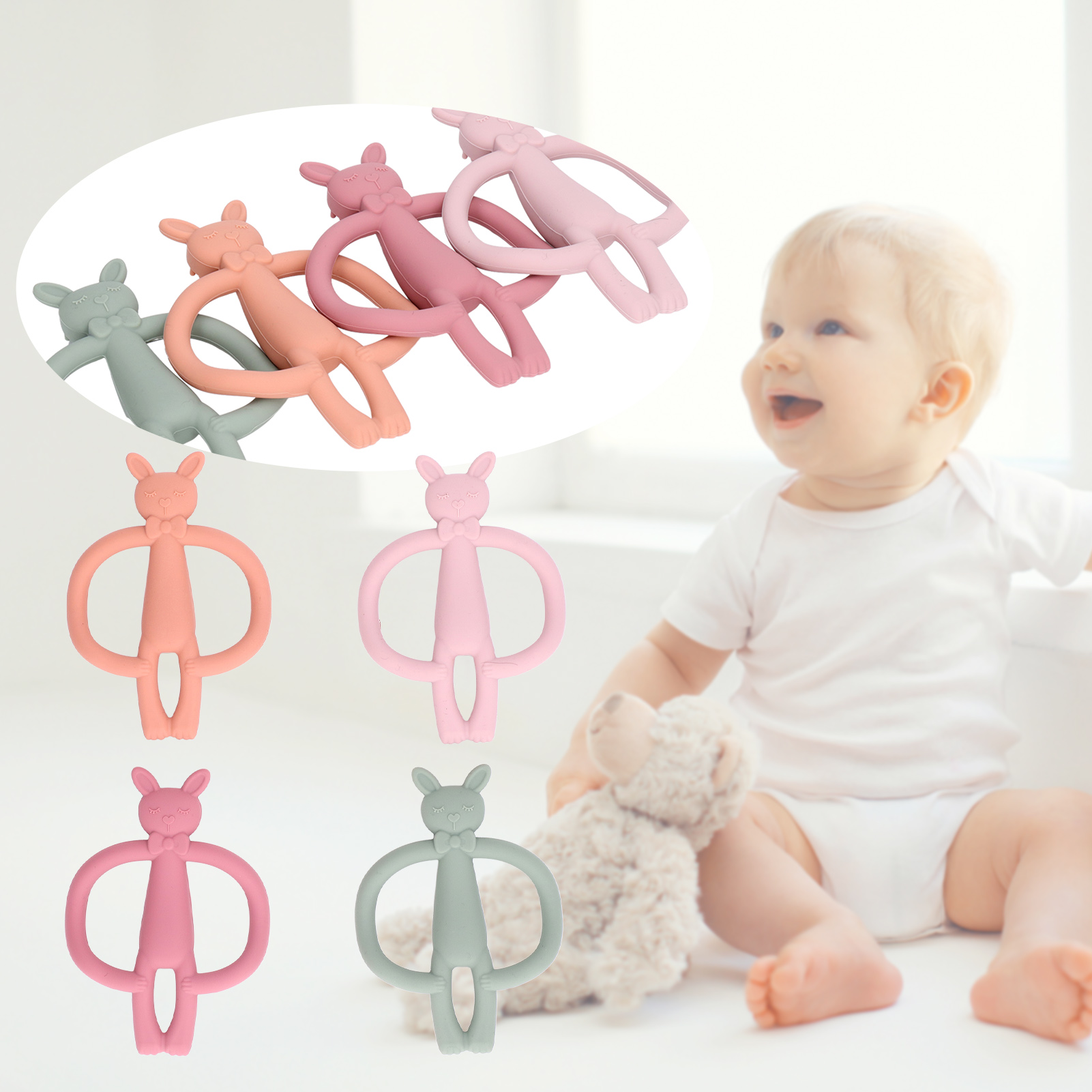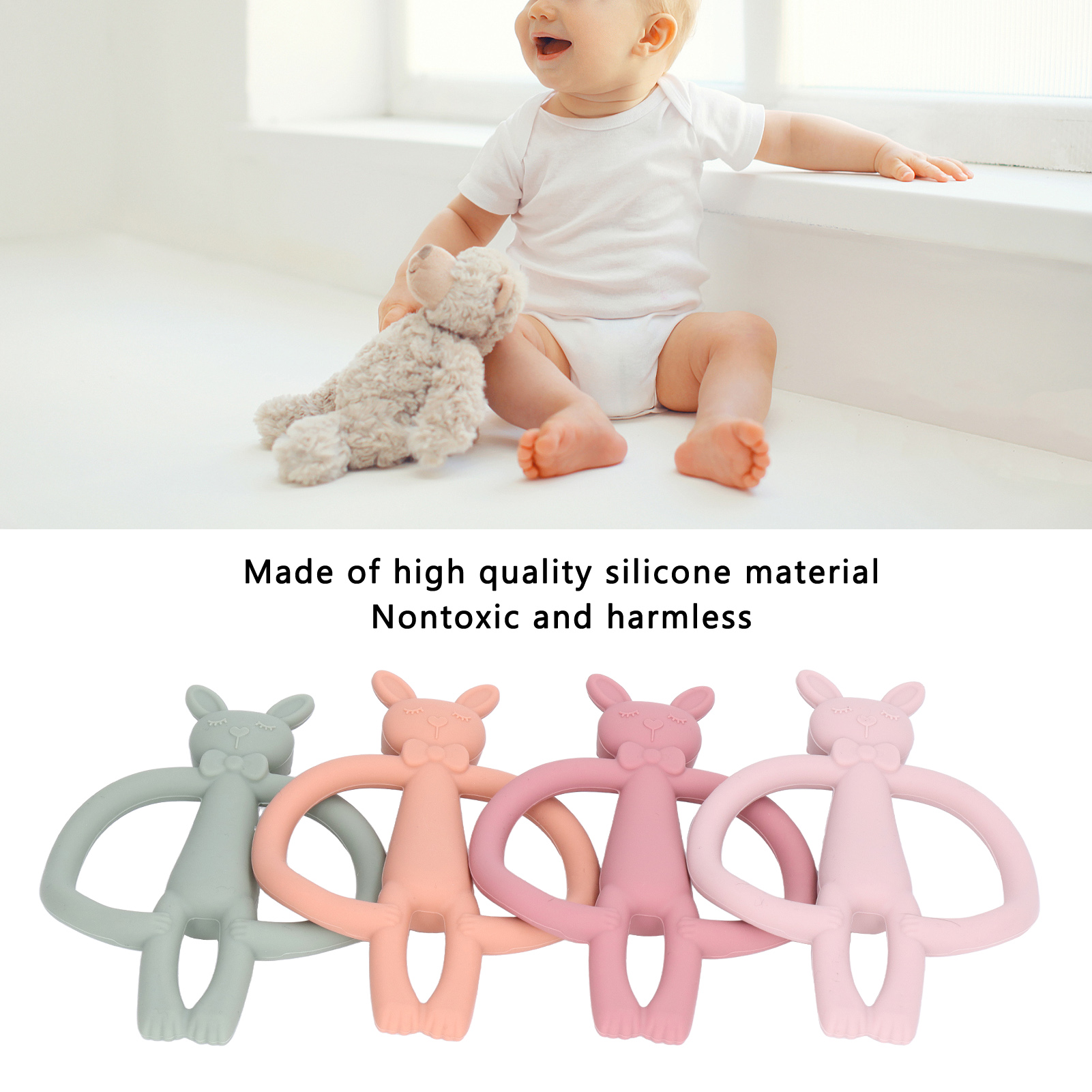1、High Quality Materials: Made of high quality silicone material, this baby teether is nontoxic, safe and harmless. 2、High Temperature Resistance: It is resistant to high temperature and can be sterilized at high temperature to ensure the health of your baby. 3、Function: Help your baby concentrate while breastfeeding or stay happy with natural teething pain relief. 4、Cartoon Animal Design: With cartoon animal design, cute and charming, can attract baby's attention. 5、Lightweight: This beautifully crafted baby teether is lightweight, convenient, and easy to carry around with you.