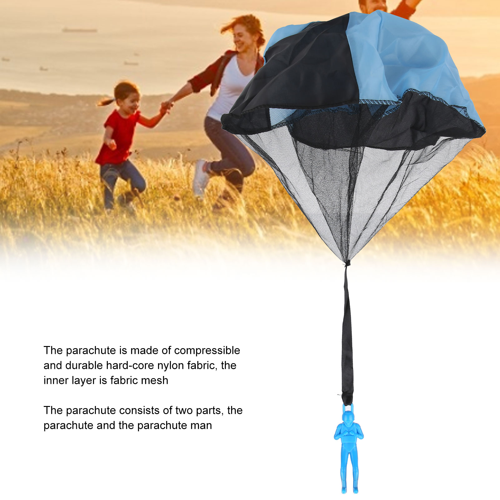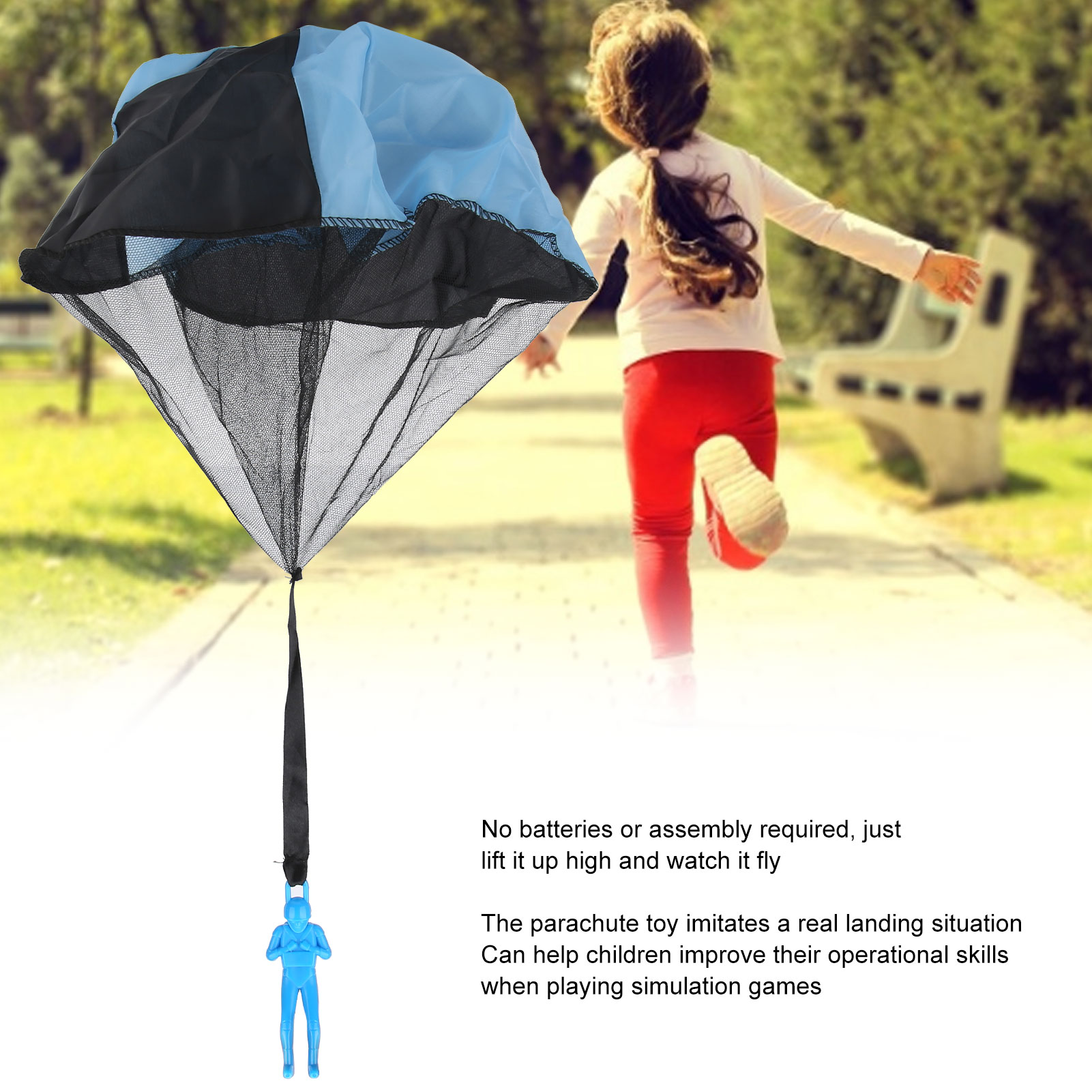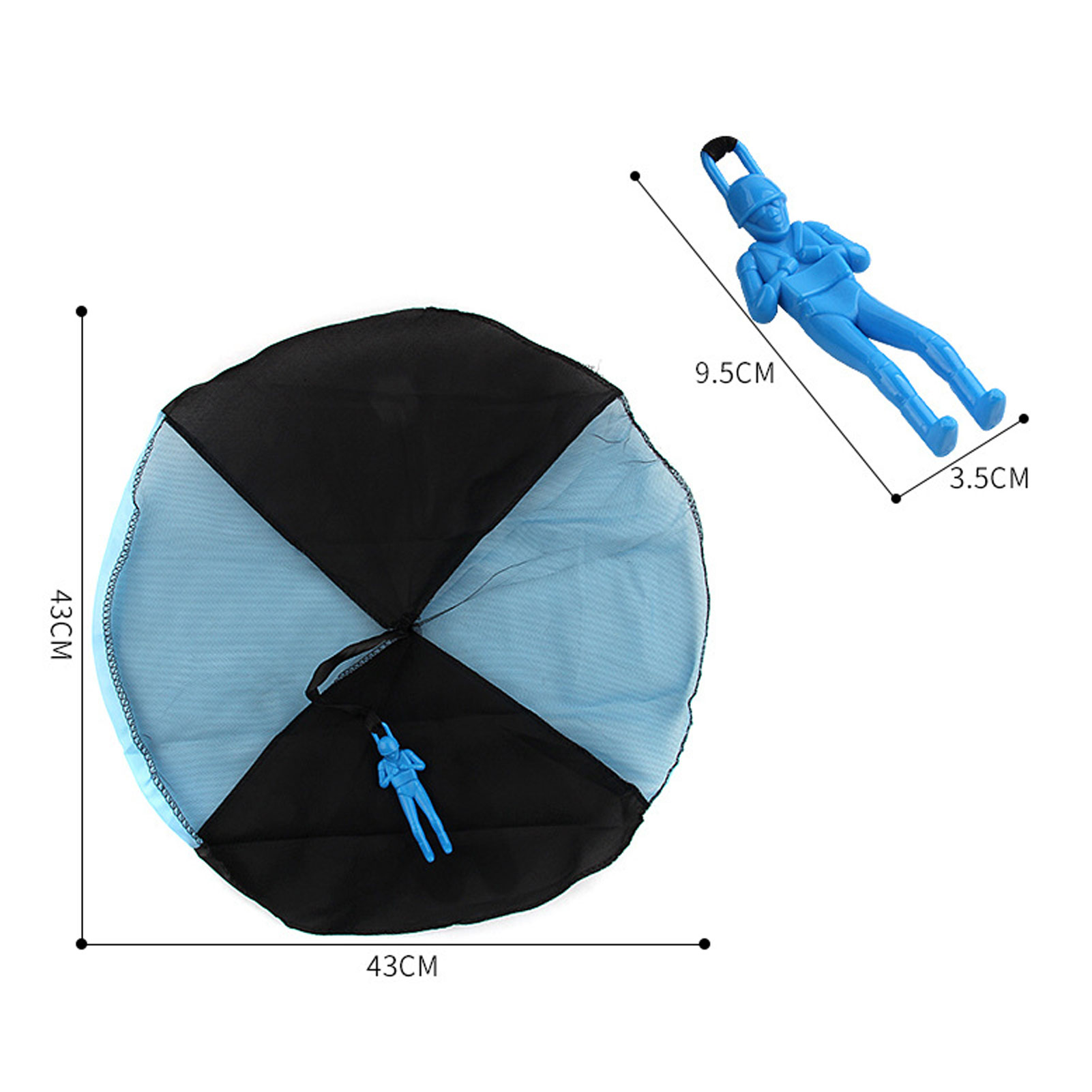 1、The parachute is made of a compressible and durable hard‑core nylon fabric with a fabric net inside. 2、The parachute consists of two parts, the parachute and the parachute man. 3、The tangled‑free parachute will not entangle any strings. There is no need for batteries or assembly, children can operate it by themselves, just lift it up high and watch it fly. 4、The parachute toy imitates the real landing situation and can help children improve their operational ability when playing simulation games. 5、The unisex design is suitable for boys and girls, and is suitable as a holiday gift for kids.
