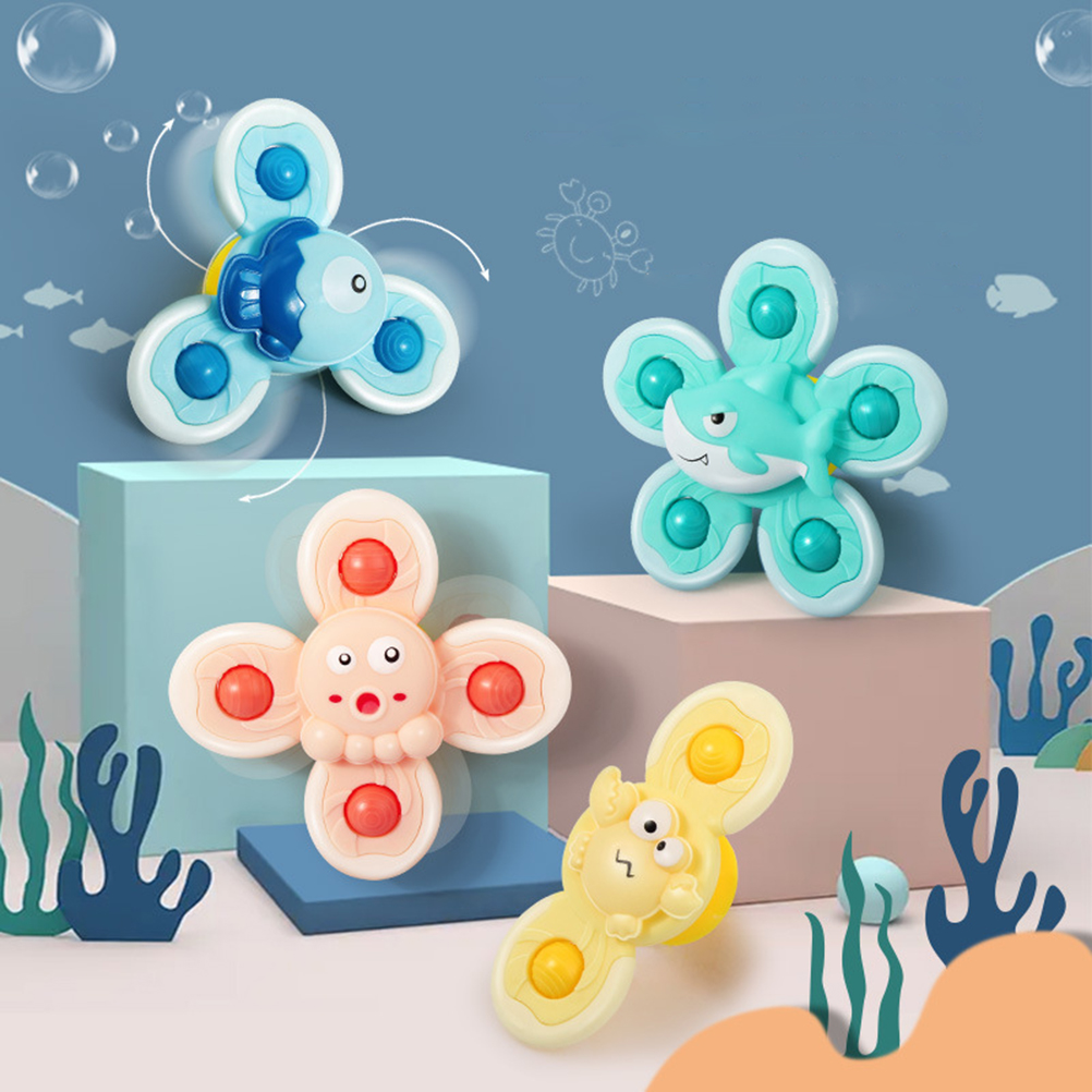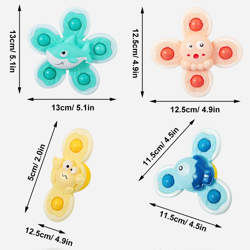 1、1. Lucky box: You will receive a surprise box full of random cartoon animal rotating toys. A box includes 4 rotating sucker toys in the shape of a small crab, a large octopus, a bigeye, and a small shark, with random fan blades. Keep it mysterious and you'll be very happy. Great bath toys for kids, the cute cartoon animal rotating top can also be stuck in your baby's tub or tub for a fun bath. 2、2. High-quality material: The toys are made of high-quality food-grade soft silicone, which is more comfortable to play with, easy to grasp, does not harm children and is safe for children. These rotating toys come in 4 different designs and bright colors. Open the package and find that the product does not absorb the wall, please don't worry, blanch it with boiling water before use to restore the suction. 3、3. Creative educational toys: This rotating toy has various shapes, bright colors, wobbly, and pleasant sounds. It is used to attract the baby's attention, stimulate the baby's curiosity and imagination, and help improve the baby's hand-eye coordination and Exercise the body through the fine hand movements of grasping, suction, and rotation. 4、4. Sensory toys: The rotating fan blades and cute animal shapes can ease the baby's mood, make the baby feel happy, and help the baby fall asleep quickly. When breastfeeding, stick this turntable on the table or wall and turn it to attract the baby's attention, and let the baby eat obediently.
