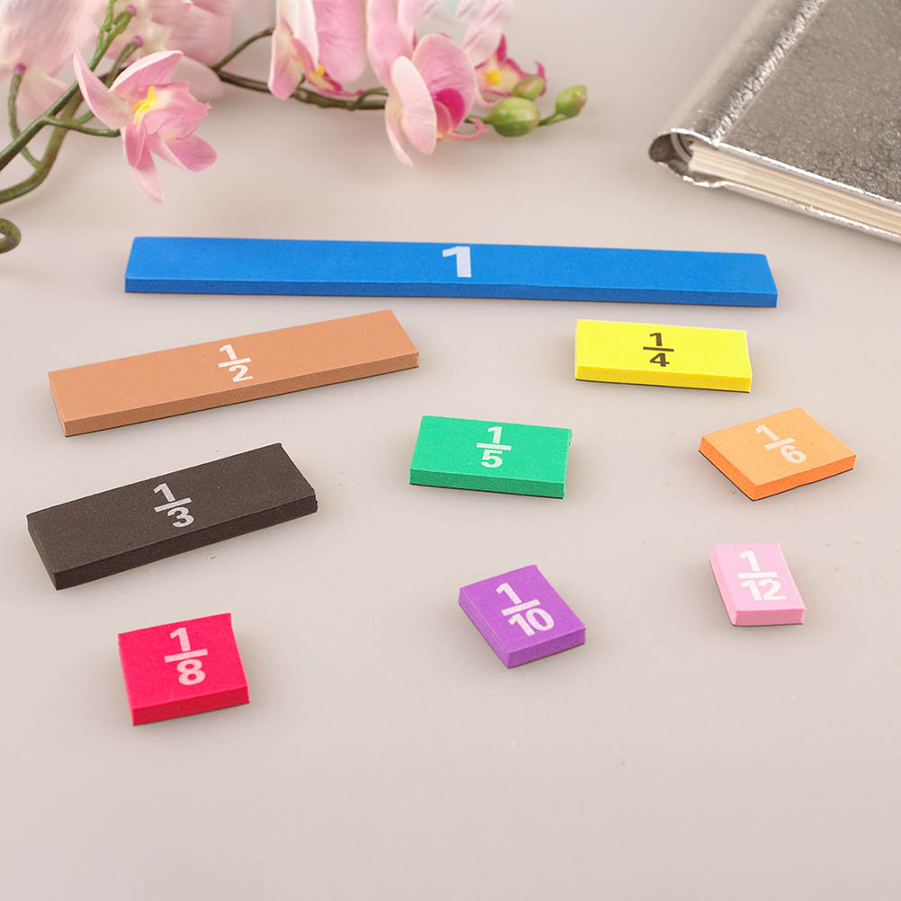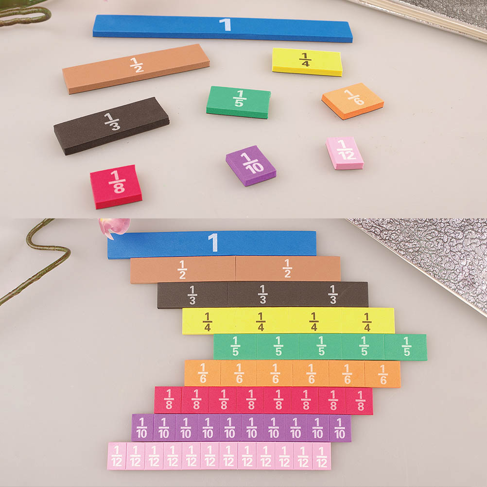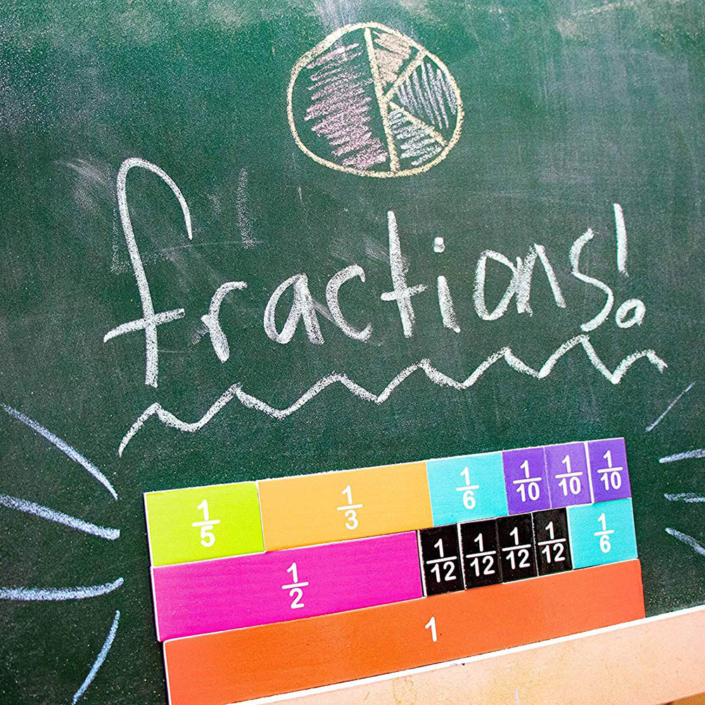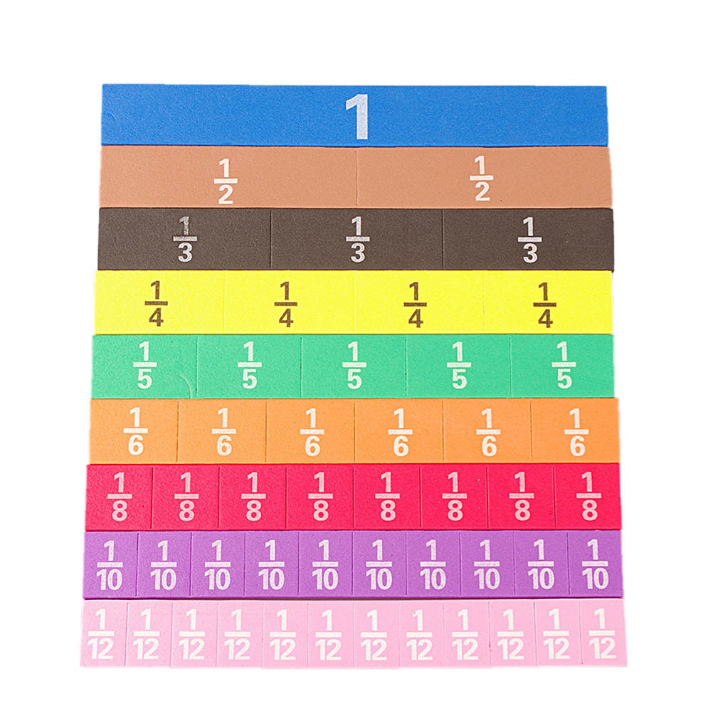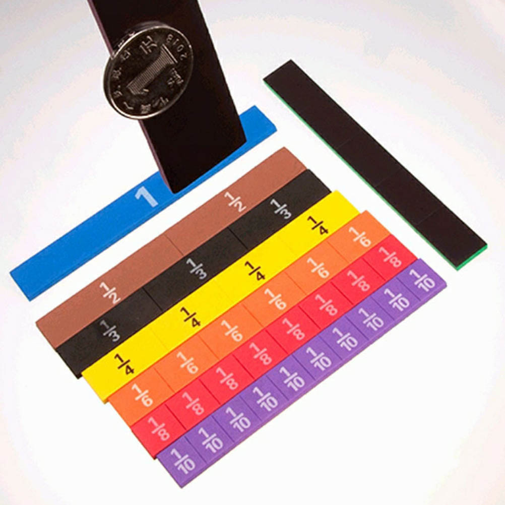 1、Tiles contain 1, 1/2, 1/3, 1/4, 1/5, 1/6, 1/8, 1/10, 1/11 and 1/12, total 51pcs of magnetic segments with numbers on. 2、 9 Colors, each color identifies a different fraction. 3、 Help students to visualize fraction and learn Multiplication & Counting. 4、 Thick magnet backing, easy for educational demonstration on whiteboard or magnetic chalkboard, or for kids to manipulate and self-study. 5、 Ideal for grade 2-5.