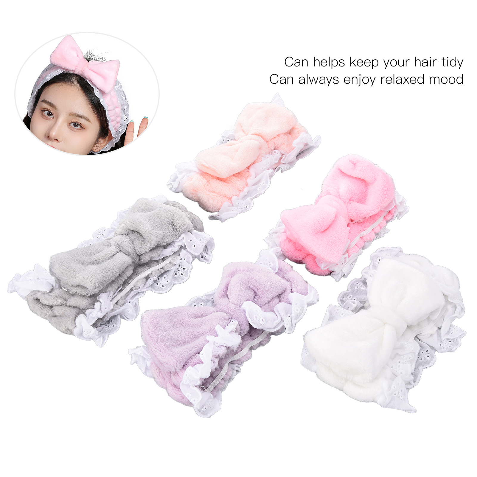 1、Lovely Shape: With cute lace edged bow shape headband and can helps keep your hair tidy. 2、Relax Your Mood: When you wash face and take a bath, you can always enjoy a relaxed and happy mood. 3、Wide Range of Applications: Can be used for spa treatments, tooth brushing, face washing, bathing and makeup. 4、Elastic Design: Hair band has good elasticity and can be adjusted according to the size of your head to fit your head. 5、High Quality Material: Super soft and durable, exceptionally fluffy and soft, comfortable and easy to wear without any shedding and skin hurt.