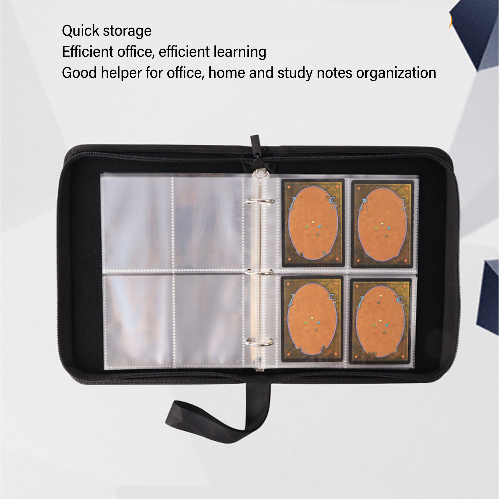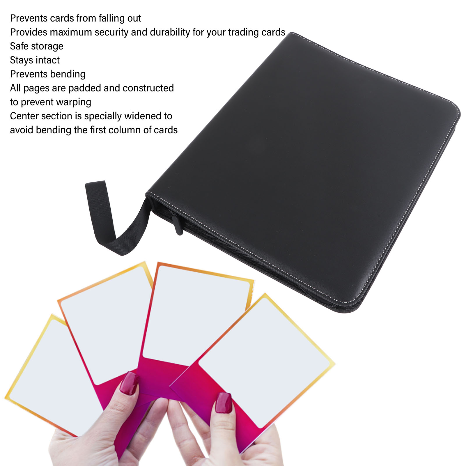 1、PREVENT FALLING OUT: Trading card binder can prevent cards from falling out. Provides maximum security and durability for your trading cards. 2、SECURE COLLECTION: Card album keeps your cards safely tucked away and intact. Sturdy and durable, withstands tears and scratches, and is super clear to display. 3、PREVENTS BENDING: All pages are padded and constructed to prevent warping. The center section is specially widened to avoid bending the first column of cards. 4、EASY TO INSERT: Card collection binder makes it easier to insert cards and keeps them intact and organized. Environmentally friendly material, wear resistant. 5、QUICK STORAGE: 9 pocket trading card binder is a fast organizer, efficient office, efficient study, a good helper for office, home, study notes organization.