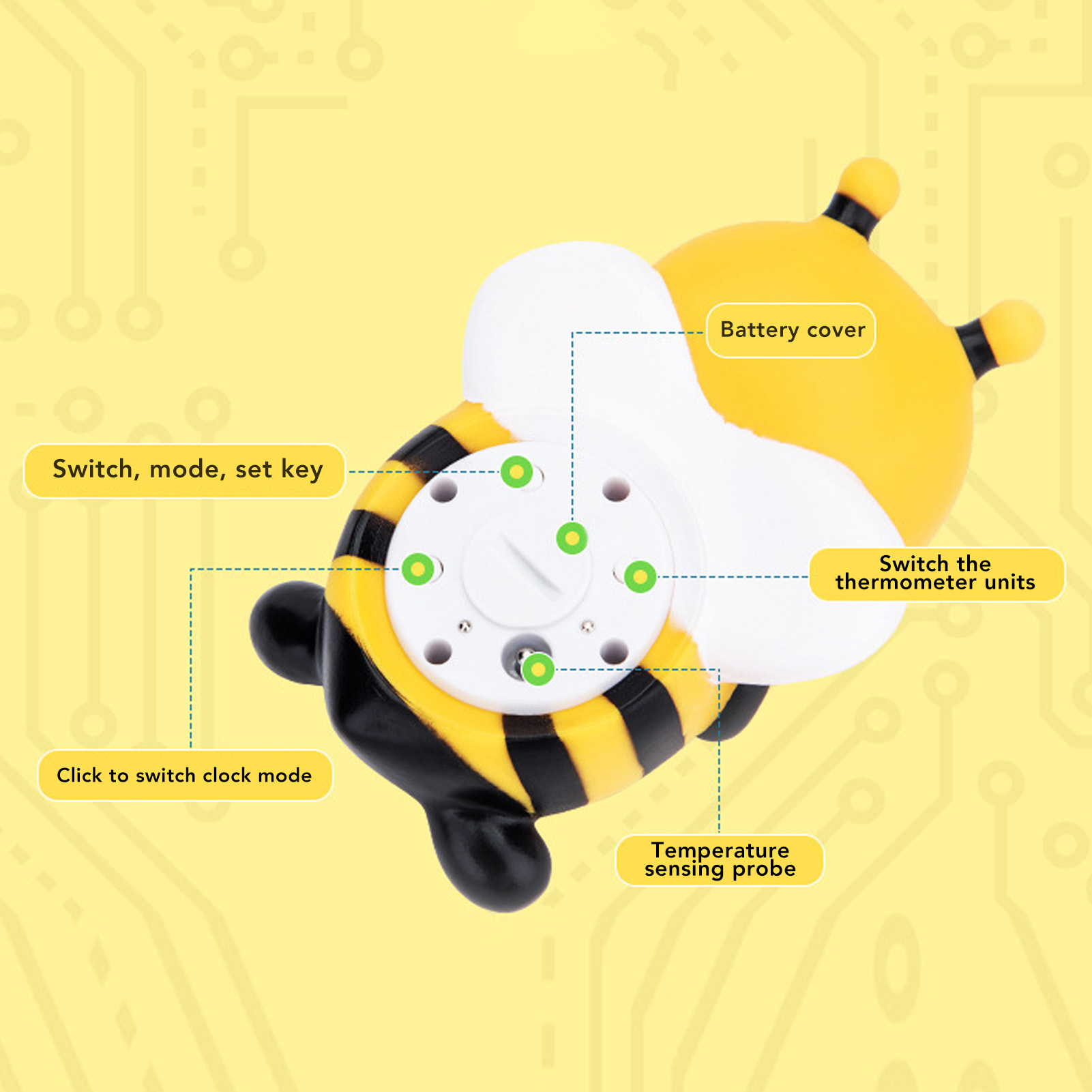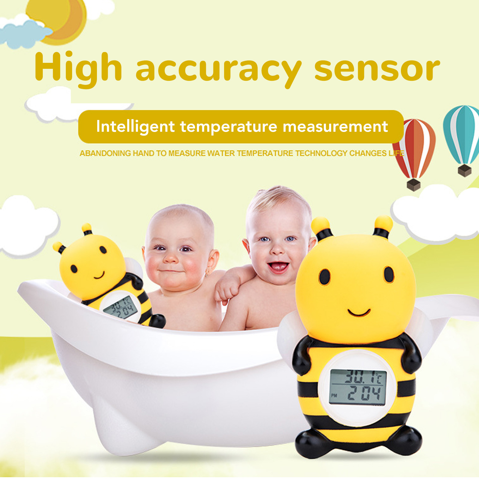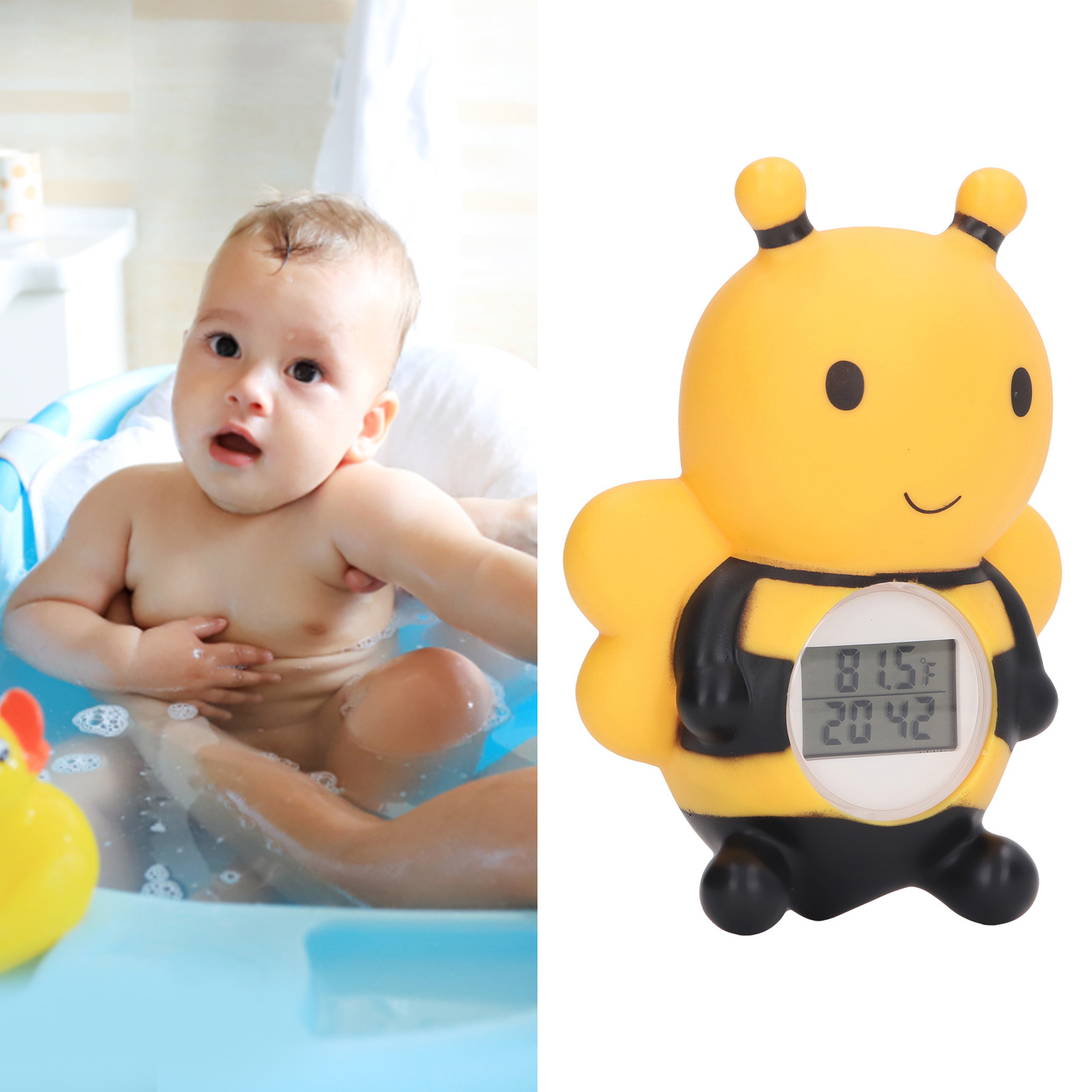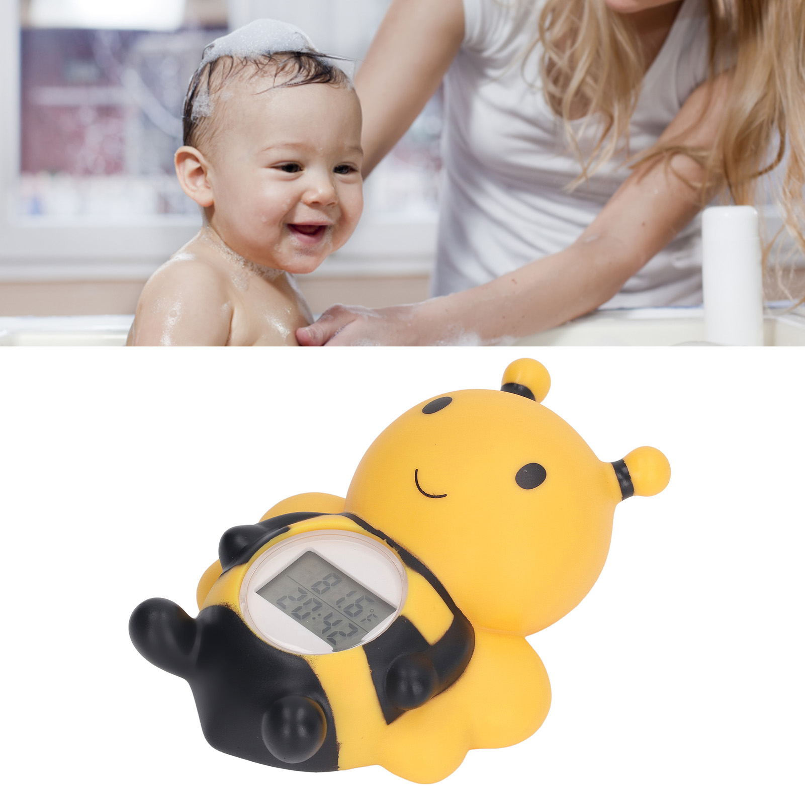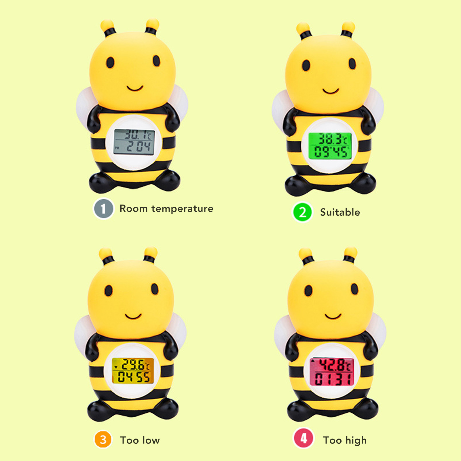 1、Light Remind: Whenever the temperature is too low or too high, the screen of tub thermometer will display "cold" and "hot" and the yellow and red lights will flash. 2、Safety Bathing: With the temperature alarm function, you will be able to easily monitor the temperature of the water, ensuring that your baby is enjoyable and comfortable. 3、Easy To Use: Place bath thermometer in the water and it will automatically turn on, after an hour of leaving the water, it will auto shut off to save battery power. 4、Accurate Sensor: Infant bath thermometer uses premium sensor to measure water temperature quickly, ensuring a suitable bath tub temperature every time. 5、Cute Bee: Baby bath safety water thermometer adopted lovely bee design, cute and beautiful, which can attract your baby attention, making bathtime happier and safer.