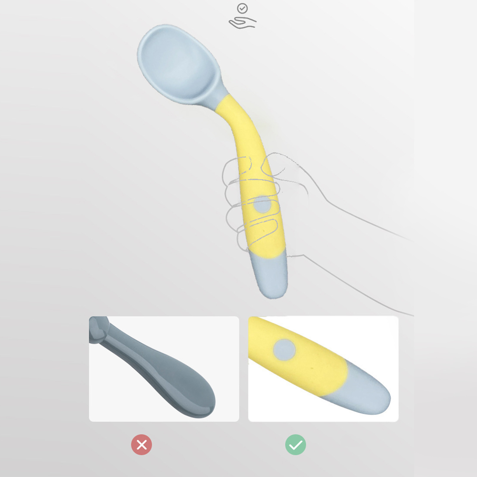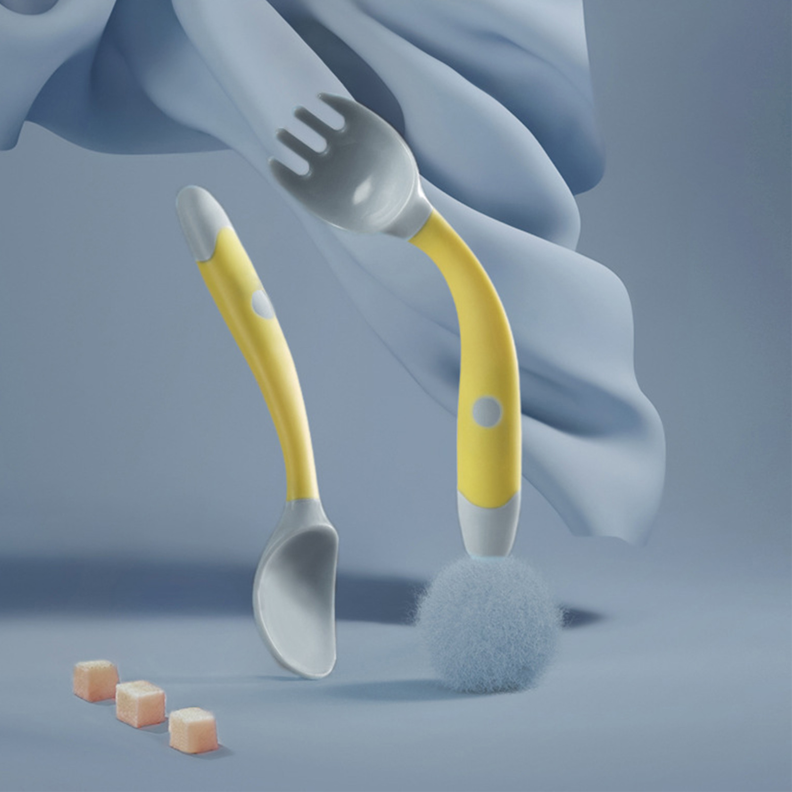 Baby Fork Spoon Set Bent Handles Soft PP Self Eating Training Toddler Feeding Utensils Kit Yellow