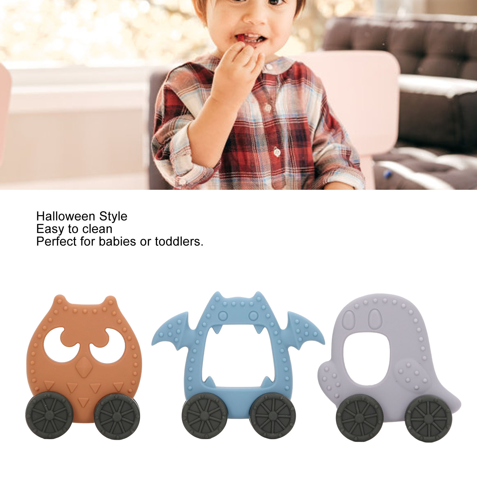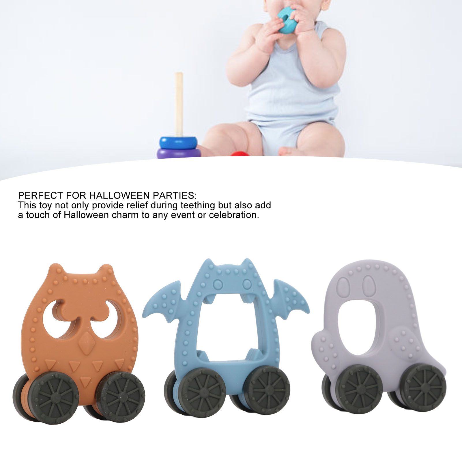 1、CREATION HALLOWEEN DESIGN: Turn teething time into a fun and memorable experience with these imaginative and child friendly Halloween themed teething toys. 2、EASY TO CLEAN: This toy can be easily cleaned using hot water or a steam washing. Simply rinse them under hot water or use a steam to ensure they are free from any harmful dirty. 3、SAFE SILICONE MATERIAL: This toy is made with food grade silicone (similar to pacifiers) and free from BPA. Its material can provide a safe and soothesoption for babies experiencing teething discomfort. 4、SUITABLE FOR BABIES: This toy is designed to be very suitable for both infants and toddlers, providing relief during teething stages, ensuring a safe and enjoyable teething experience. 5、PERFECT FOR HALLOWEEN PARTIES: This toy not only provide relief during teething but also add a touch of Halloween charm to any event or celebration.