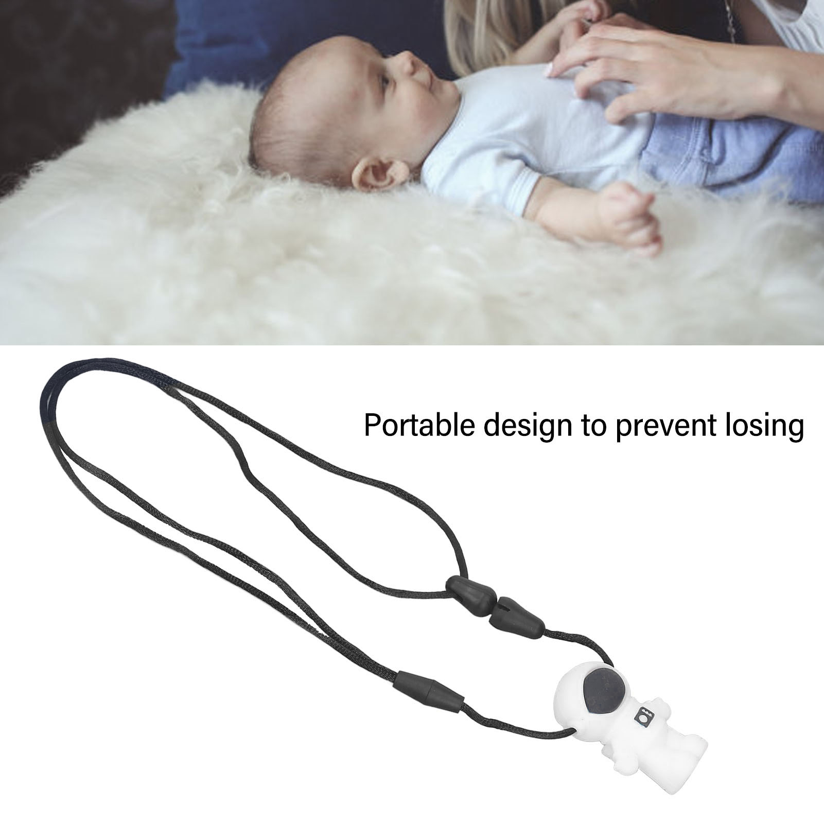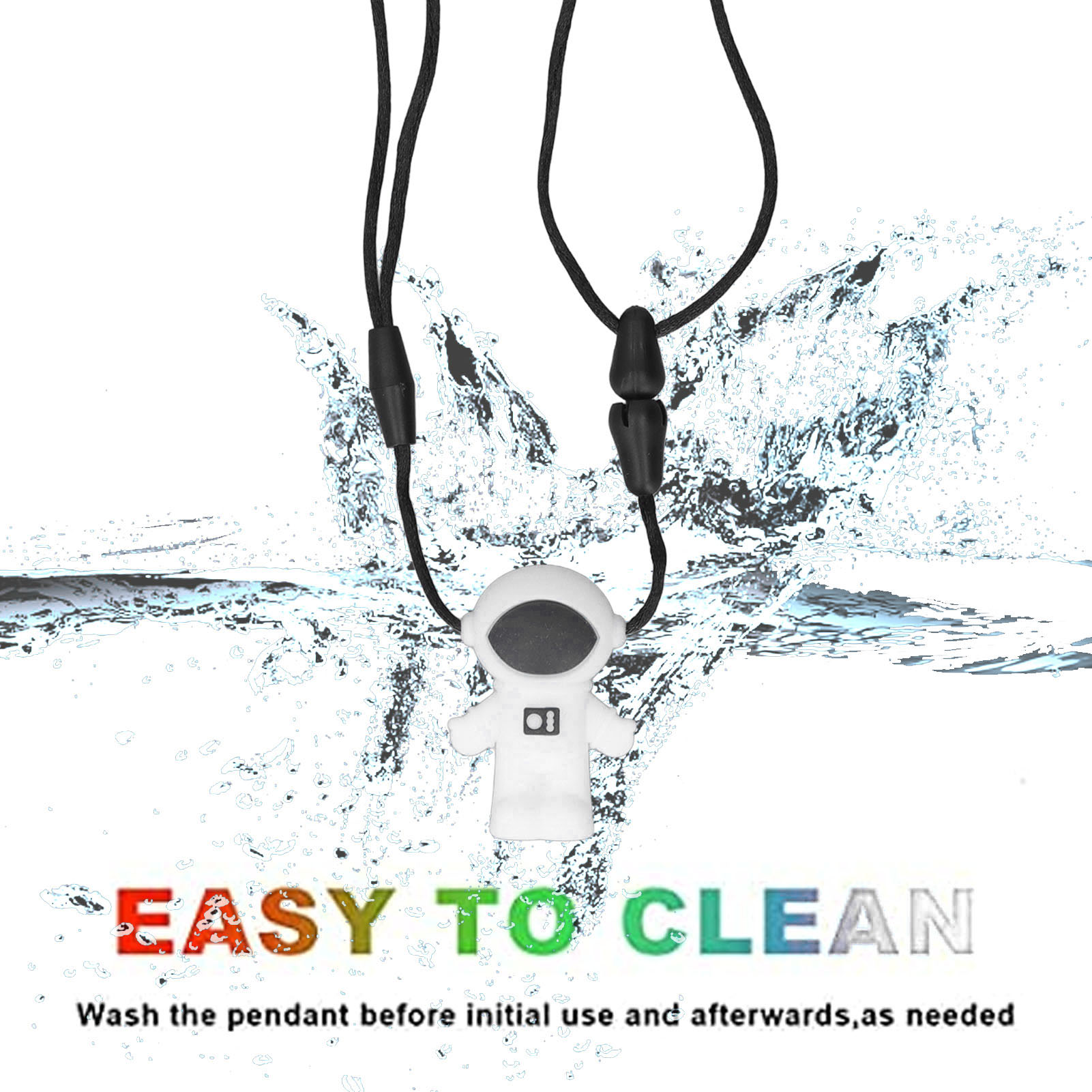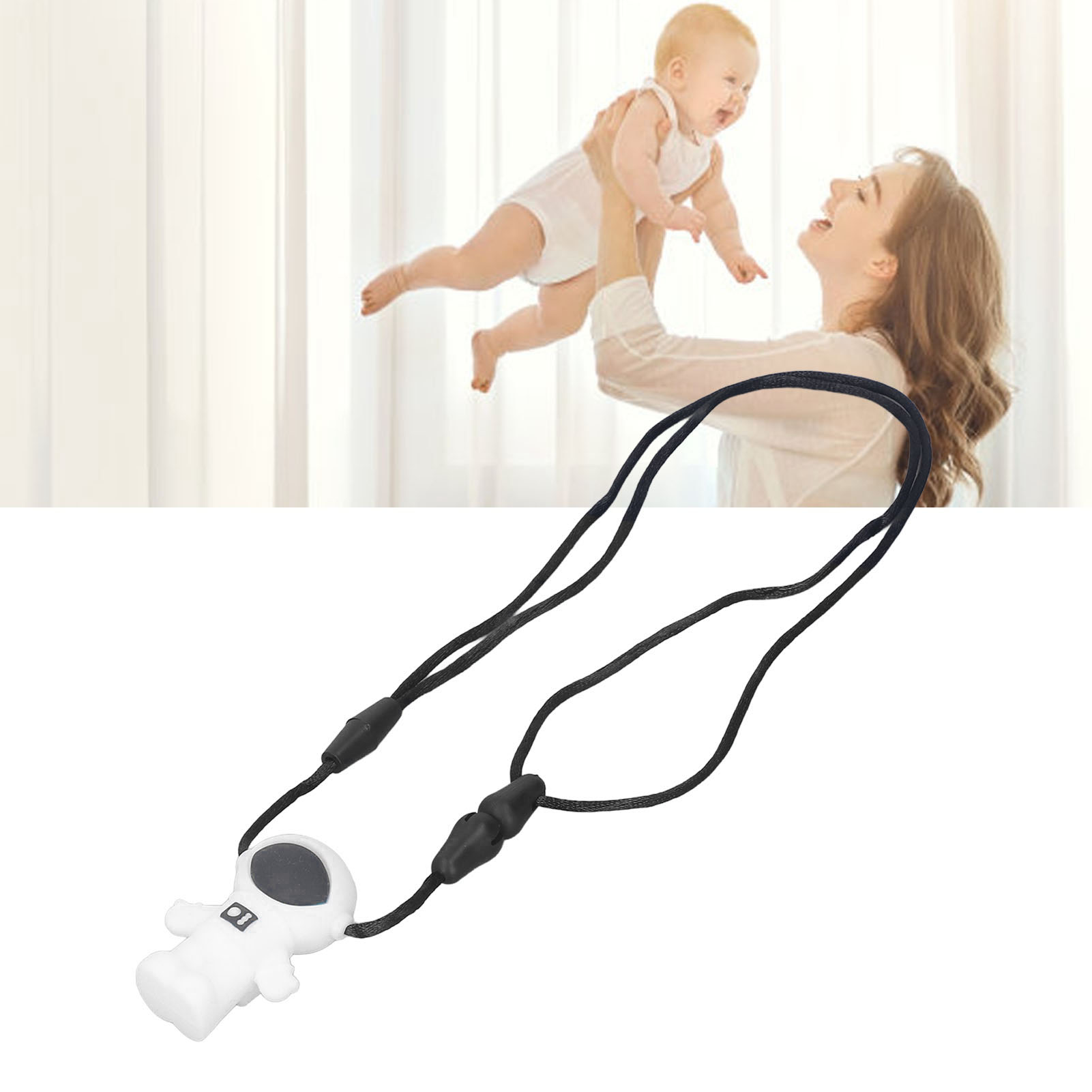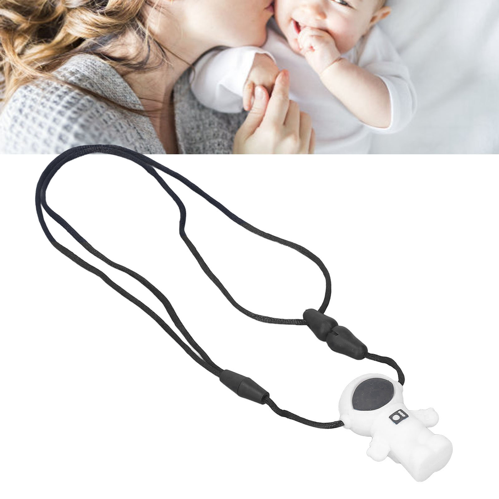 1、GENTLE SOOTHING: This teething pendant fits comfortably on your baby gum and gently relieves teething pain. Beaded edges and multiple chewing surfaces are perfect for massaging sore gums and keeping your baby happy. 2、TEETHING FUNCTION: This teething pendant is a safe chewing choice for baby with sensory needs such as autism, PDD, and ADHD. Instead of biting fingers or chewing clothes, make your child chew on our chew necklace designed for safe chewing. 3、SILLICONE: This baby teething pendant is made of soft silicone material, stretchy and flexible, safe and hygienic, easy to clean, and lightweight. 4、REDUCE ANXIETY: With cartoon spaceman shape, easy to attract baby, can greatly reduce anxiety, promote calm, and provide a safe alternative to chewing on hands, pens, clothing, hard objects, etc. 5、SAFE TO USE: Tasteless, environmental friendly, sanitary and durable, high temperature and low temperature resistance: can be used normally in the range of ‑40 degree centigrade to +250 degree centigrade.
