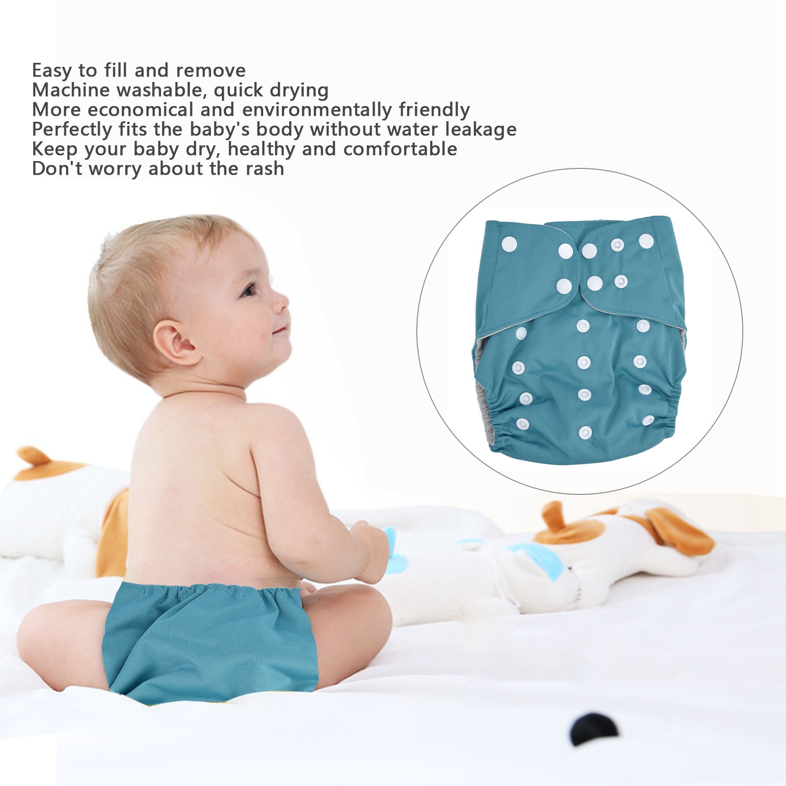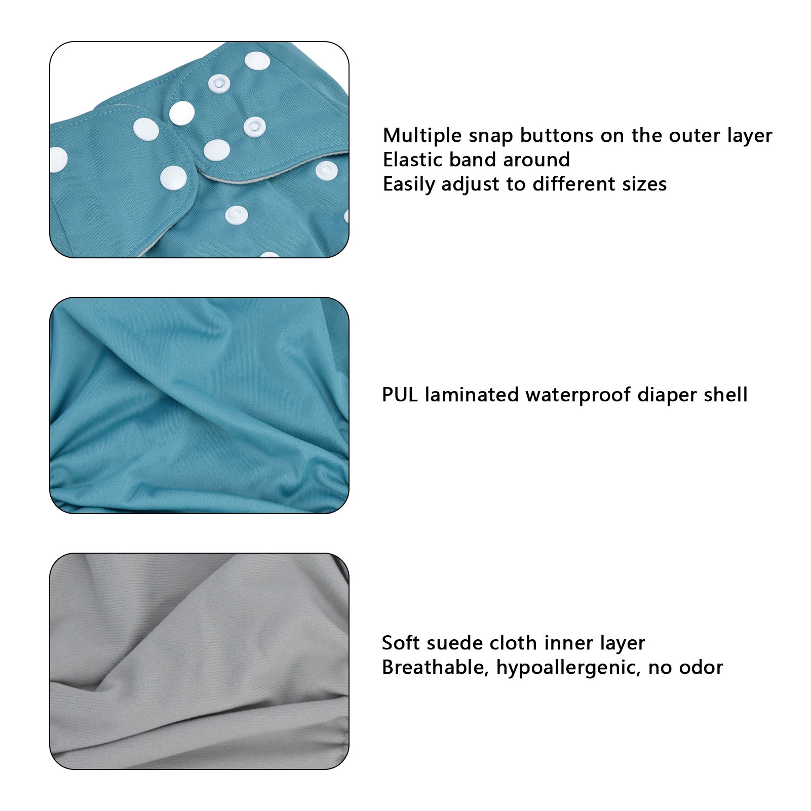1、Our cloth diapers are easy to fill and take out, machine washable and quick drying, more economical and environmentally friendly. 2、The outer layer of the diaper is designed with multiple snap buttons, which can be easily adjusted to different sizes. 3、There are elastic bands around, can grow with baby from 6.6lb to 33.1lb, perfectly fits the baby's body and does not leak water. 4、Adopt PUL laminated waterproof diaper shell and soft suede inner layer, no odor in diapers. 5、Breathable and hypoallergenic, keep your baby dry, healthy and comfortable, there is no need to worry about the rash.