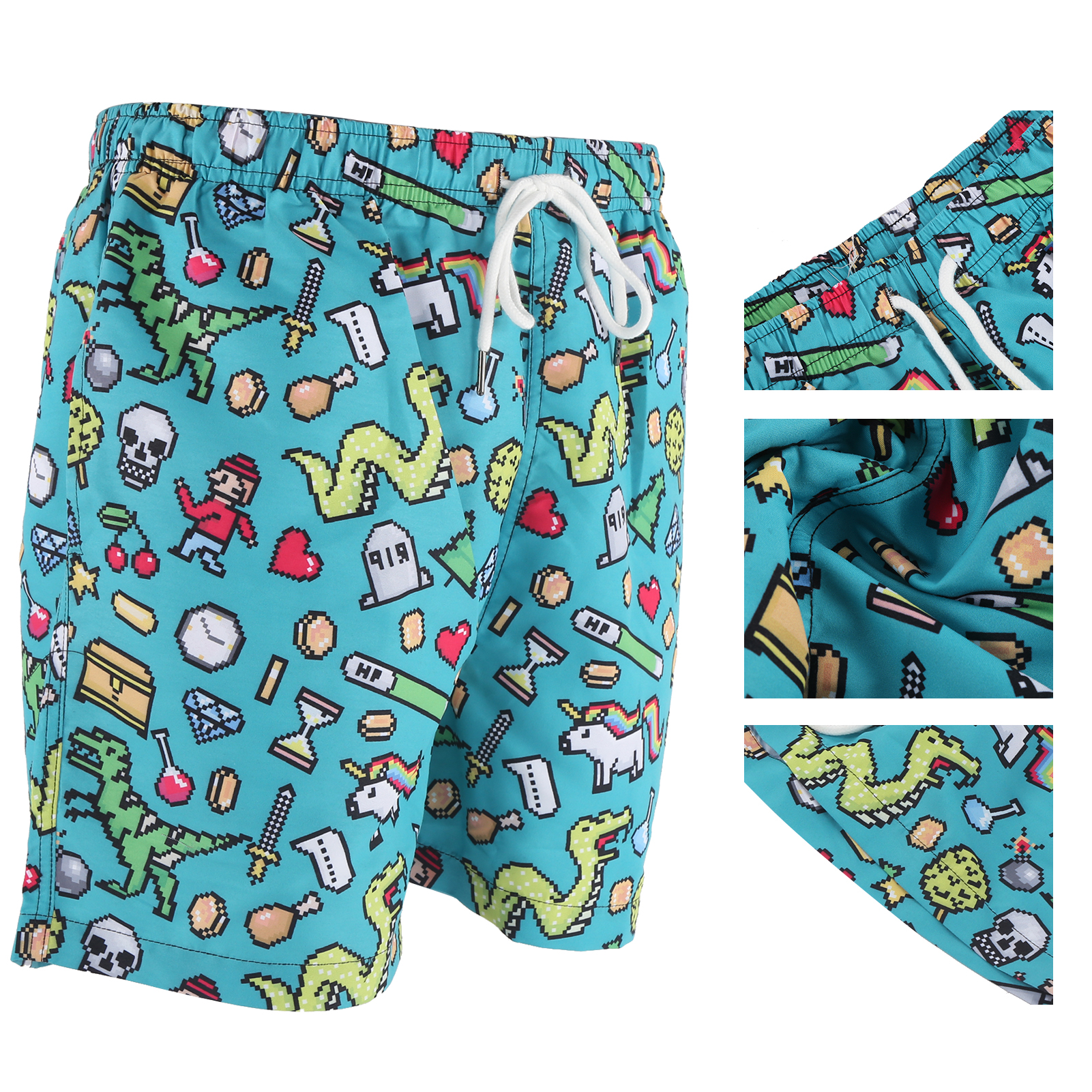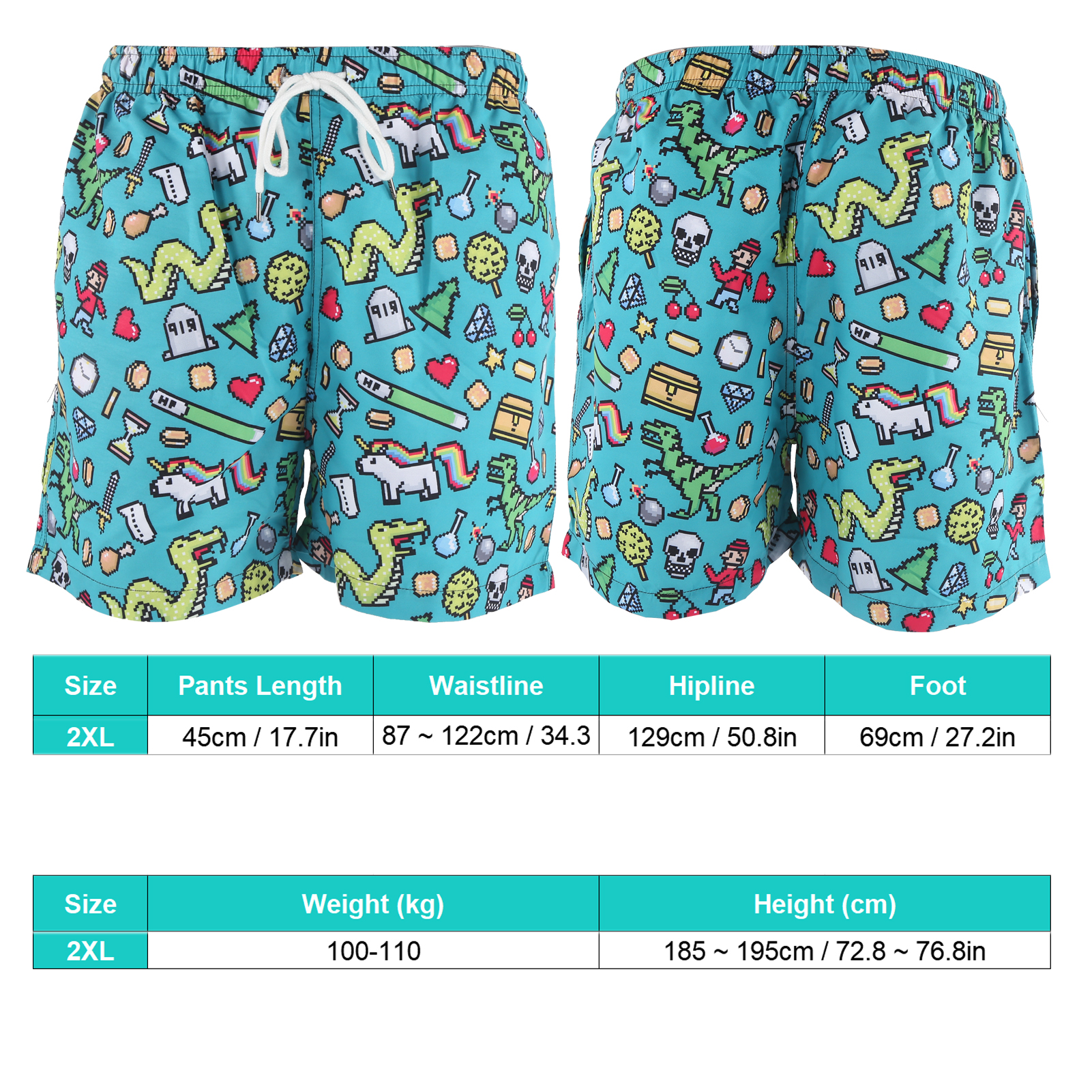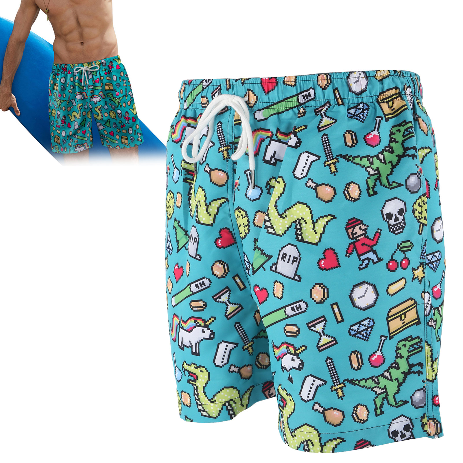 1、Lightweight, skin‑friendly and quickly dry, it features UPF 50+ sun protection, blocking 90% of sunlight and ultraviolet rays. 2、Designed with funny patterns, elastic waistband, drawstring, breathable mesh lining, and two pockets on both sides. 3、Adjustable drawstring easily fits your needs and waist line, convenient to put on and take off. 4、The shorts is not easy to tear, tough and durable, can withstand greater pulling force with double sewing thread. 5、Suitable for water sports, walking, running, swimming, surfing, hanging out on the beach or at home, etc.