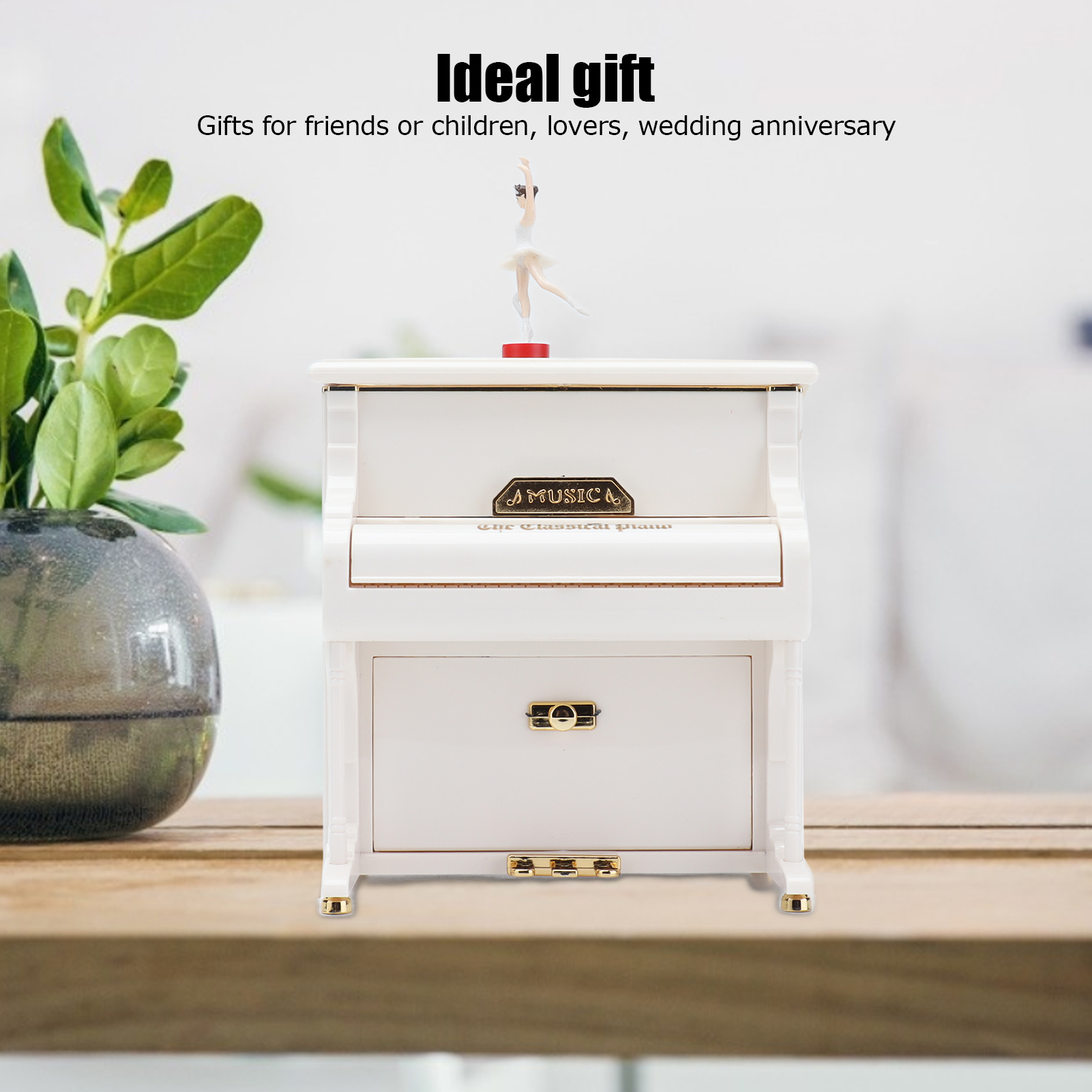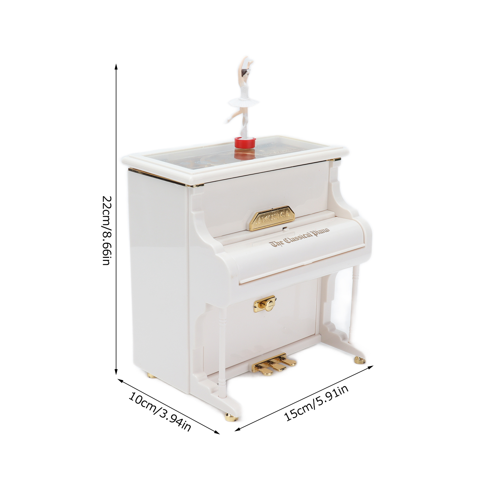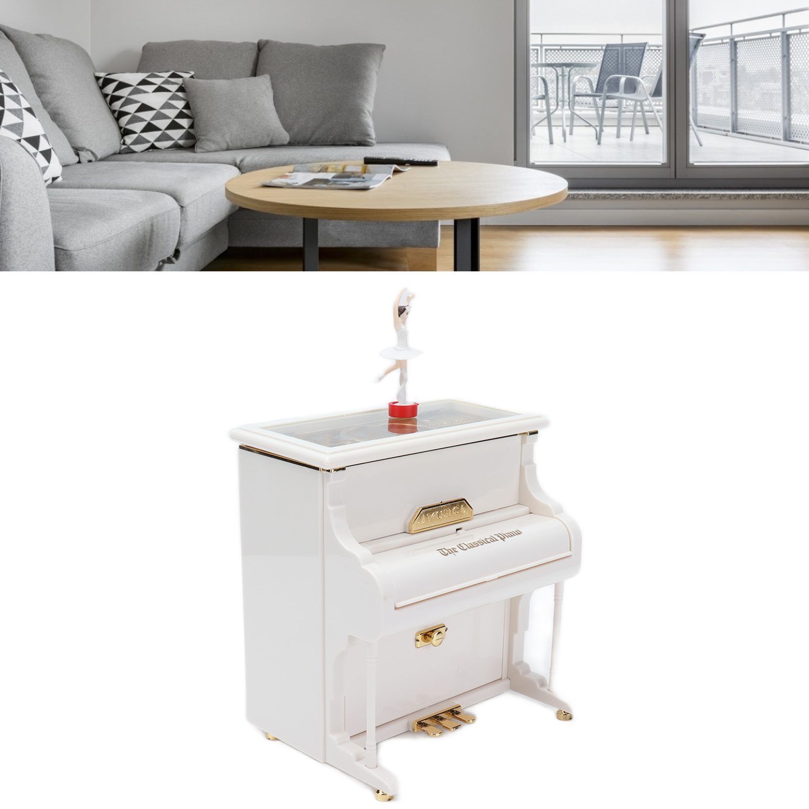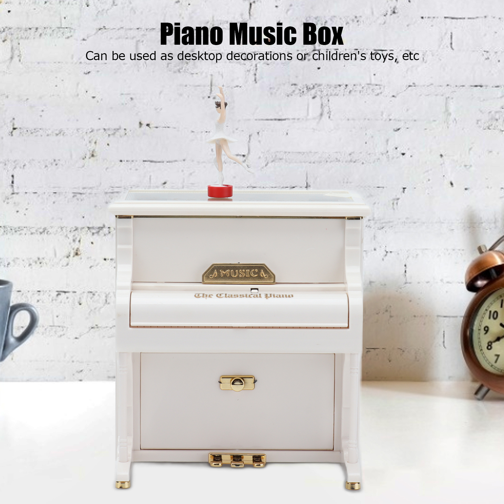 1、Mechanical Music Box: No batteries, turn the spring, the ballerina will rotating slowly, and you will hear soft music. 2、Exquisite Workmanship: Beautiful ballerinas dance on pianos with black and white keys, graceful and delicate. 3、Multifunctional: Piano music box can also be used as desktop decorations,friend or holiday gift and children's toys, etc. 4、Excellent Material: Piano shell is made of high quality ABS material, wear resistant and durable, not easy to damage. 5、Ideal Gift: Perfect adorable gift for kids or lover, for Wedding, Anniversary, Children's Day, Valentines day, baby shower, Christmas, etc.