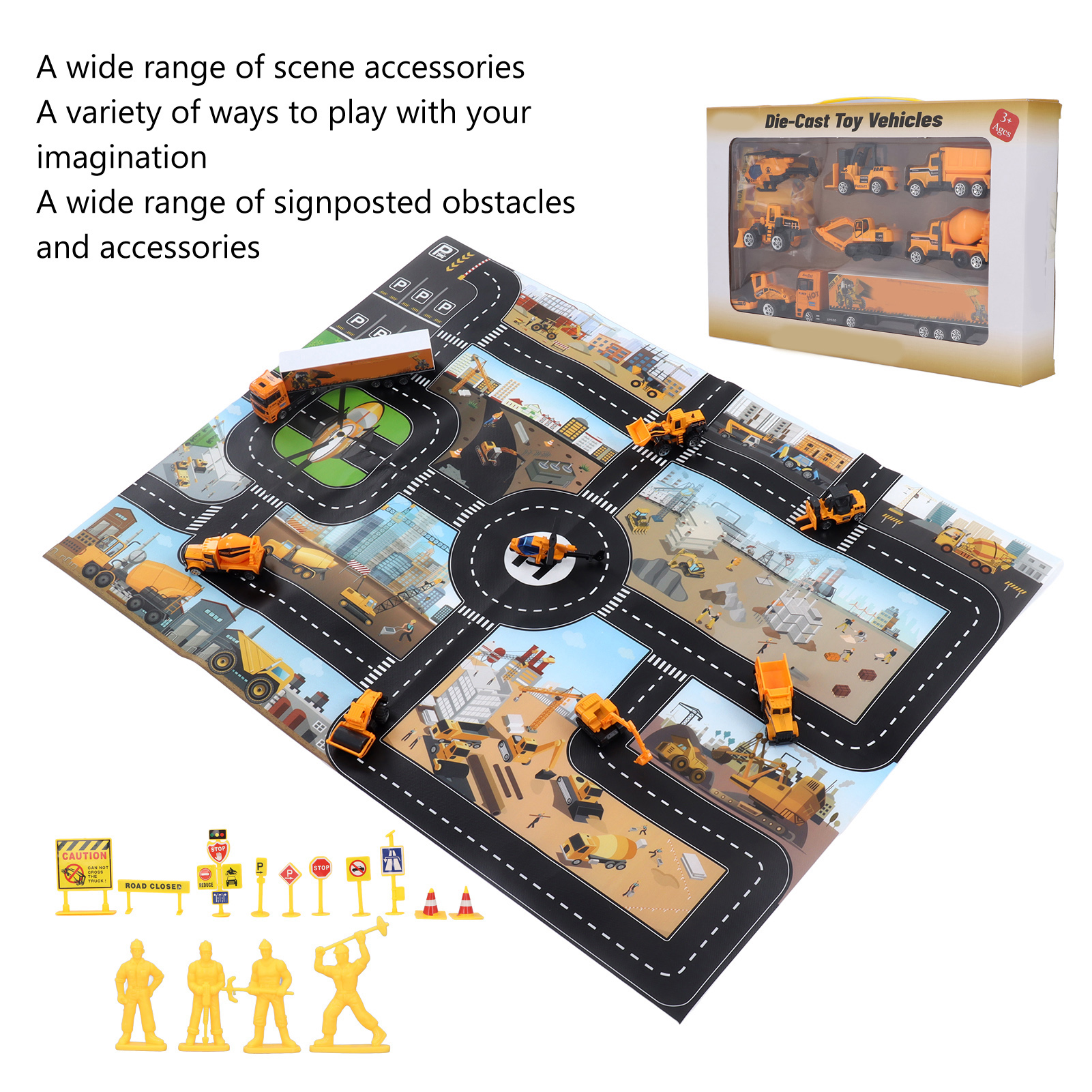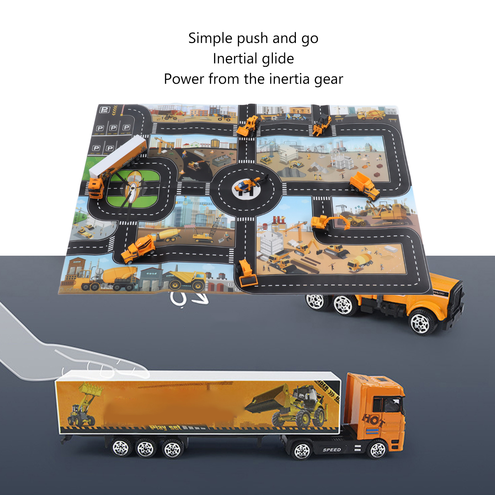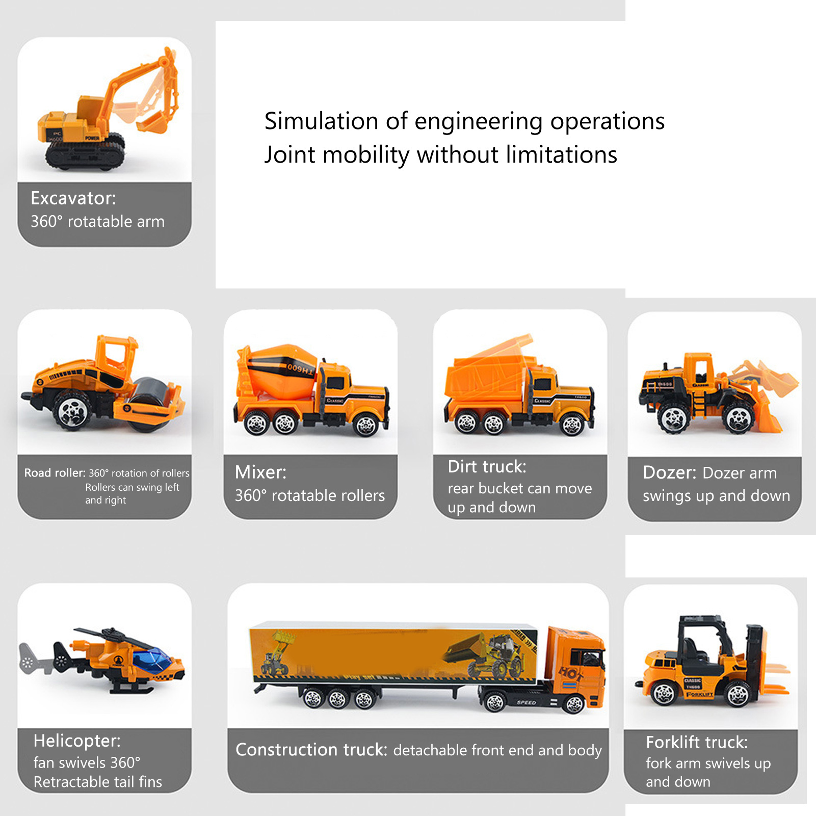 1、CONSTRUCTION VEHICLE SIMULATION TOYS: Use different kinds of trucks and lifelike simulations of construction site scenes. Create a new world of engineering for children to explore freely. 2、RICH ACCESSORIES: The engineering vehicle playset includes a wide range of signposted obstacles and other scene accessories for imaginative play. 3、EASY TO OPERATE: The construction site vehicles toy set simulates the operation of engineering, with no limitations on joint movement. Inertial glide, simple push and go. 4、EDUCATIONAL TOYS: Kids engineering truck playset develop key early education skills. Exercises children's thinking skills, creativity as well as shape recognition, object identification, creativity and hand‑eye coordination. 5、SAFE MATERIALS: The construction vehicle truck toy set is made of high quality alloy and ABS, sturdy and durable, corrosion resistant, with burr free edges, safe and reliable.