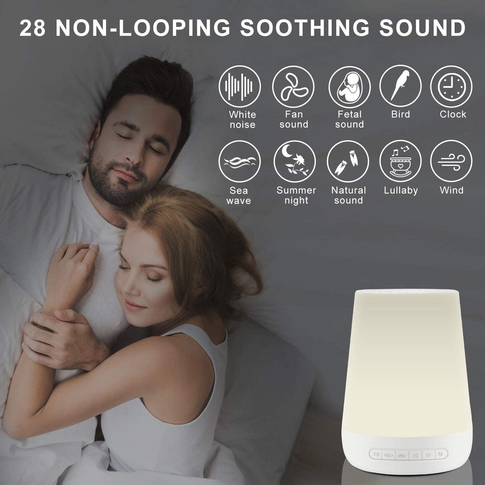 1、【Portable Sleep Sound Machine】Compact and lightweight sleep sound machine can be placed on bedside table or office desk. You can also take it with you when go out for camping, traveling, etc. Also a good decoration for home or office. 2、【28 Soothing Sounds】Built in 28 soothing sounds, including white noise, fan sound, bird sound, ocean wave, lullaby, and so on, which helps block disruptive environmental noises and let baby fall asleep easier and deeper. 3、【Colorful Night Light】Supports various colors night light with adjustable brightness, which can fix color or change color in cycle. Soft night lights that won\u0027t irritate babies or disturb their sleep, a good helper for midnight feeding.
