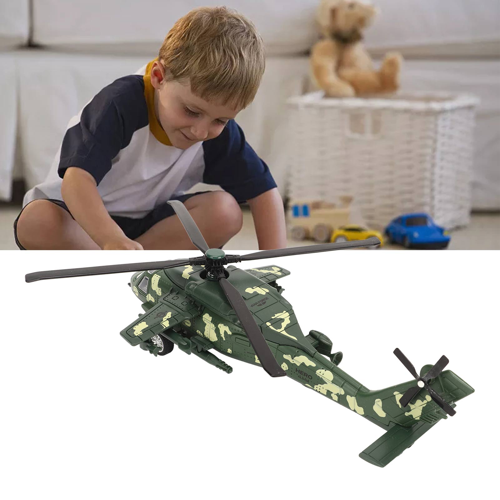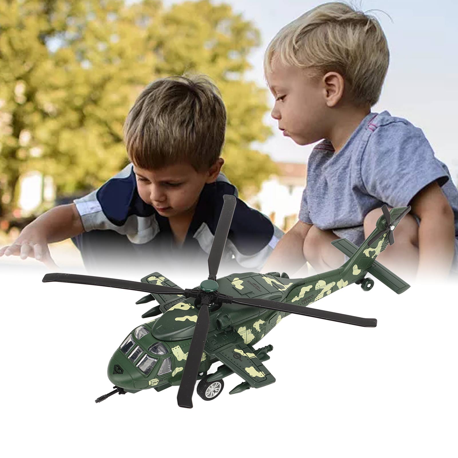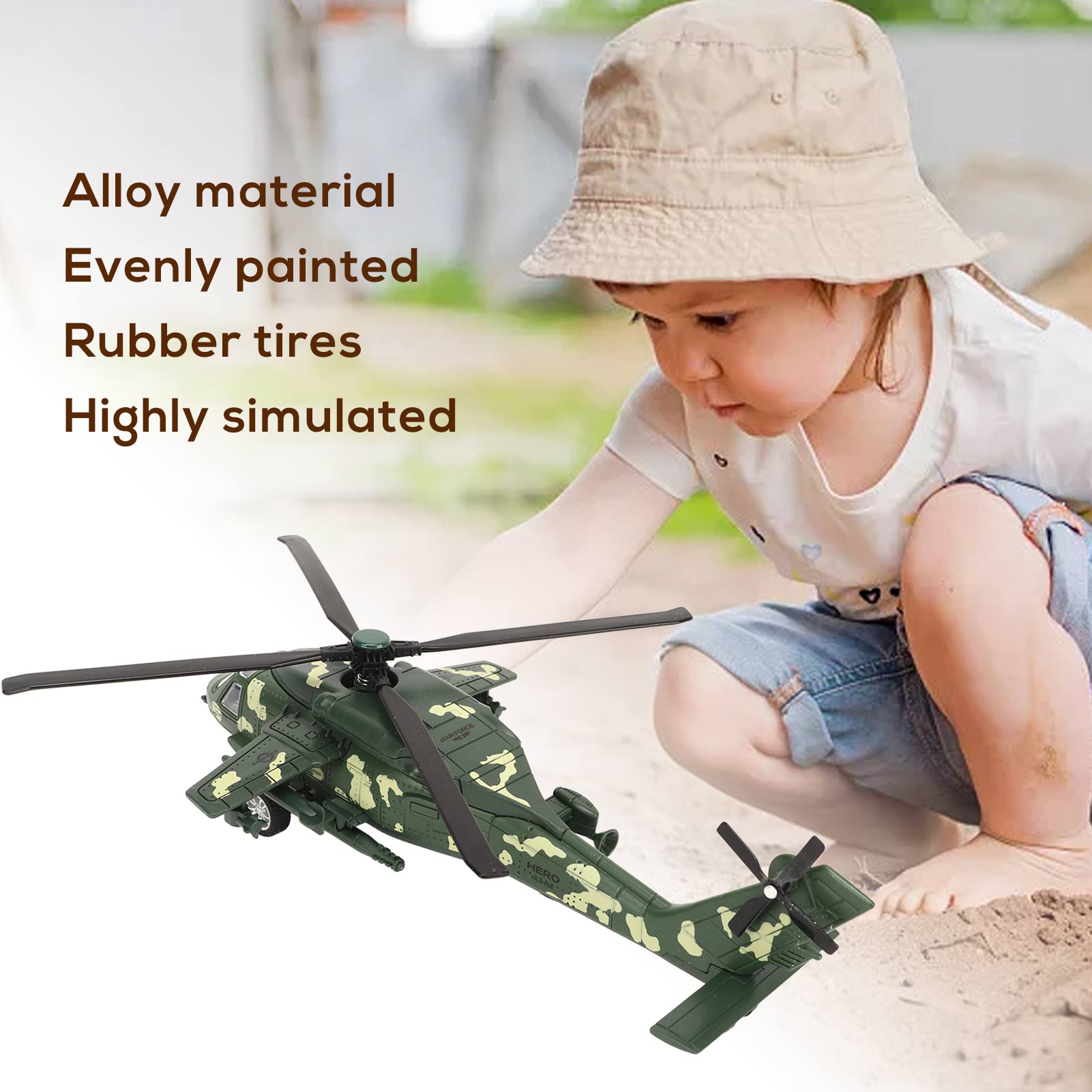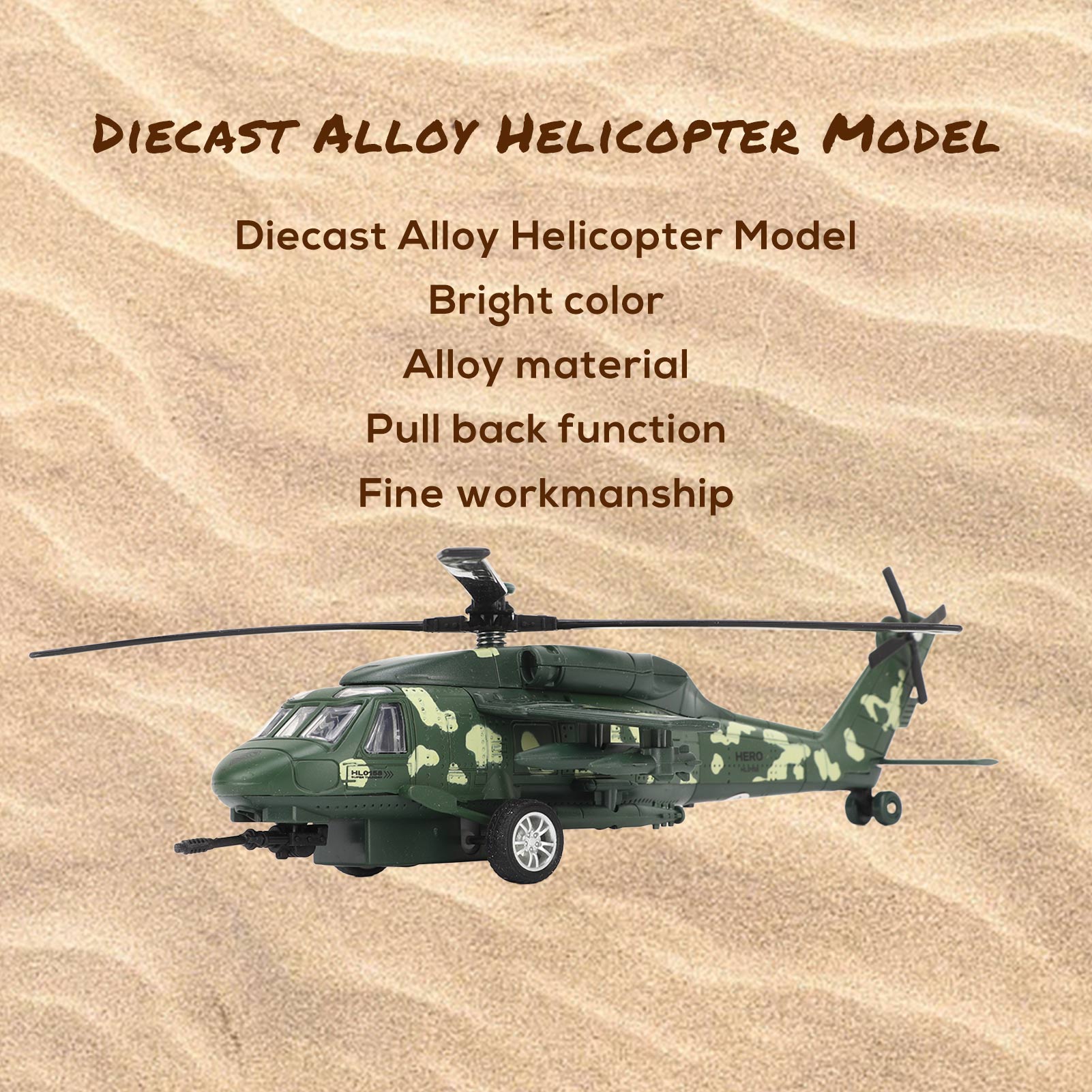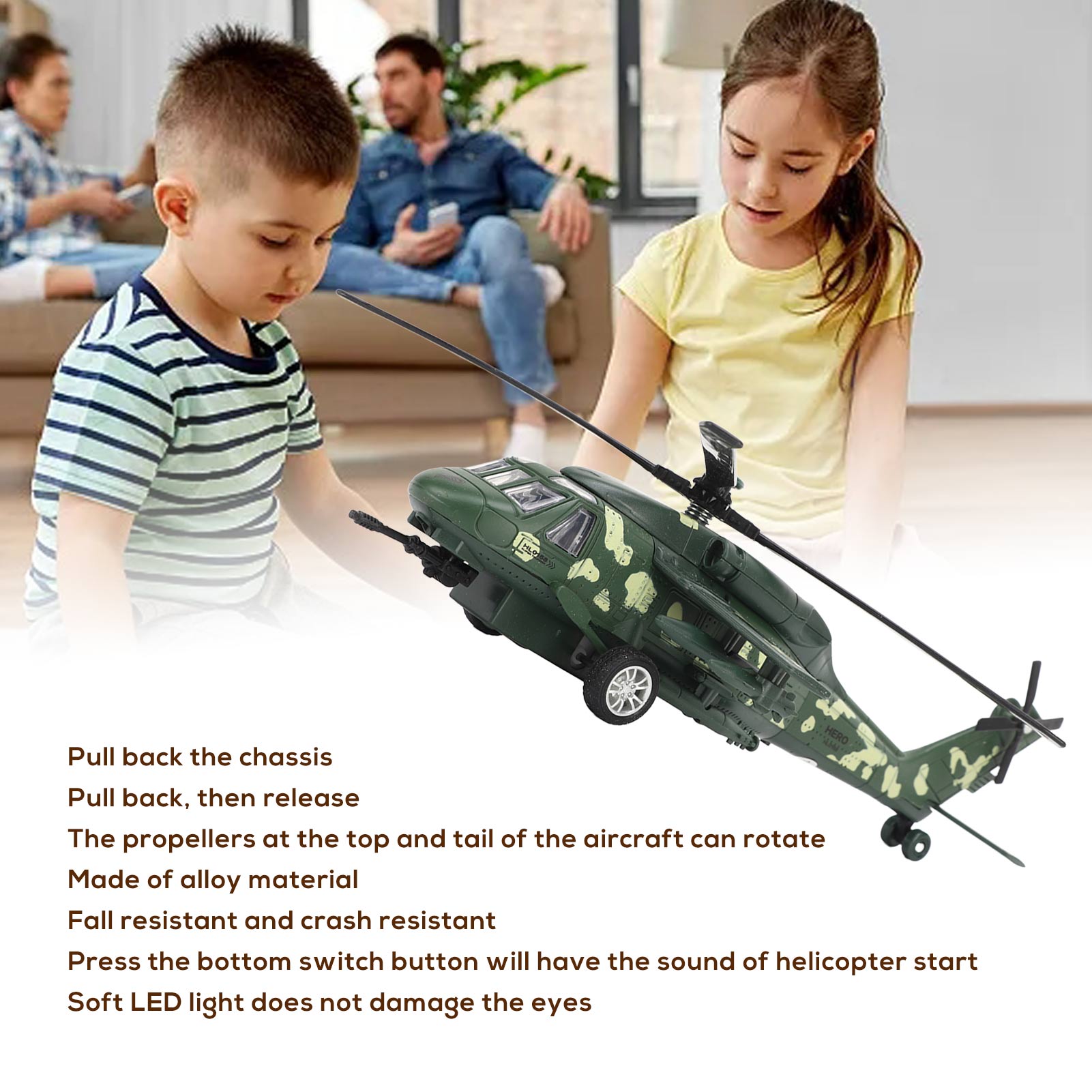 1、PULL BACK: Friction powered design, just pull it back and let it go forward naturally, which are perfect for boys and girls above 3 years old. 2、SOUND LIGHT: Diecast helicopter model will produce lights and sounds when you turn on the power button, which adding to the excitement of playtime. 3、FINE WORKMANSHIP: Complete with engraved lines, whether it is the wings, propeller, cockpit or tail, this helicopter model strives for a realistic look. 4、PERFECT GIFT: Fighter helicopter model can be used as a beautiful decoration for office and home. You can also give it as a gift to kids or model collectors. 5、ALLOY MATERIAL: Aircraft model is made of alloy material, which is not easy to rust, more colorful and solid, with a perfect metal texture.