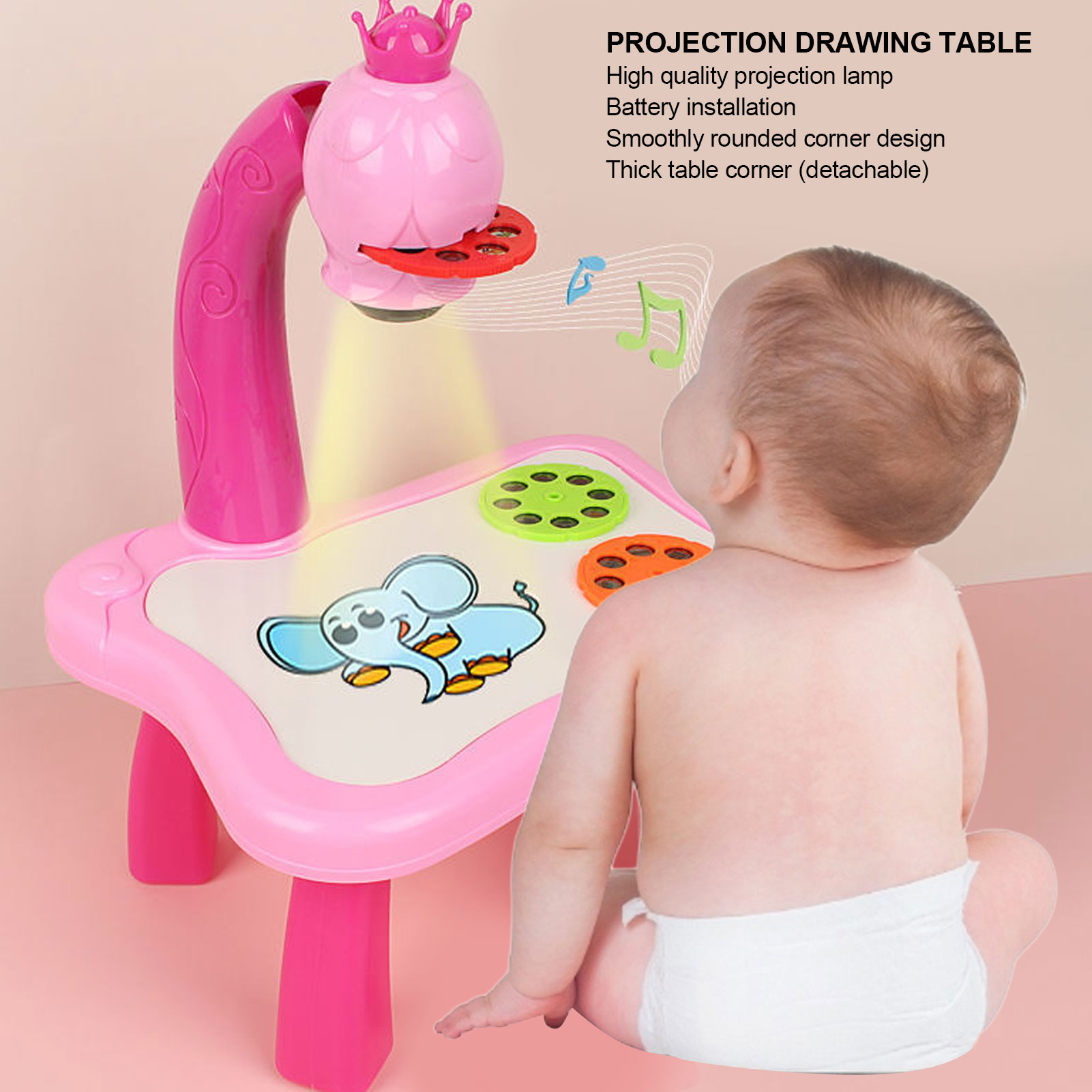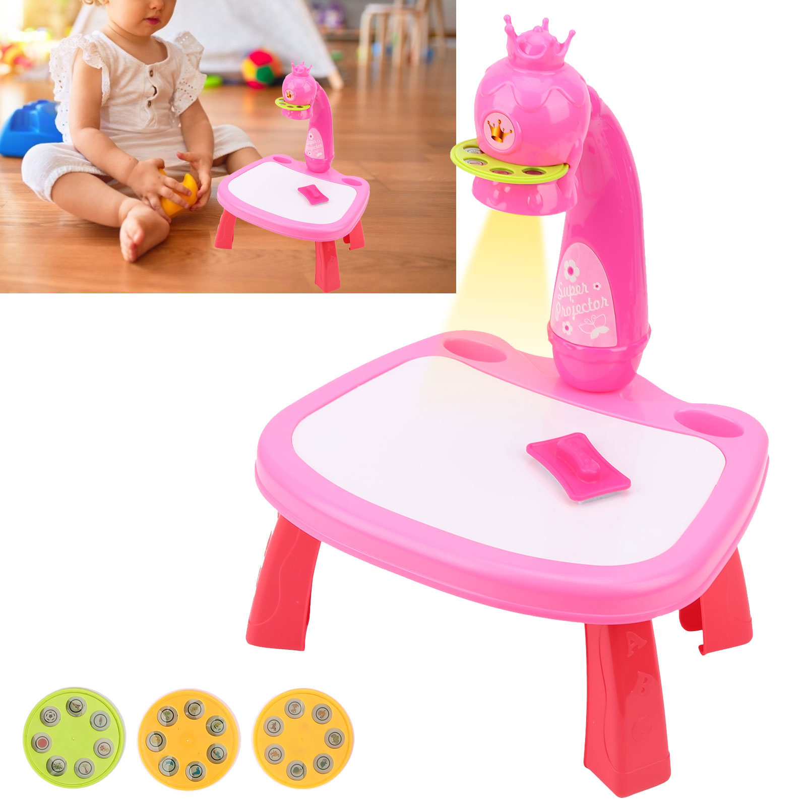 1、Children can draw based on a pattern projected by the projector on a table or picture book. 2、Includes 3 projection slides with 8 different patterns per slide (total of 24 patterns). 3、Music function can attract children and make them stay longer to write and paint and arouses his curiosity about color. 4、Develop color perception and imagination ability and increase the baby's interest in painting. 5、Training hand, eye and heart coordination and can be nice toy and gift choice for children.