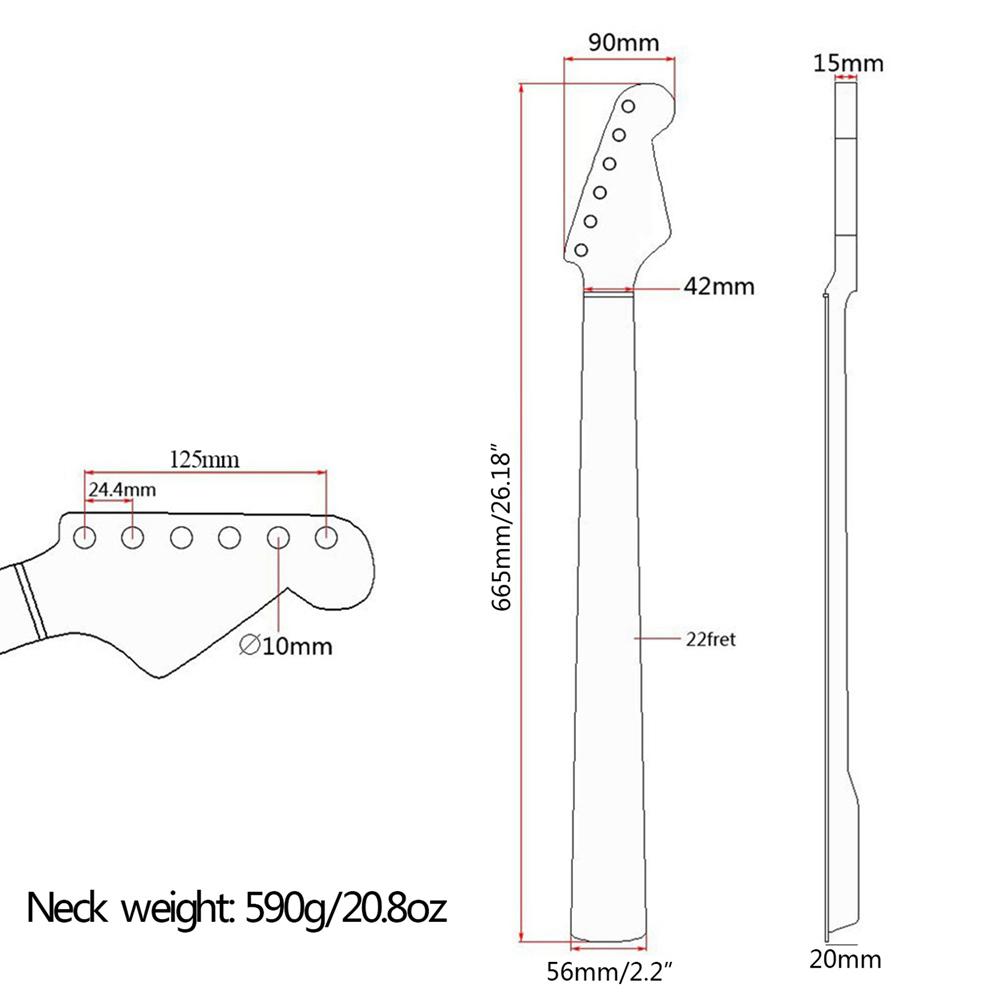 1、1. This guitar neck is compatible for Fender ST-style electric guitar neck replacement. 2、2. High-quality maple neck, delicate and unique. 3、3. Fingerboard with 22 frets, smooth and high density. 4、4. Adjustable truss rod has been installed at the headstock. 5、5. The hole for the tuning machine is 10mm in diameter.