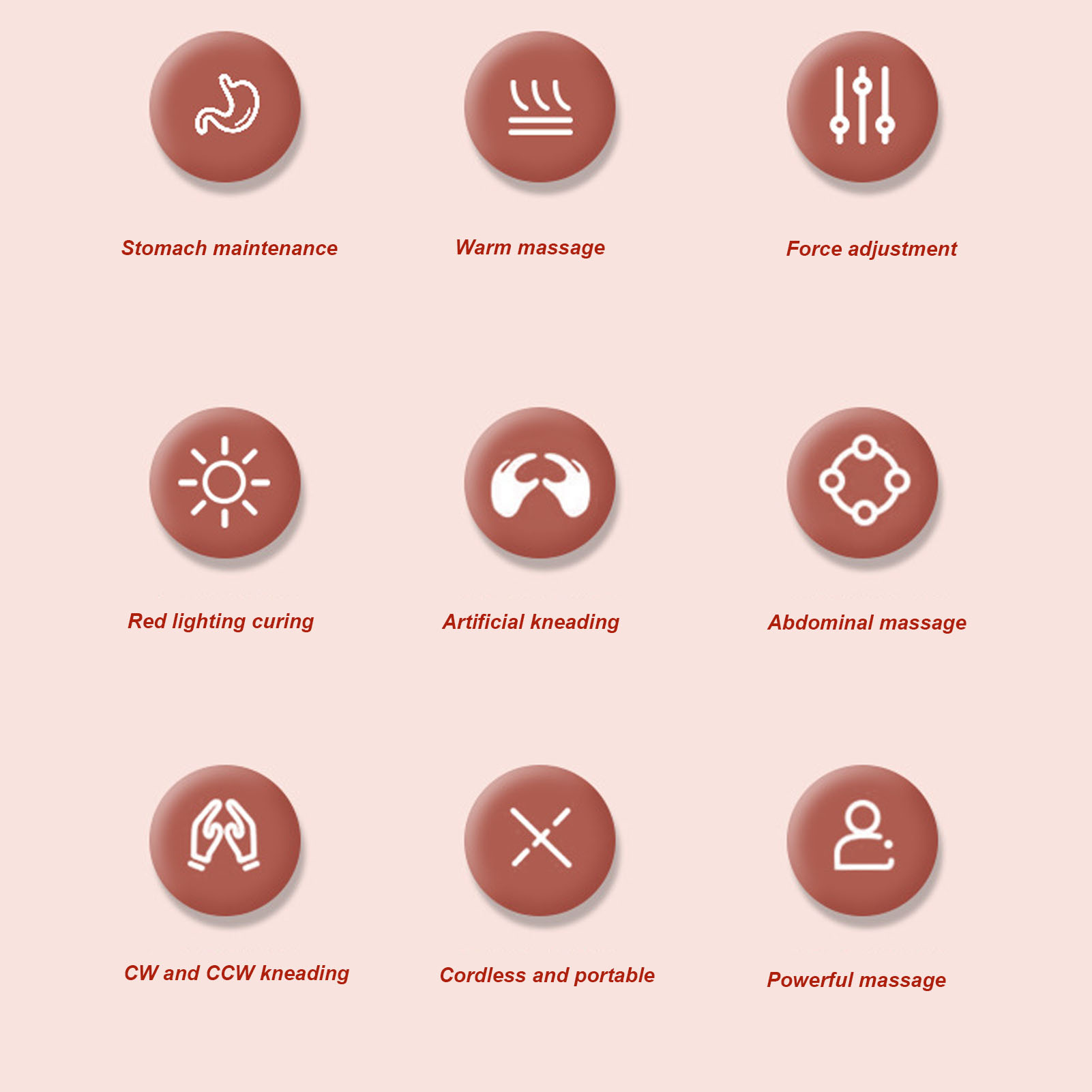 1、Automatic Kneading: Handheld body massager adopted electric design, it can automatically knead the abdomen, promote intestinal peristalsis, and relieve menstrual discomfort. 2、Warm Compress: Handheld body massager built in heating function, provide hot compress on abdomen, provide comfortable massage to you and help to relieve abdominal discomfort. 3、Improve Circulation: Electric stomach massager adopted multi functional design, can be used as a body massager, which can relieve muscle fatigue, and promote body circulation. 4、Portable: Electric handheld body massager adopted cordless operation design, easy to carry, can be used anytime and anywhere, without connecting to the power supply after charging. 5、Convenient Operation: Cordless electric body massager adopted compact size, which can provide a comprehensive abdominal care experience with comfortable and easy operation.