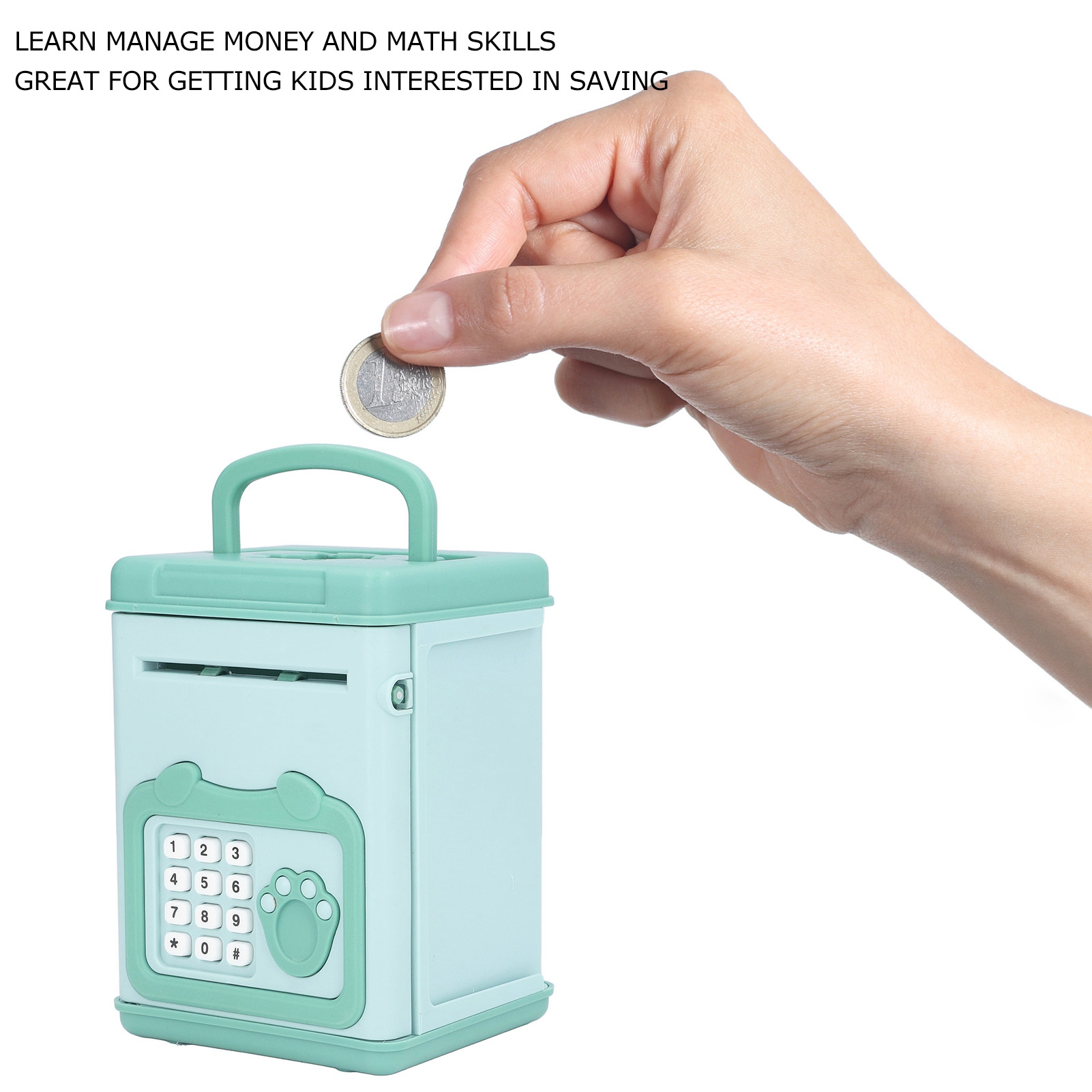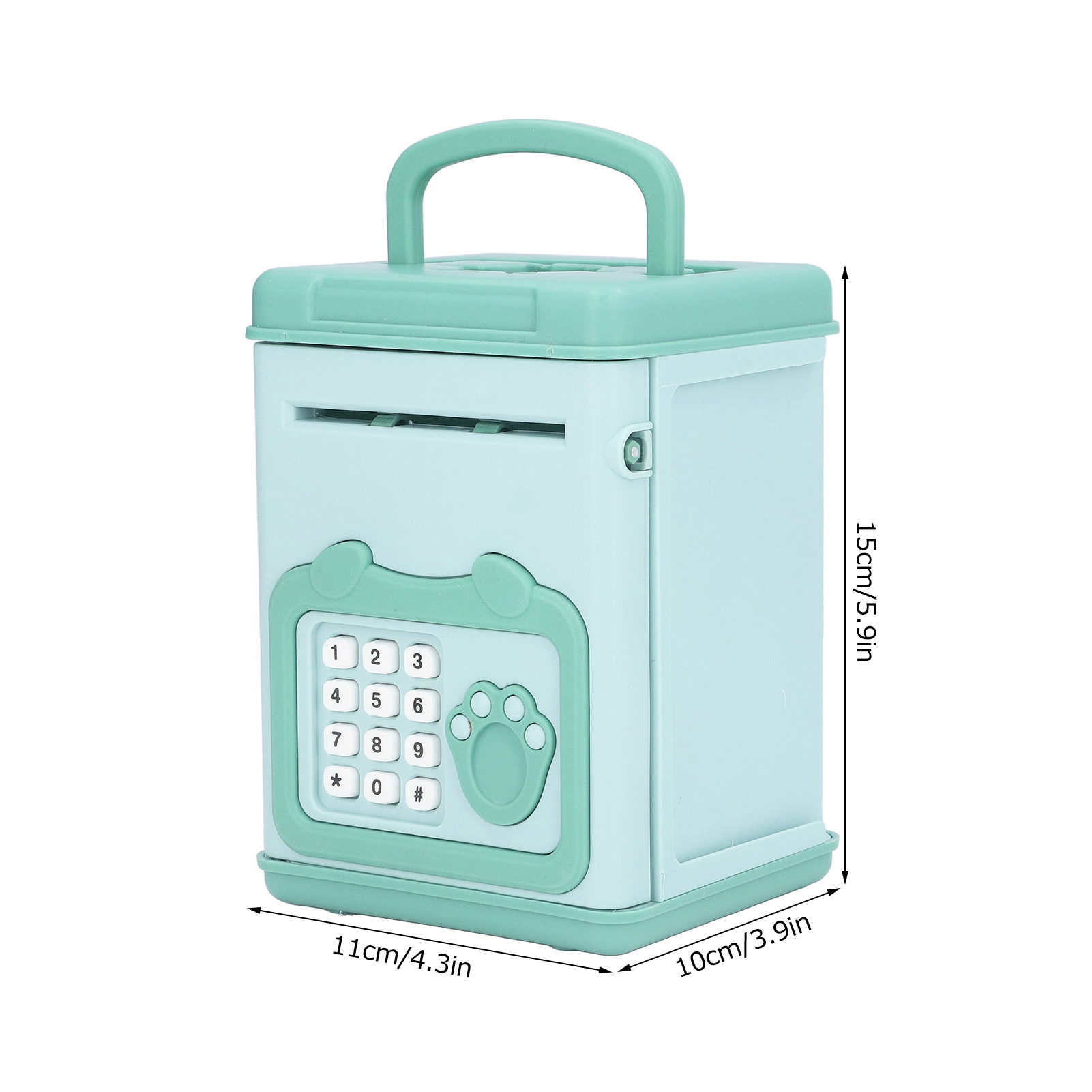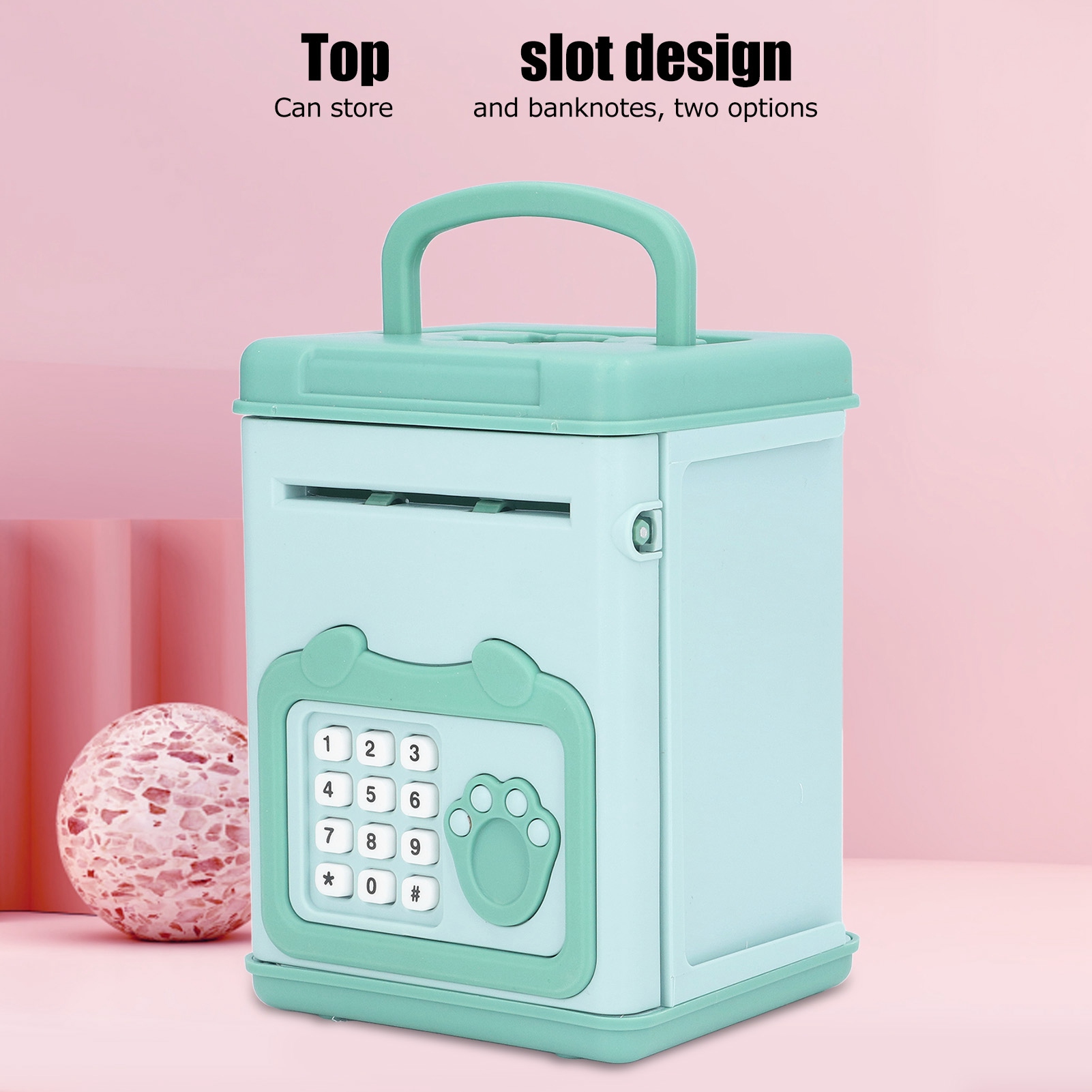 1、Auto Scroll Paper: Put the banknotes into the cash box, trigger the induction device, and the cash will automatically roll in. 2、Top Coin Slot: Cute money bank top coin slot design, can store coins and banknotes, two options to meet your different ways of saving money. 3、Handle Design: Money bank handle design, easy to carry, easy to carry, the initial password is 0000, the password will be restored to the initial password when the battery is too low. 4、Manage Money: Kids bank is great for getting kids interested in saving. Kids can have their own little safe while learning financial and math skills from it. 5、Interactive Banking: Teach your kids money management with our amazing electronic piggy bank! Easy to use and fun, this interactive bank is your child's first step towards financial independence.