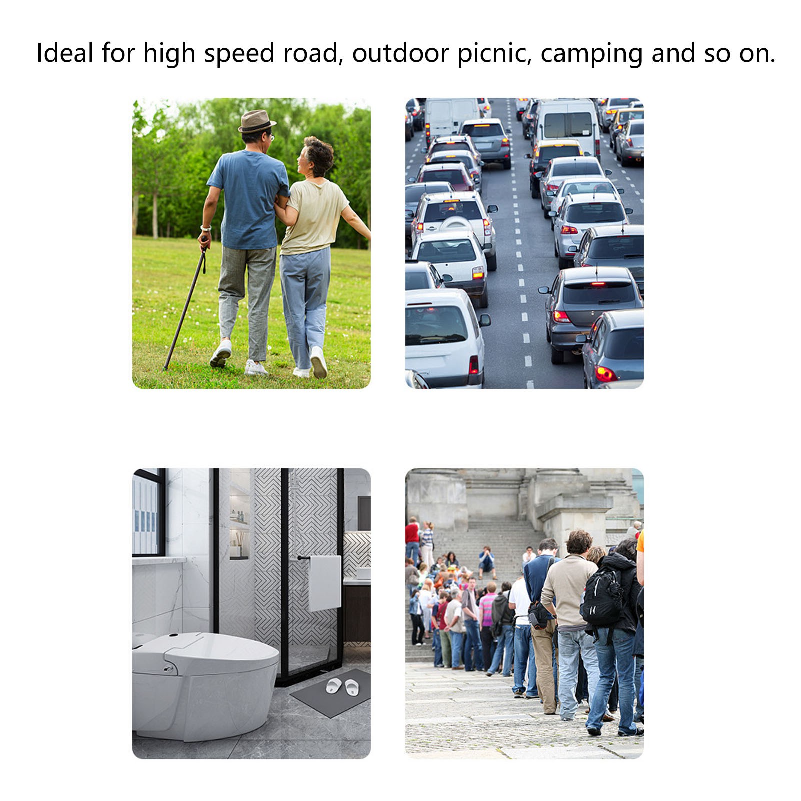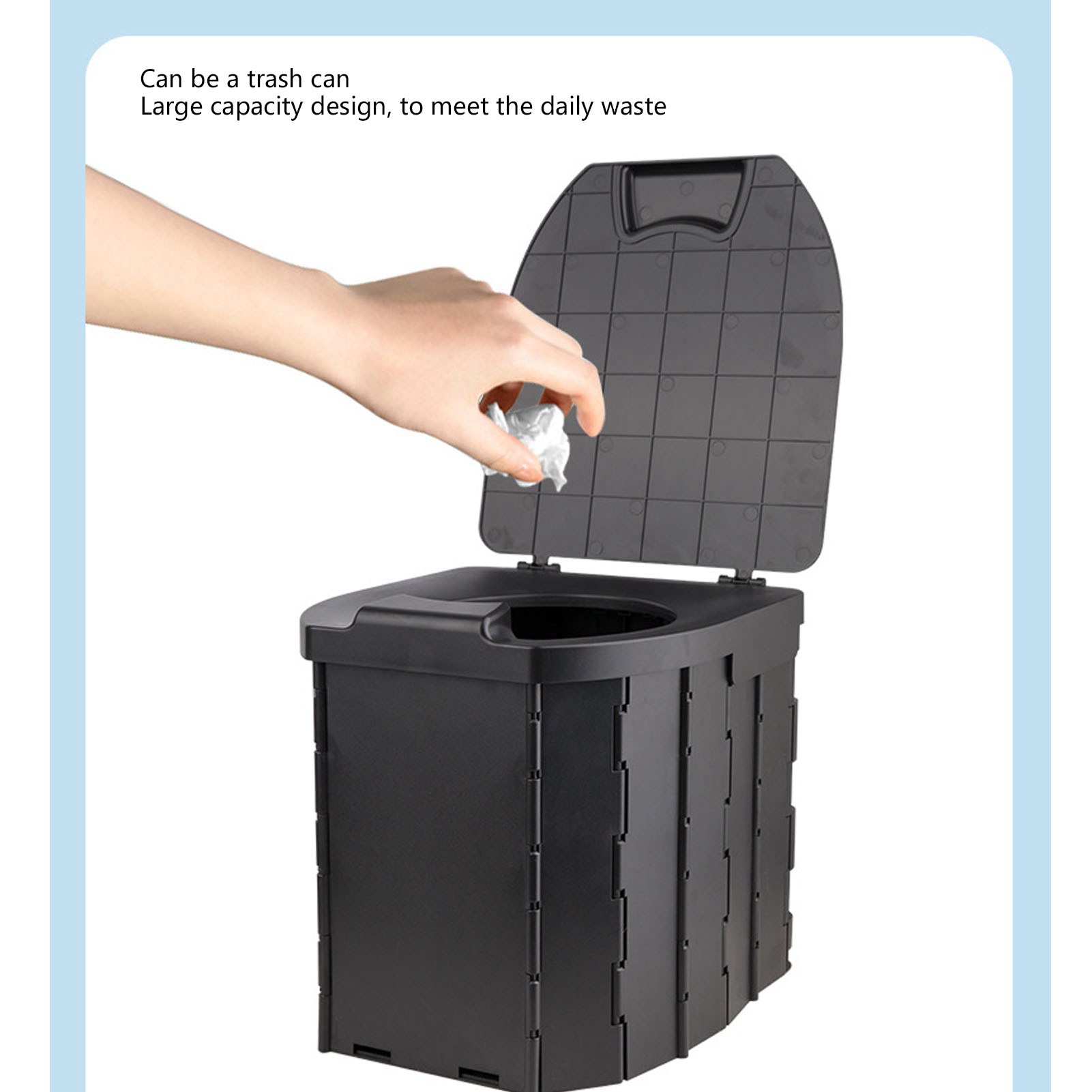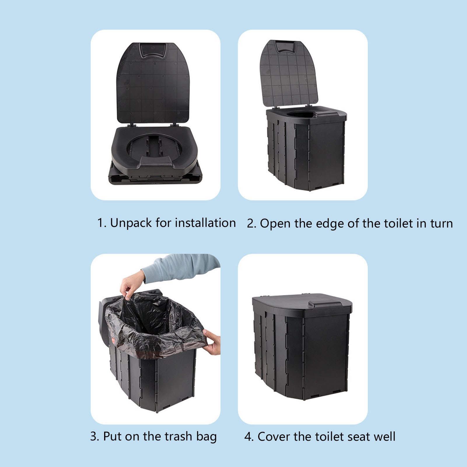 1、Folding Storage: Portable travel toilet seat is light in weight and small in size after folding, which can be easily placed in a bag or car, does not take much space. 2、Easy To Use: Come with a bundle of garbage bag, after you go to the toilet, just take the bag out and throw it away, which bring you much convenient. 3、Strong Load Bearing: Travel foldable toilet with strong bearing capacity, provide stable sitting without shaking, which is easy to carry the weight of 2 adults. 4、Wide Application: Portable travel toilet is suitable for children, adults, the elderly use, which is ideal for high speed road, outdoor picnic, camping and so on. 5、Comfortable Use: Travel foldable toilet adopted curve design for comfortable sitting, with smoothing surfaces without burr, which is safe and sturdy for long time use.