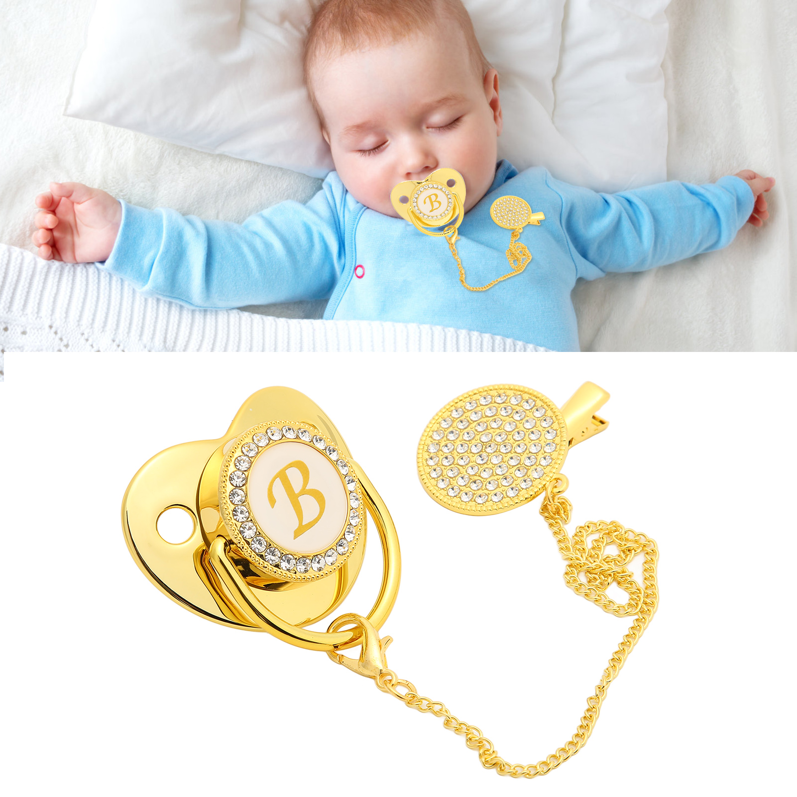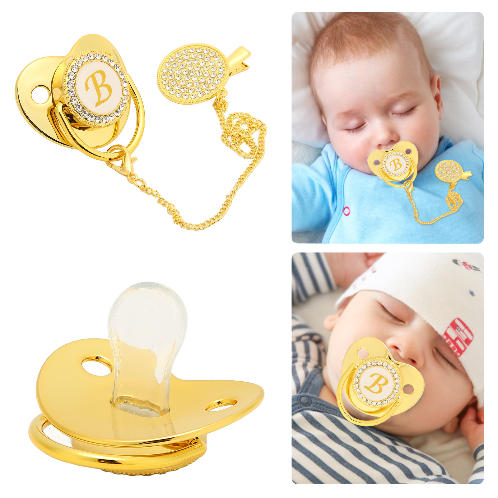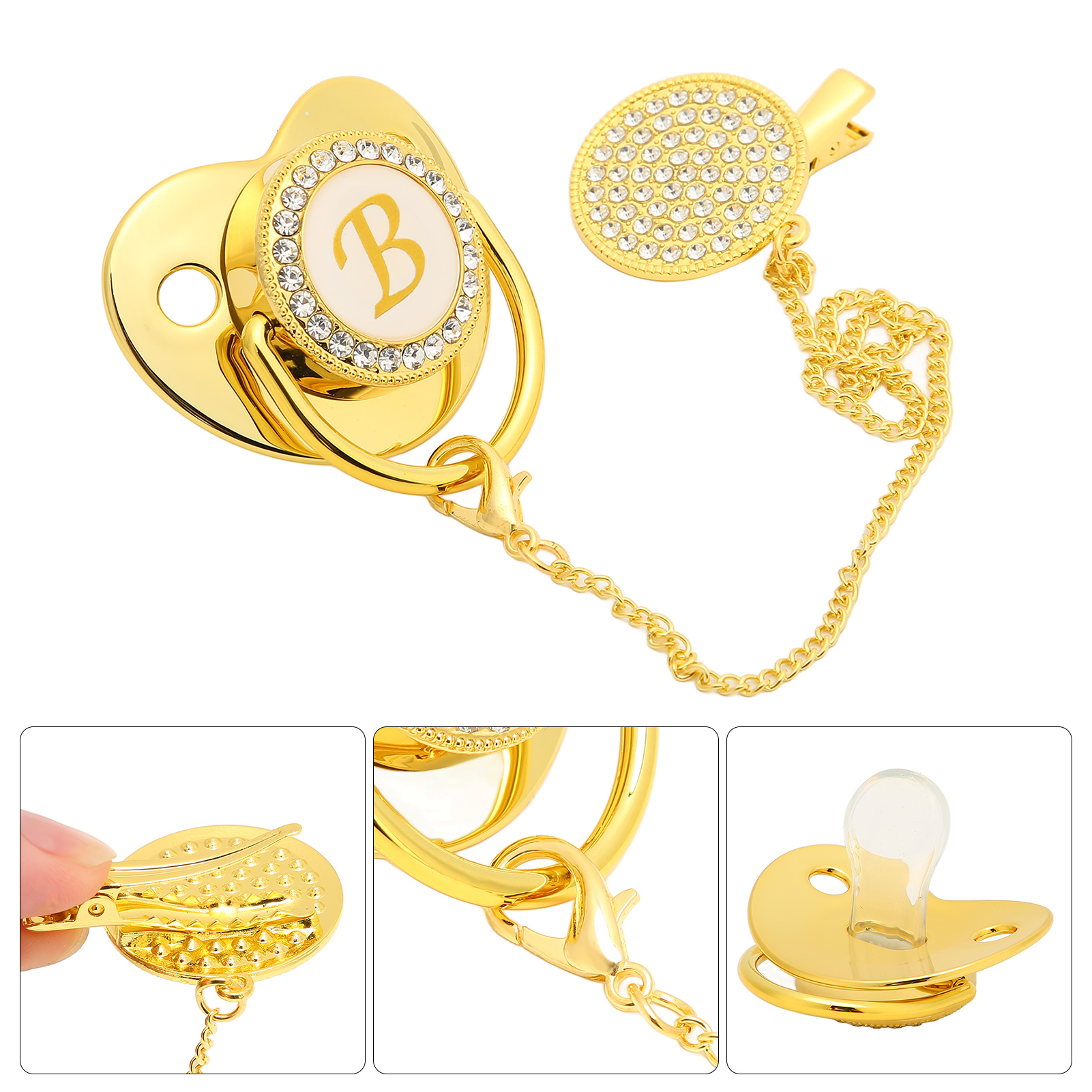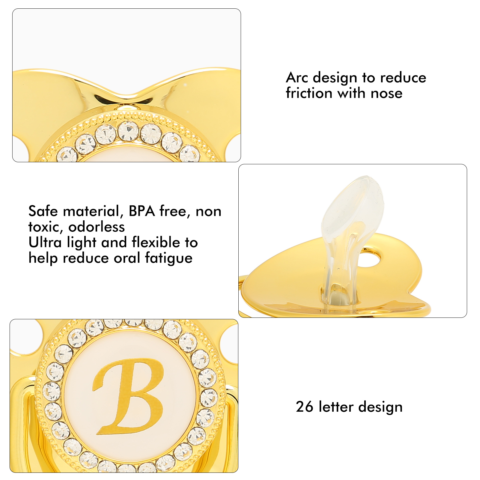 1、Curved Design: The golden pacifier with clip initials has a rounded design, which is ergonomic and reduces friction with the nose. 2、Soft Lightweight: Bling baby pacifier is ultra light and flexible to help reduce oral fatigue so baby can suck longer. 3、Safety Materials: Golden baby pacifier is made of silicone, PP and metal, BPA free, safe, non toxic, odorless, safe for babies to use. 4、Healthy Convenient: The baby pacifier adopts a one piece seamless design, which will not hide dirt, and there is no danger of swallowing. 5、26 Letter Design: Developed with the support of pediatric feeding experts, the cylindrical shape allows your baby to mimic the shape of their tongue while breastfeeding, helping to preserve your breastfeeding journey.