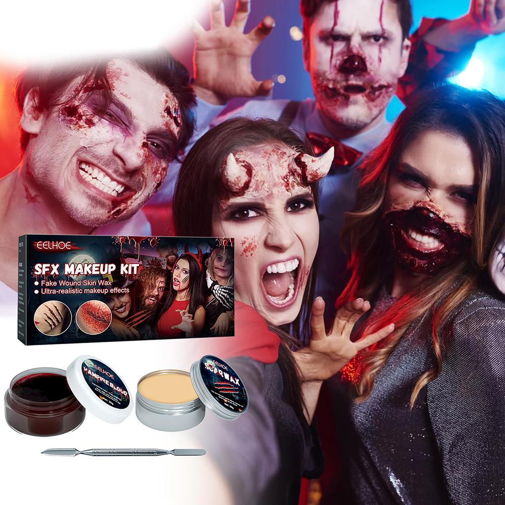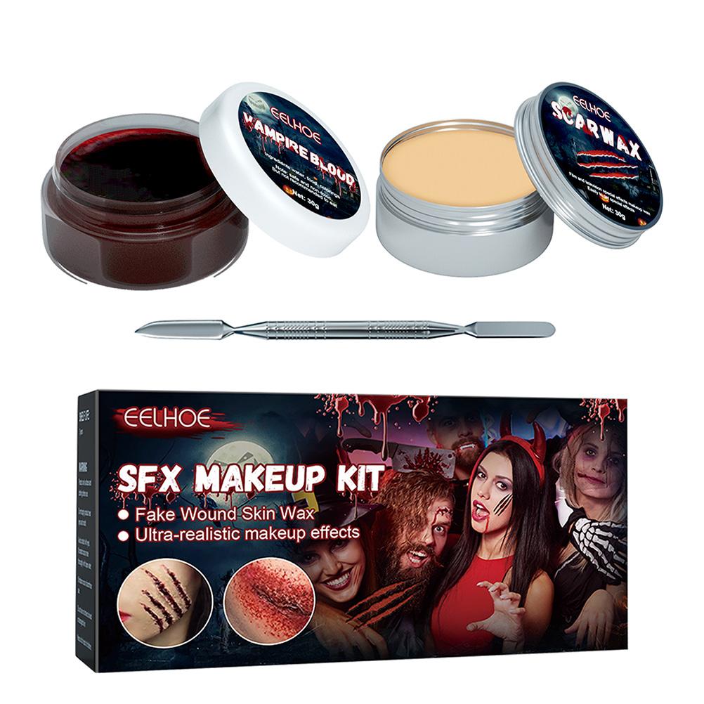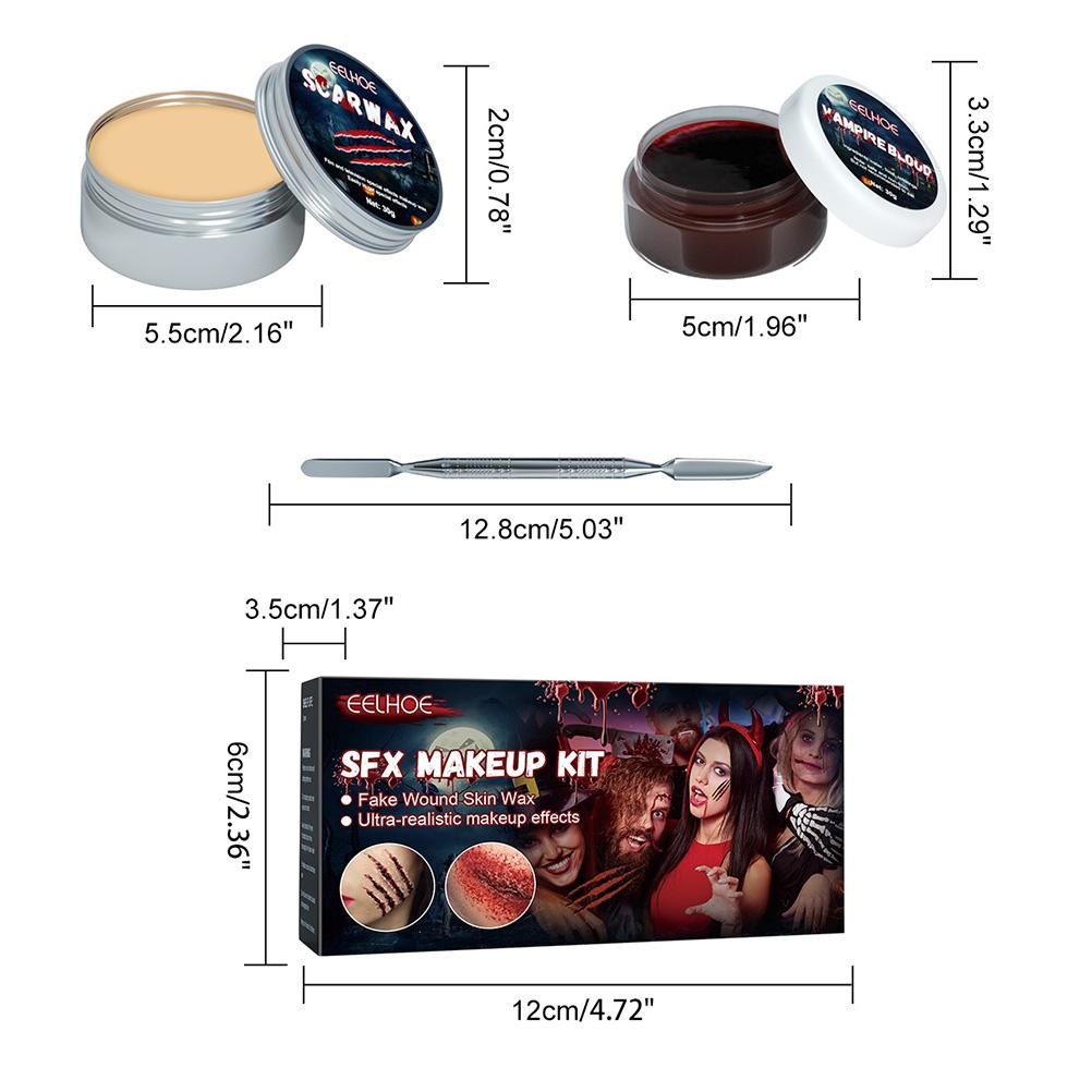 1、ALL IN ONE HALLOWEEN EFFECT MAKEUP KIT: You can use our makeup wax kit to create creepy effects like burns, big cuts, wounds, scars, cuts, bites, etc., easy to manipulate to create cuts and other shapes, very Great for covering brows and shaping clown noses. 2、REALISTIC MAKEUP: Use your imagination and creativity with this Halloween special effects makeup set just what you need to shock and scare everyone with realistic makeup that will make them scream. 3、SAFE MATERIAL: Our Halloween special effects makeup set is made of safe material, which is skin-friendly, non-irritating, and environmentally friendly, can be applied directly on the skin, will not hurt your skin, is safe to use, and is green and environmentally friendly. Because of some food coloring, we generally do not recommend swallowing. 4、WIDE APPLICATIONS: Halloween special effects makeup set is best for crazy looks, suitable for fun theme parties, costumes, april fools, halloween, carnival, cosplay, cosplay, haunted houses, graveyard scenes, movie props, festival or makeup and others with special effects artistic dress up. Here s a must-have makeup tool for Halloween to create a good festive mood. 5、ABOUT CLOTTING BLOOD CLEANING: Clean with warm water and soap (the first time may leave a little red, then wash again, the red will go away), if you just clean with water, this will not work, because the ingredients use more food coloring, making Blood glue is more realistic.