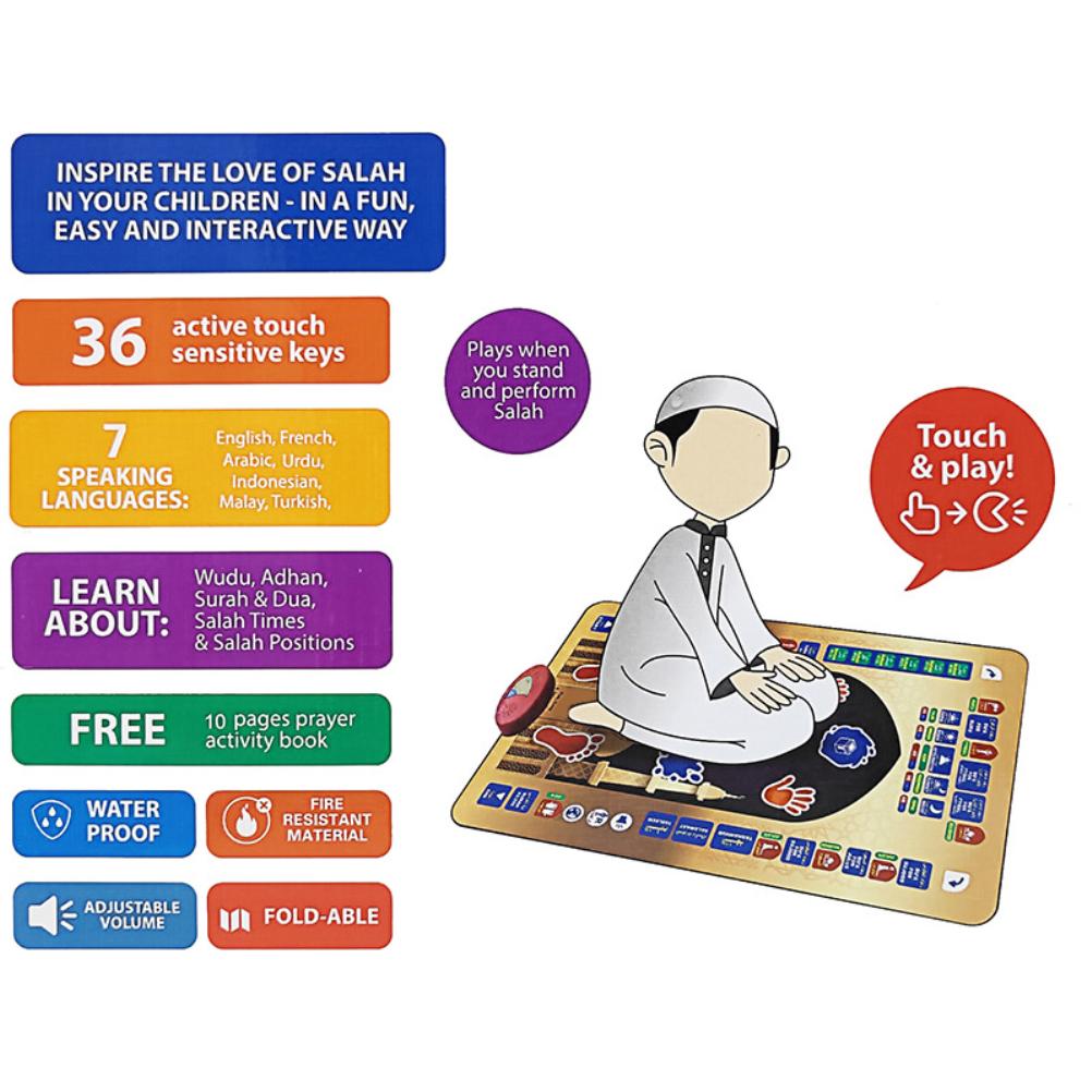1、1. Content: 7 languages ​​(English, French, Arabic, Urdu, Indonesian, Malay, Turkish), 36 active touch-sensitive keys; FREE: 20 pages prayer activity book. For more functions, please refer to the user guide. 2、2. Function: Inspire children aged 3-10 to think about praying, to love praying, and to learn and practice. Once they learn how to pray, they can naturally move to a normal prayer mat and pray independently. 3、3. Safety: The prayer blanket uses waterproof and fire-resistant materials to ensure that all safety standards are met so that you and your children can pray in peace. This product only requires 3 AA batteries (not included). 4、4. Application: The smart prayer blanket is designed for children from 3 to 10 years old. Our ultimate goal has always been to encourage and motivate children to pray and interact with the entire prayer process. This smart blanket is very suitable for Muslims to pray during Eid al-Fitr, Easter, Advent, National Day of Prayer, Annunciation, New Year, Christmas, etc. 5、5. Design: This Prayer Mat has been purposefully designed to perform The prayer mat will guide the user through the process of using touch-sensitive technology. Once the children know how to pray 2 Rakat, with all the actions, then they can move on to 3 and 4 Rakat with the guidance of their parent or teacher.