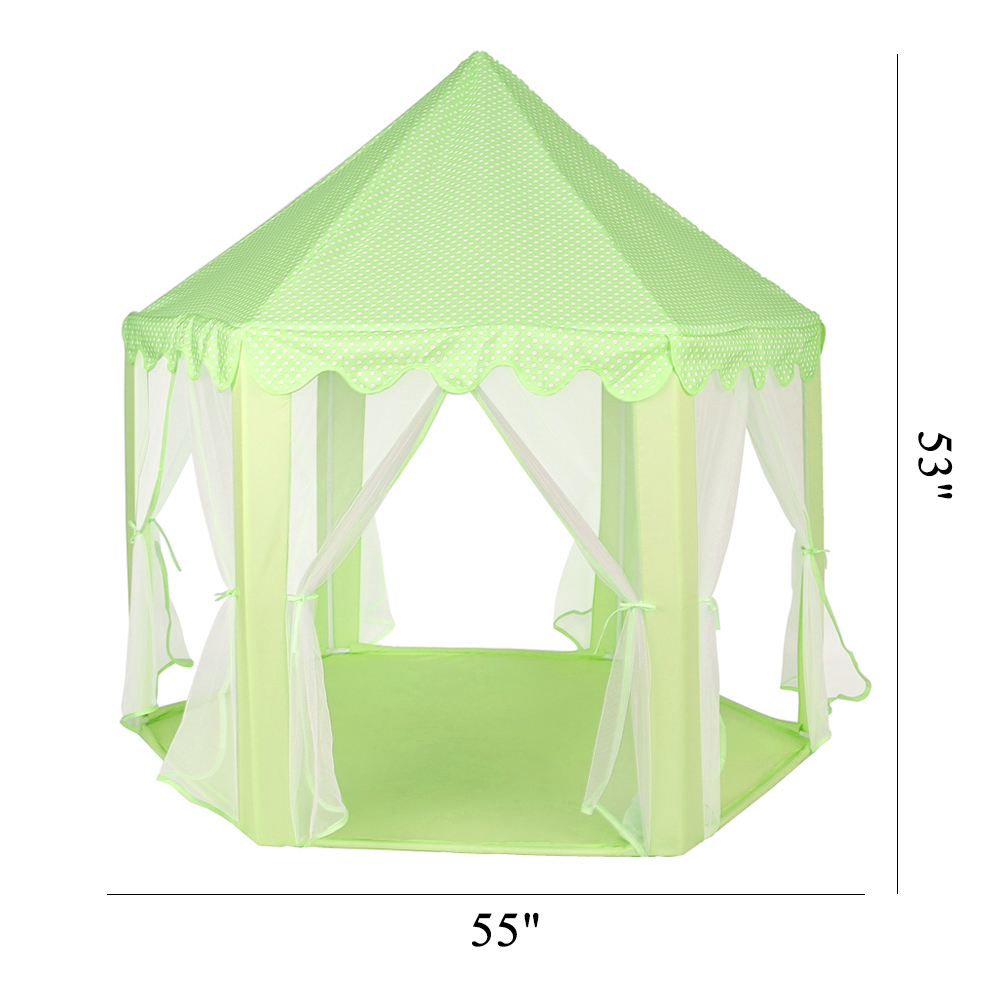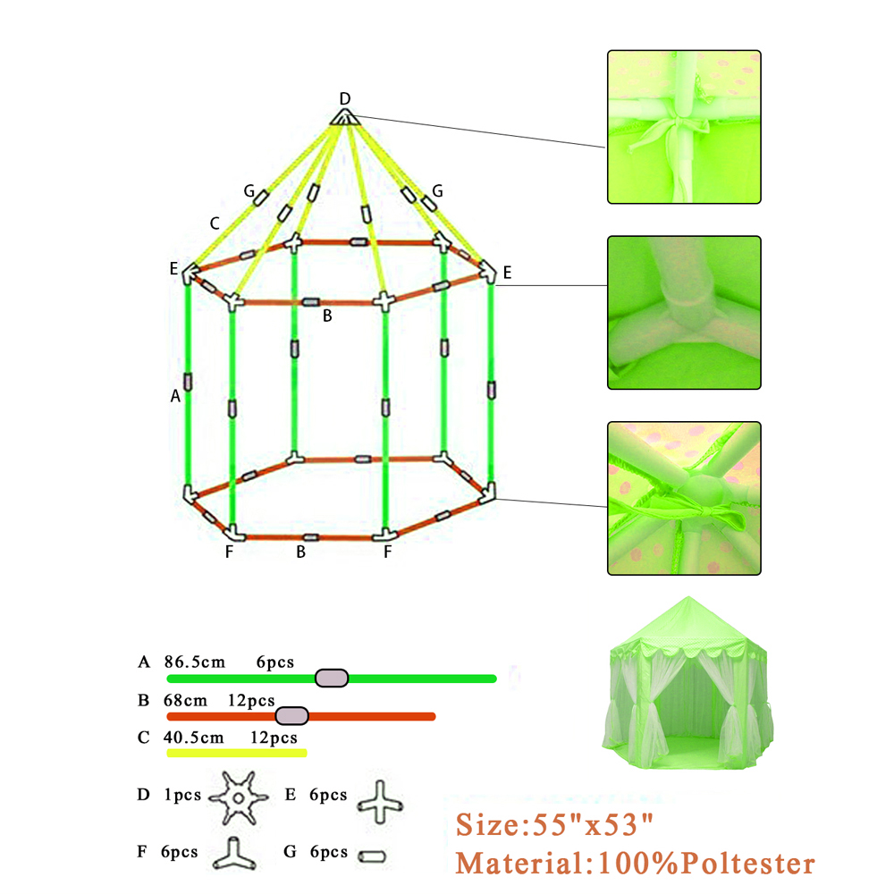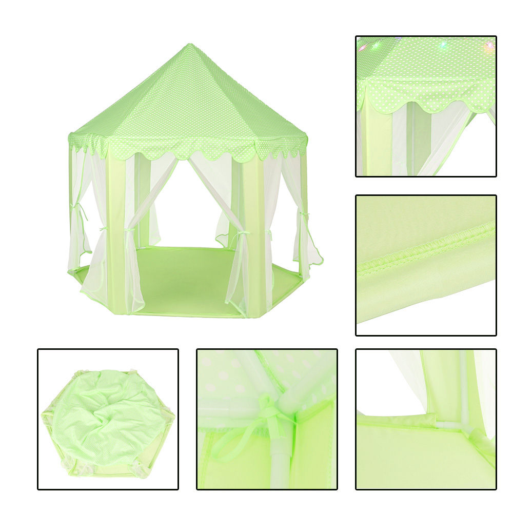 1、Made of polyester cloth and PVC pole, sturdy and durable 2、This kids play castle tent comes with LED star lights 3、Can be compactly packed in the included carry bag for storage or travel 4、Great for both indoor and outdoor use, including home, garden, kindergarten, backyard, park 5、Easy to set up this beautiful princess castle tent in just a few minutes