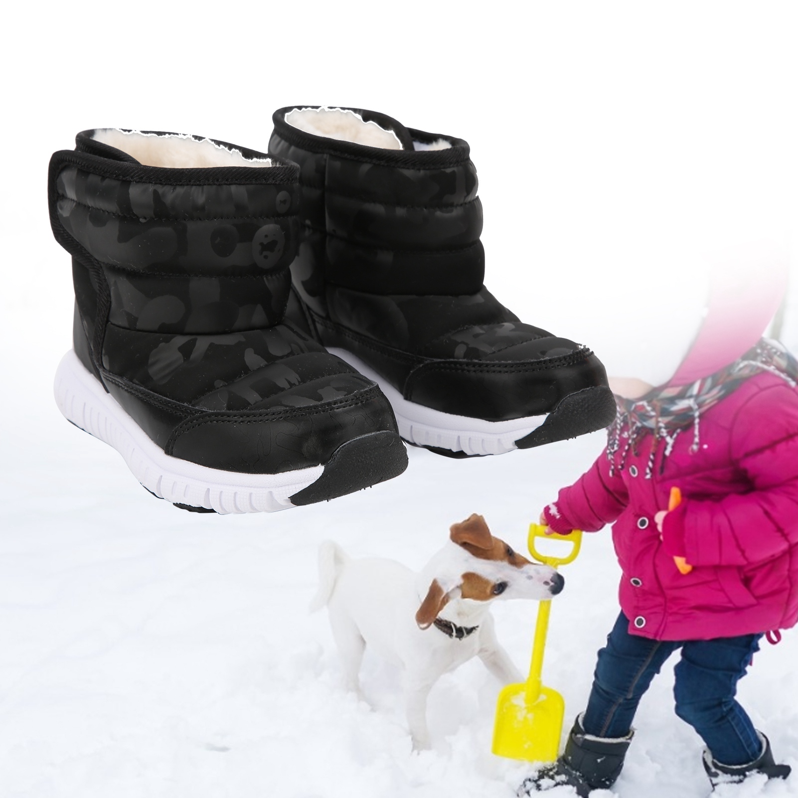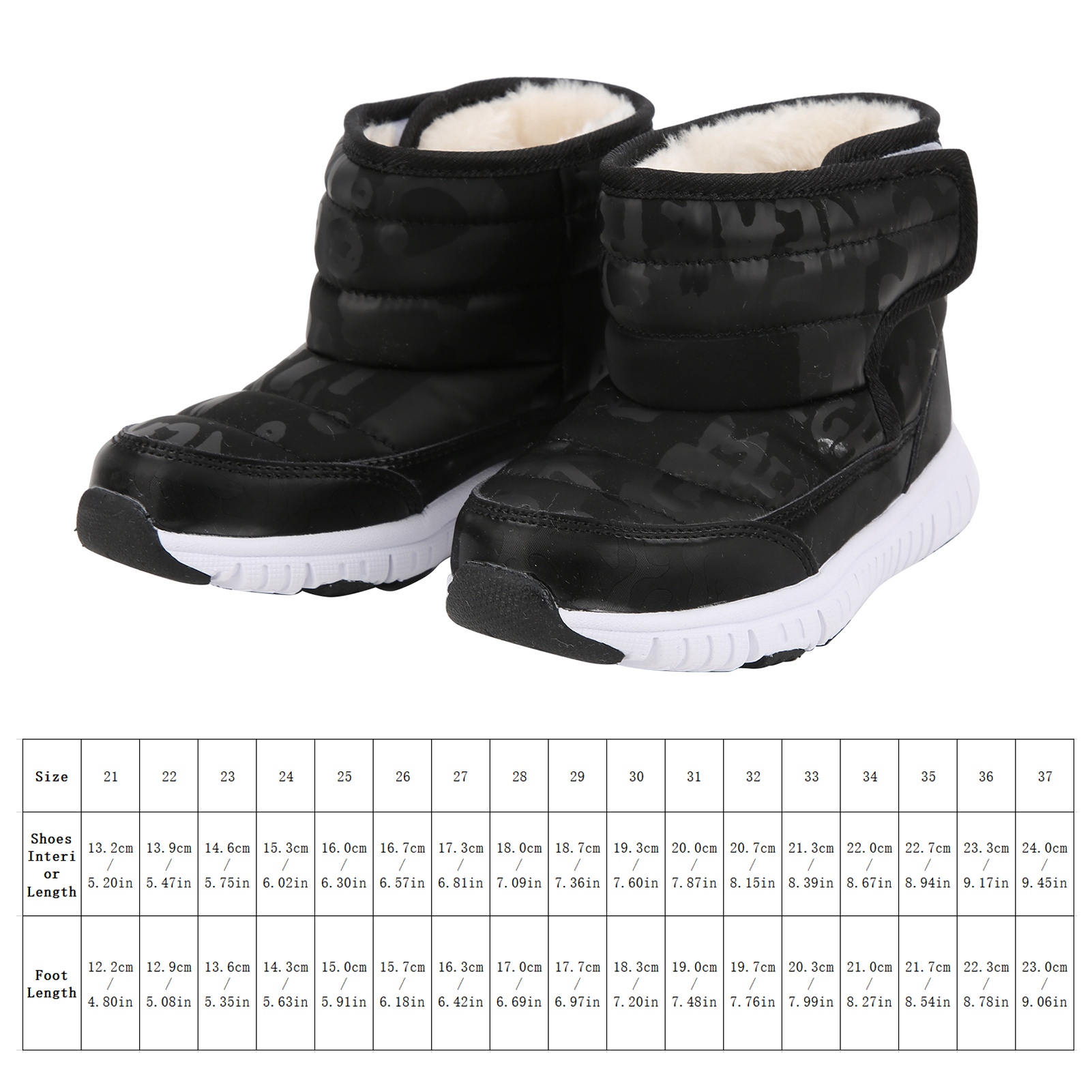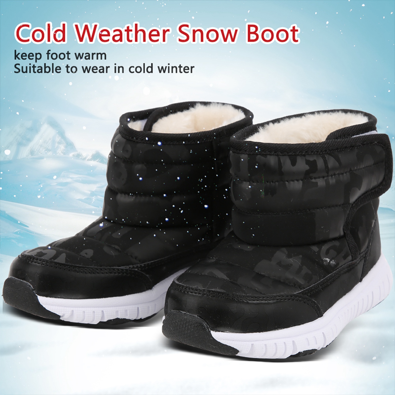 1、With a bump texture and soft non slip rubber sole design for improved grip and wear resistance. 2、The waterproof vamp is designed to easily prevent infiltration of rain and snow. 3、Thick interior is always keep foot warm and very suitable to wear in cold winter. 4、We recommended that to buy a larger size of this winter shoes for comfortable wearing. 5、Beautiful and stylish appearance will keep your kids warm and match all your children's winter clothes.