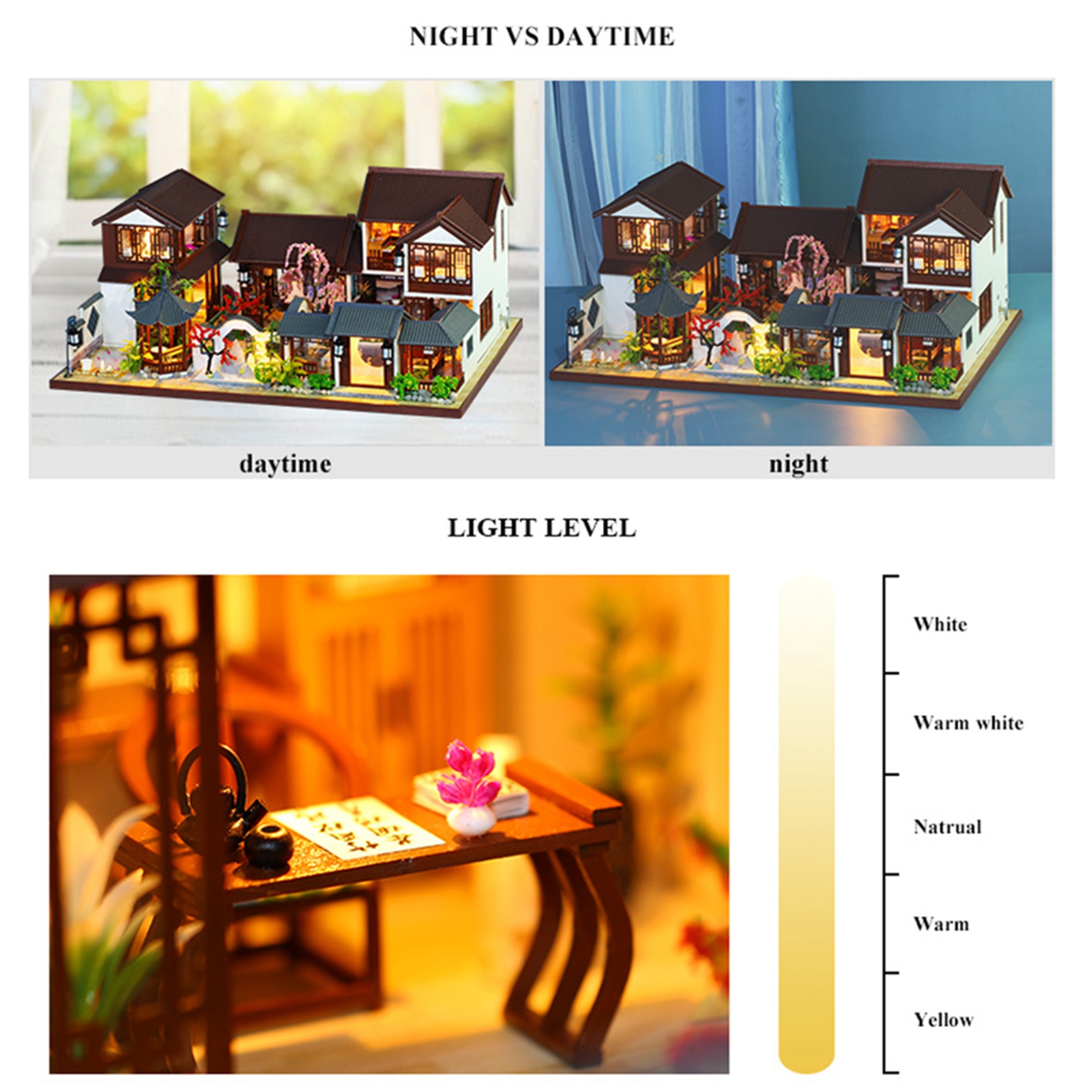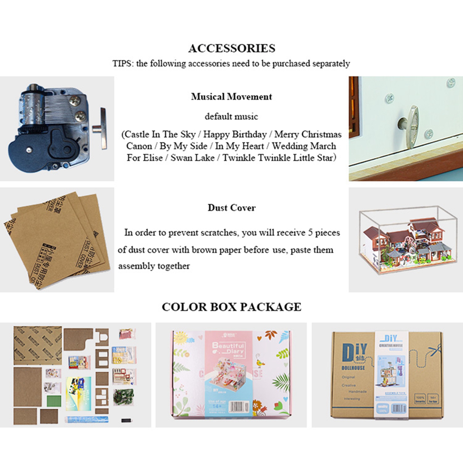 1、This lovely house is not designed for play, but a collectible building or home decoration after completion. 2、It comes with parts and needs to be assembled DIY. This kit is suitable for people over 14 years old, is a great way to communicate with teenagers or adults, and is a perfect project to spend time. 3、Exquisite design, high quality materials, furniture and other wooden pieces are precisely cut to ensure that they are assembled correctly. 4、Plants, decorations, and furniture are all very lifelike and cleverly designed. For those who like handicrafts and miniature crafts, this is a perfect gift and collectible. You can do it yourself to make the gift more meaningful. 5、For first‑time builders, it may be full of challenges, but you will be delighted after completion, an interesting toy.