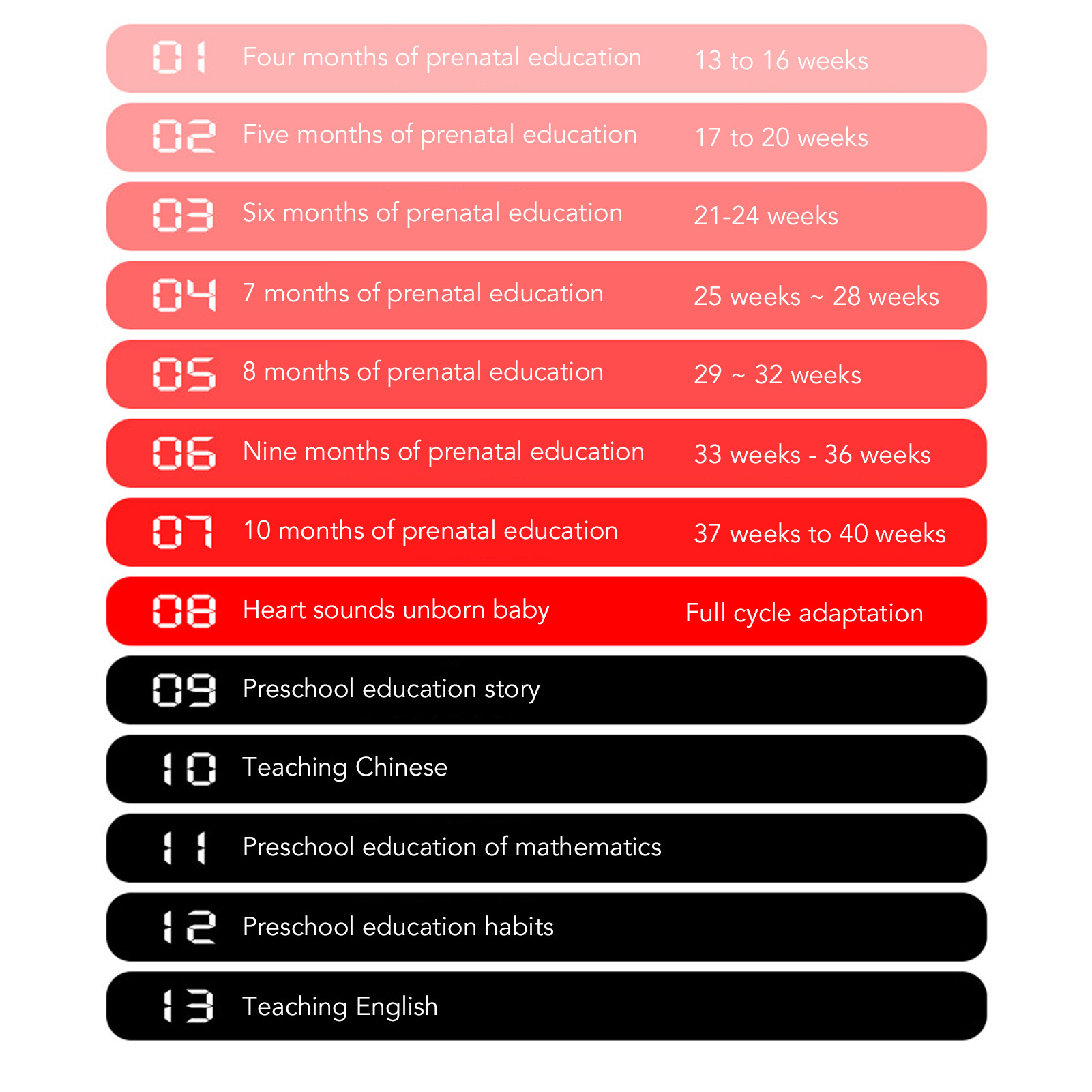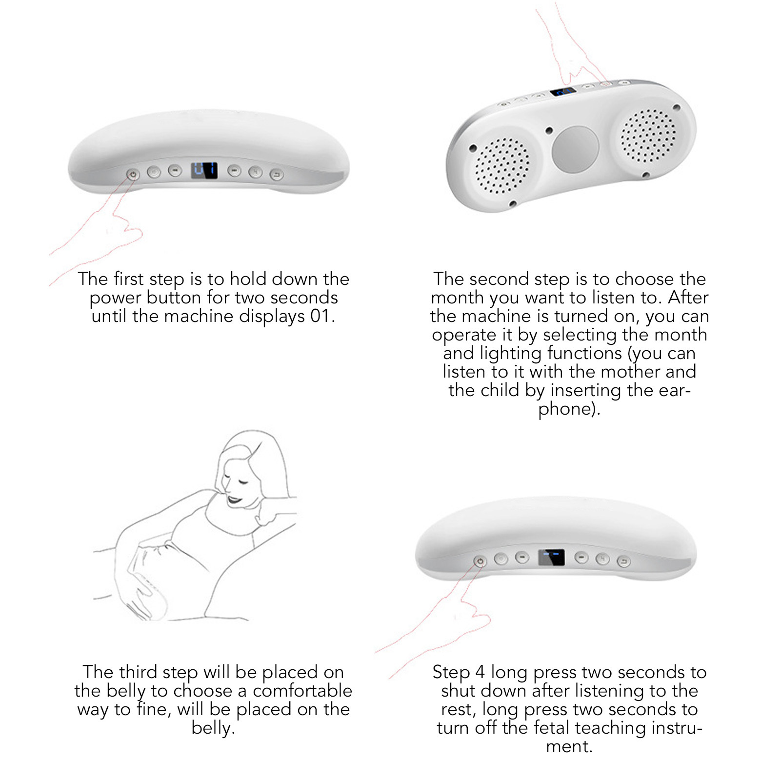 Functions: Monthly fetal education, spectrum assisted fetal education, parent child dialog, dual listening headphones, music machine.