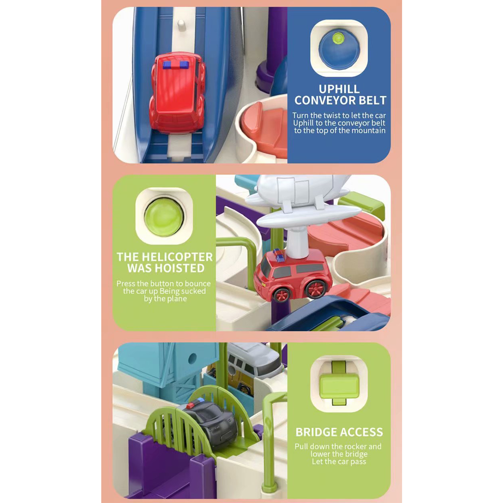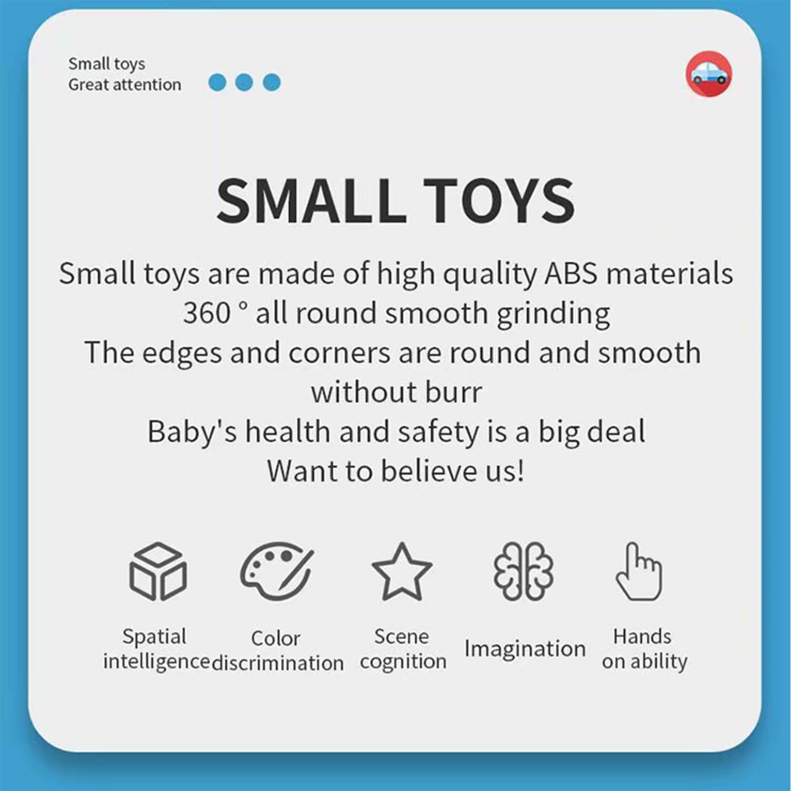 1、4 buttons, 6 levels, easy to operate, make babies' brains open. 2、Exercise the baby's hand eye coordination, fun and intelligence. 3、Designed with mechanical principles, easy to use. 4、The toy is made of premium ABS material, which is durable. 5、The surroundings are smoothly polished, the edges and corners are rounded and without burrs, which is safe for babies.