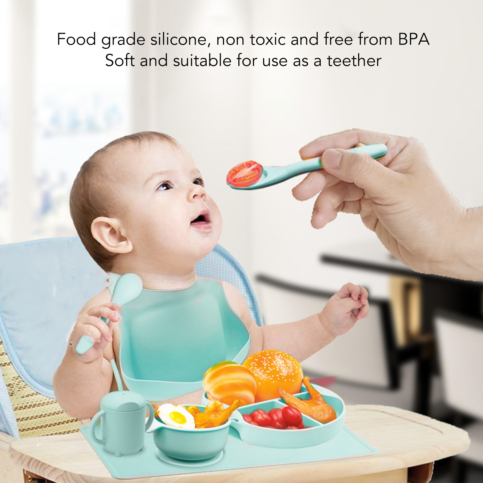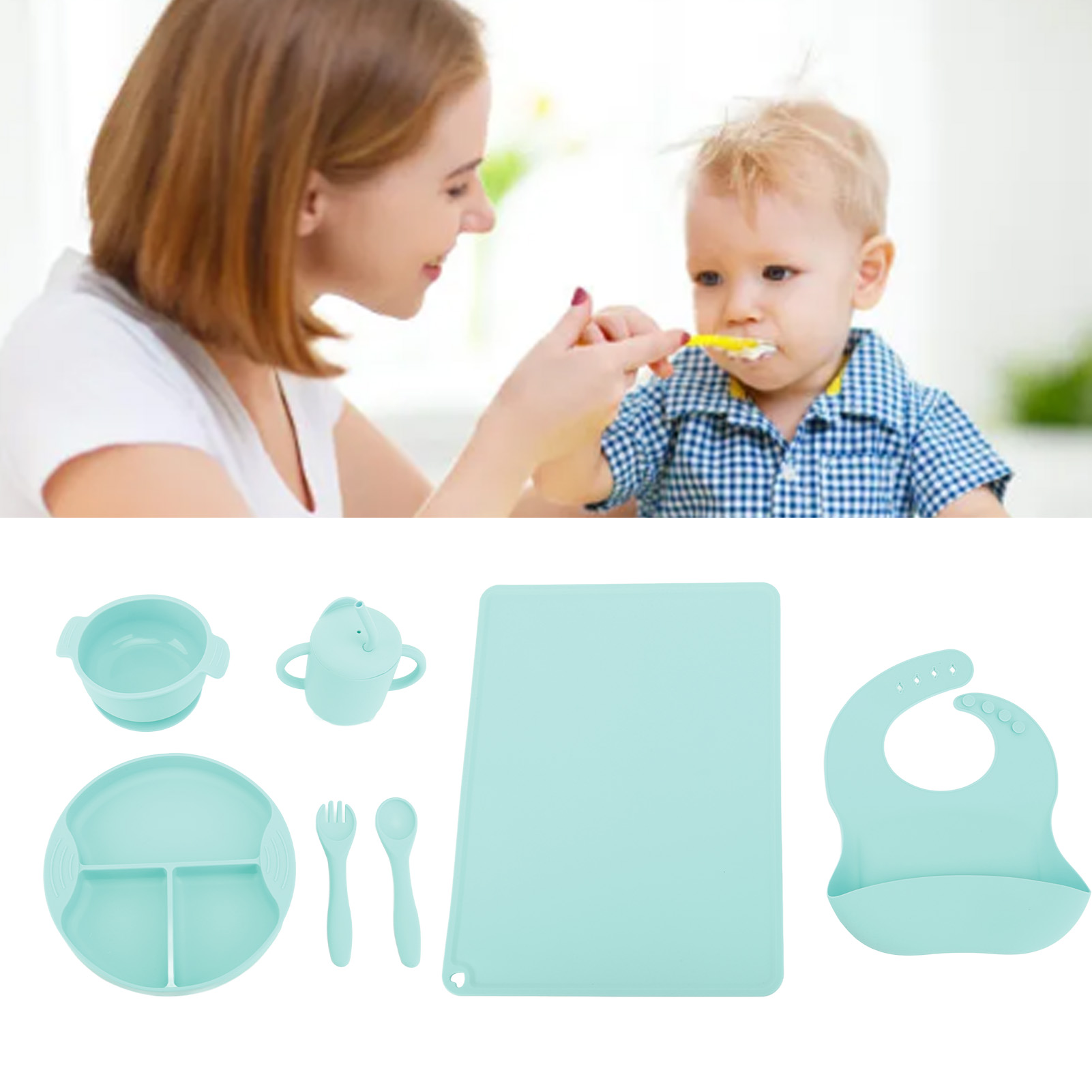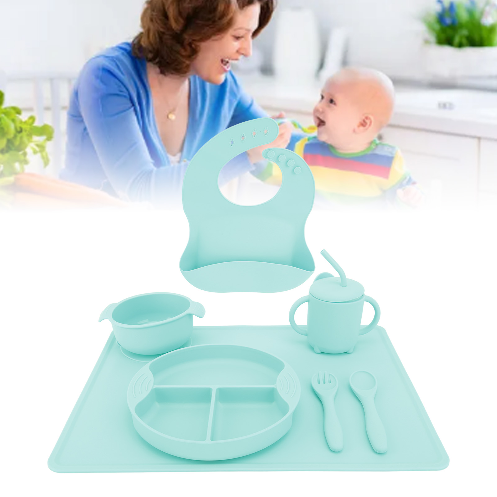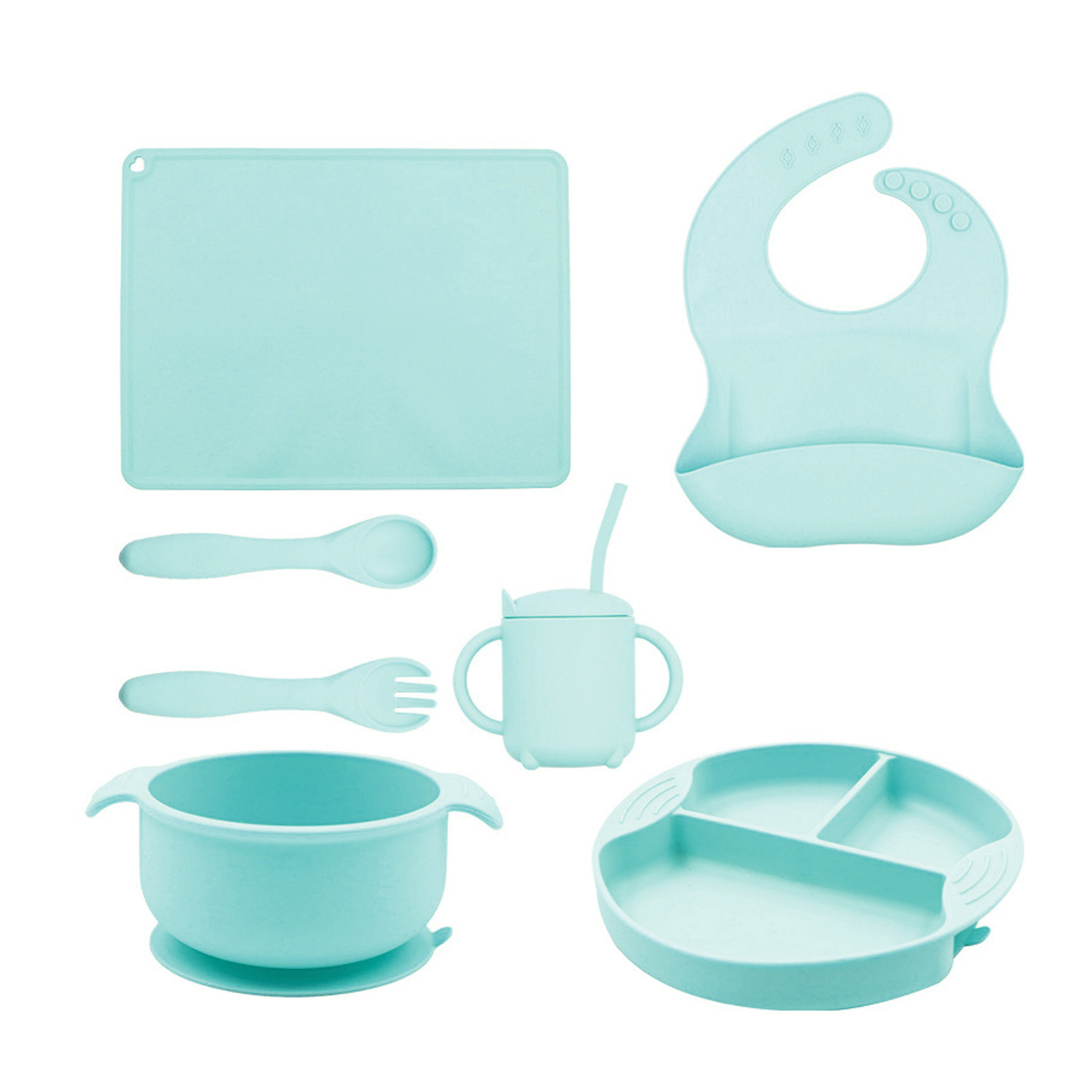 Set of 7 Silicone Baby Feeding Set Bib Spoon Fork Cup Suction Bowl Divided Plates Led Weaning Supplies Blue
