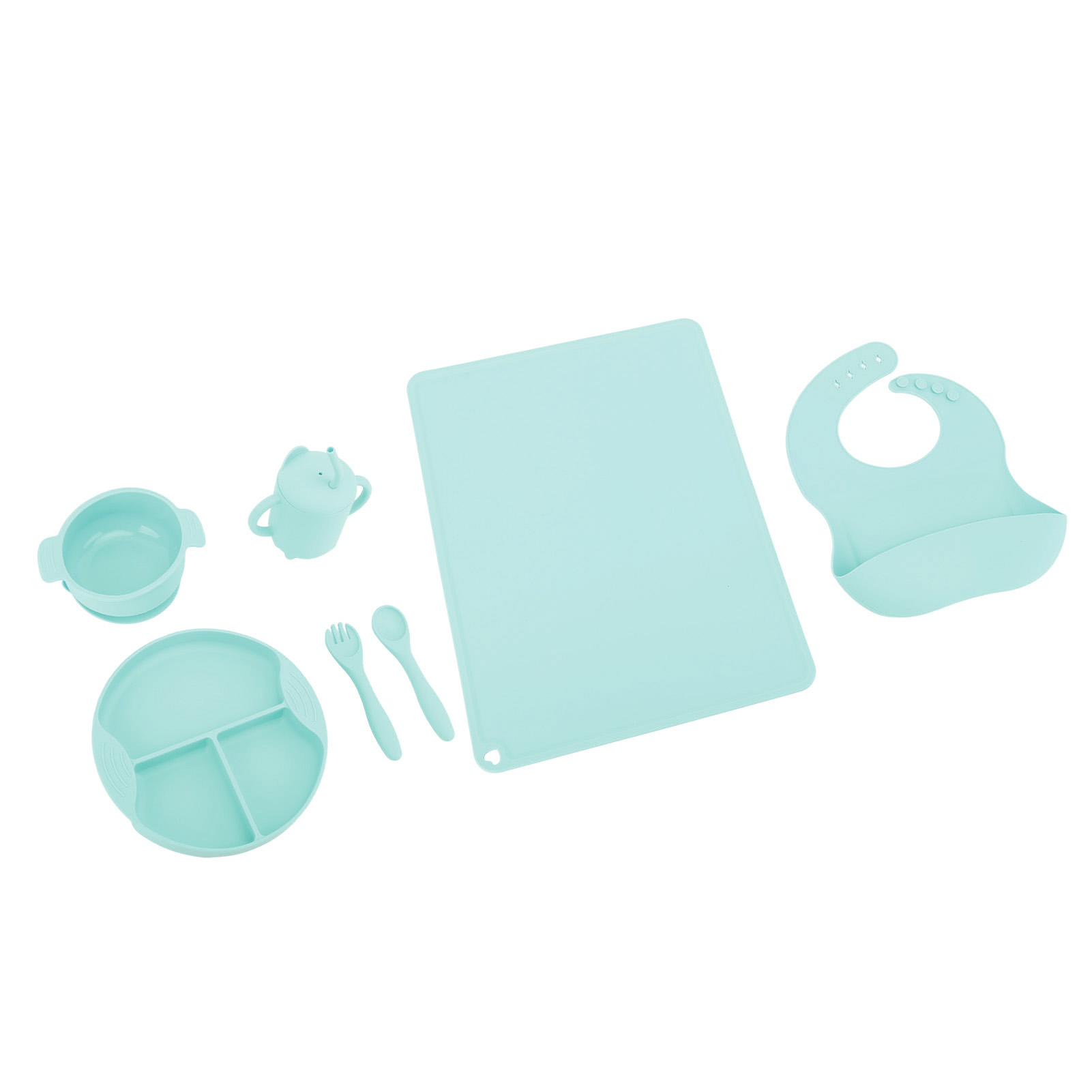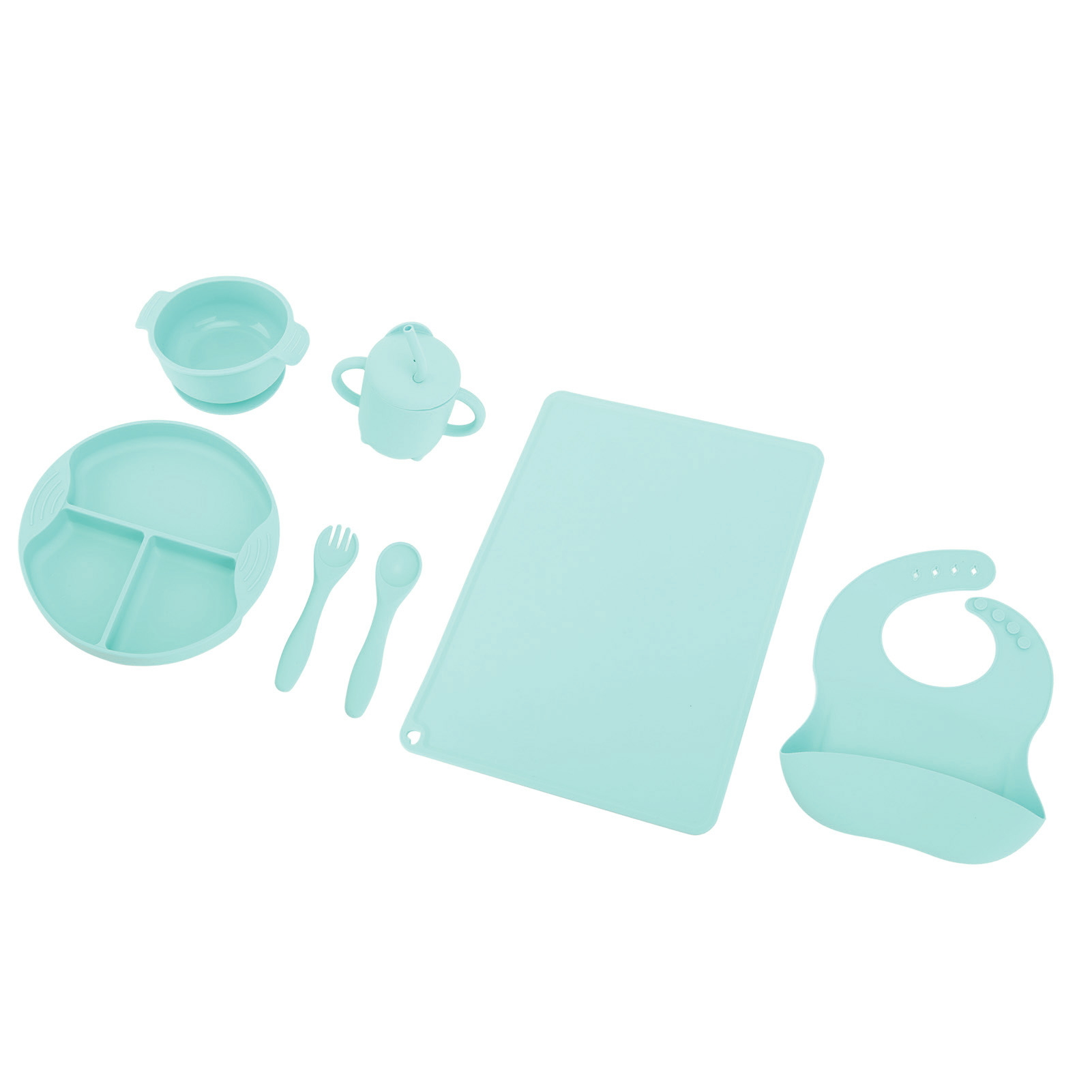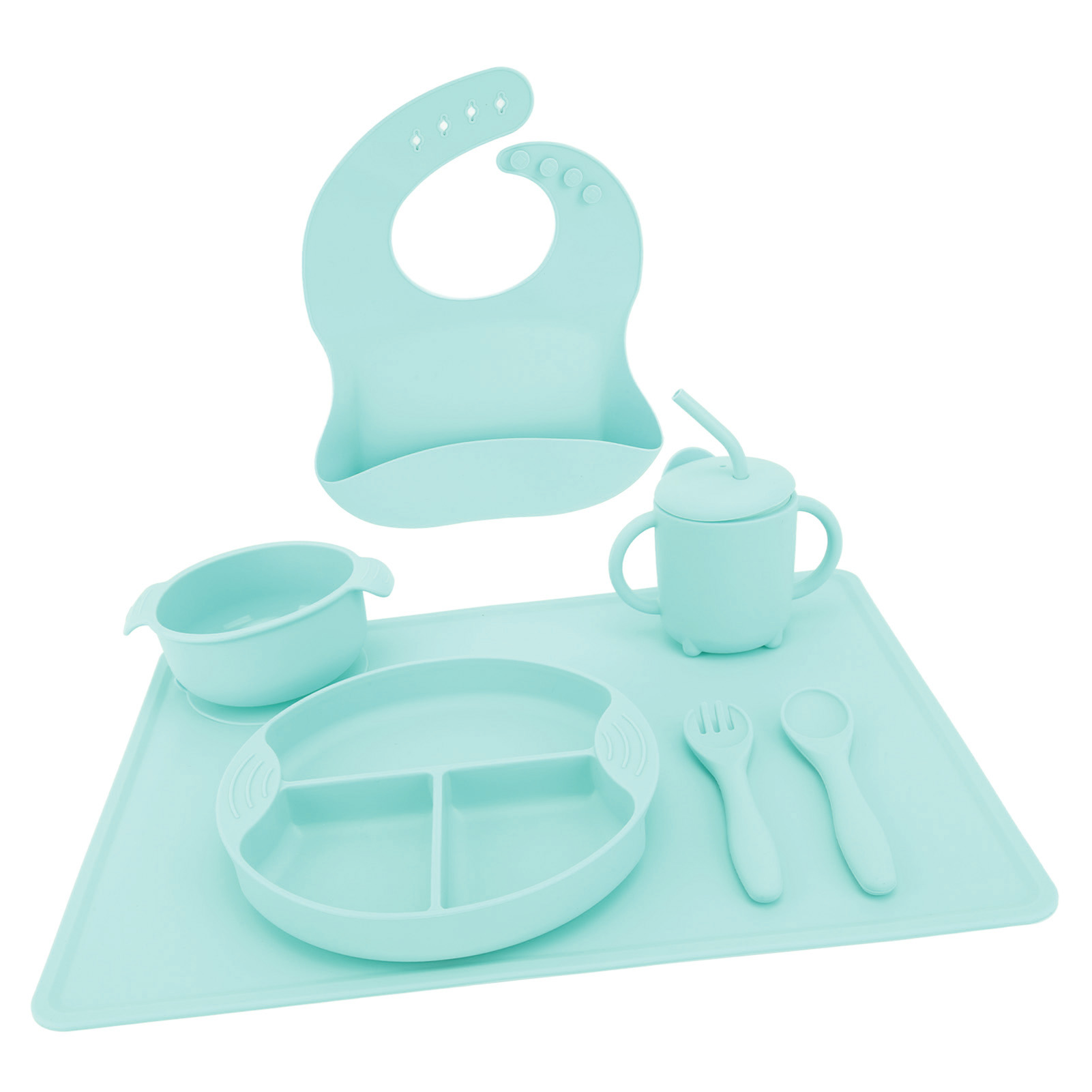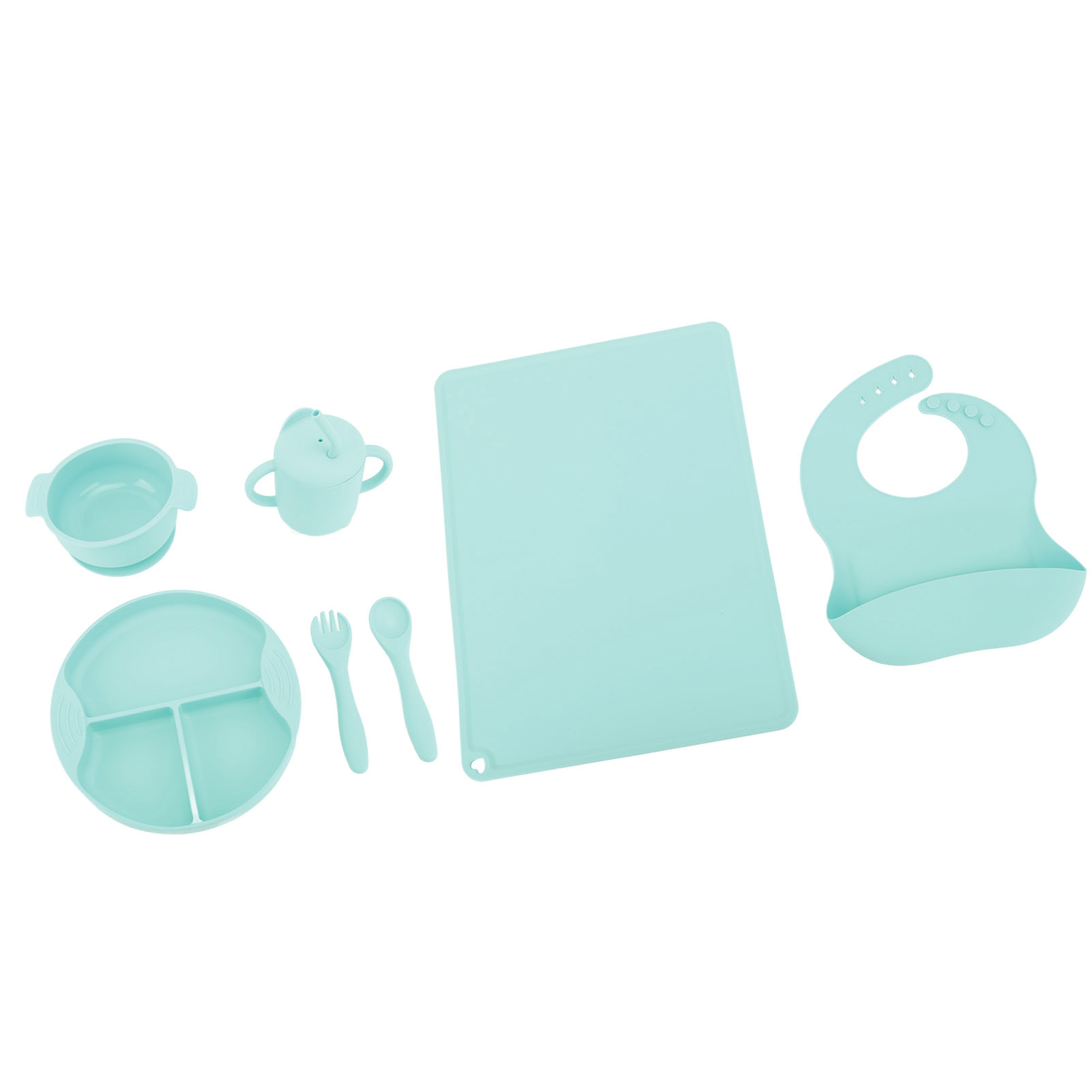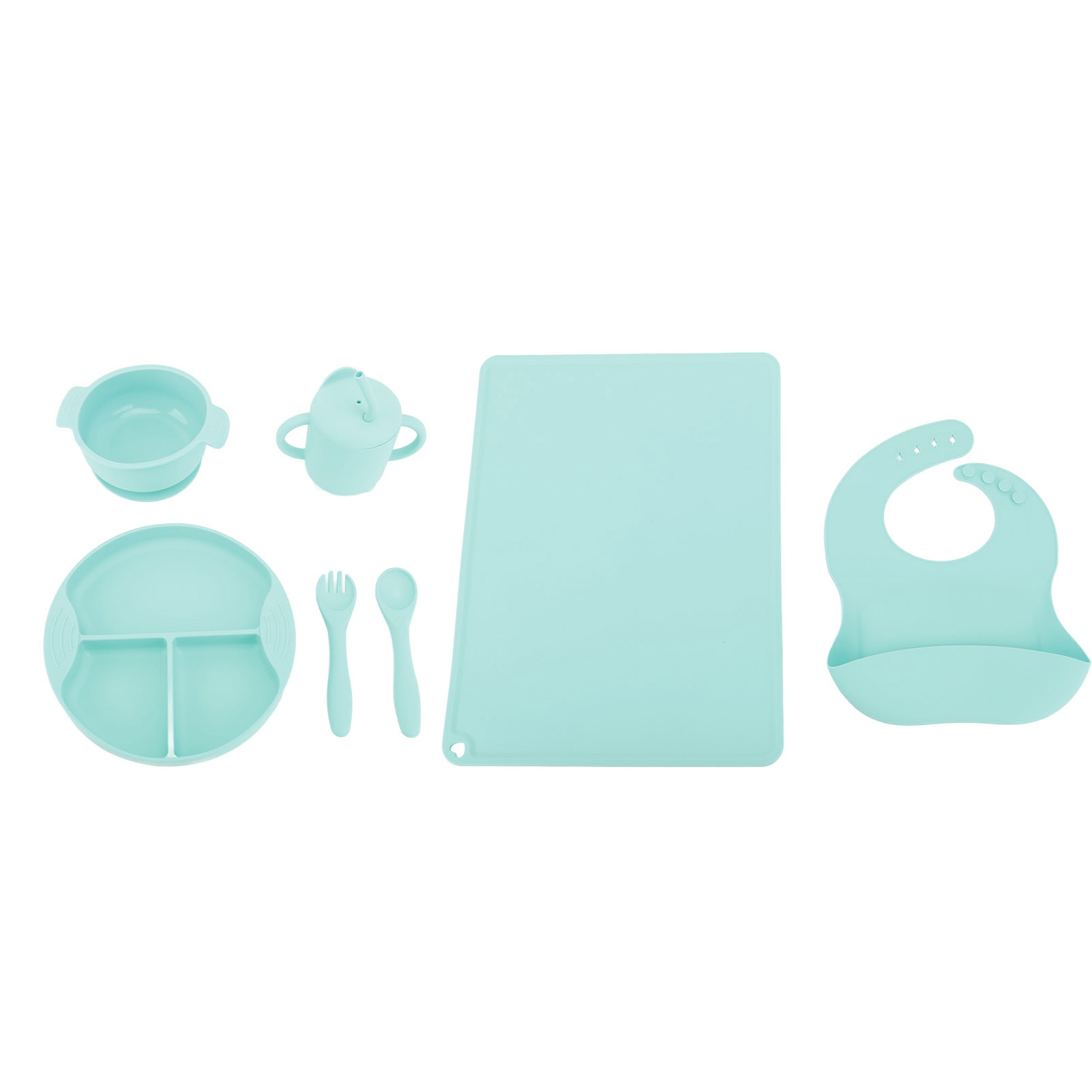 Set of 7 Silicone Baby Feeding Set Bib Spoon Fork Cup Suction Bowl Divided Plates Led Weaning Supplies Blue