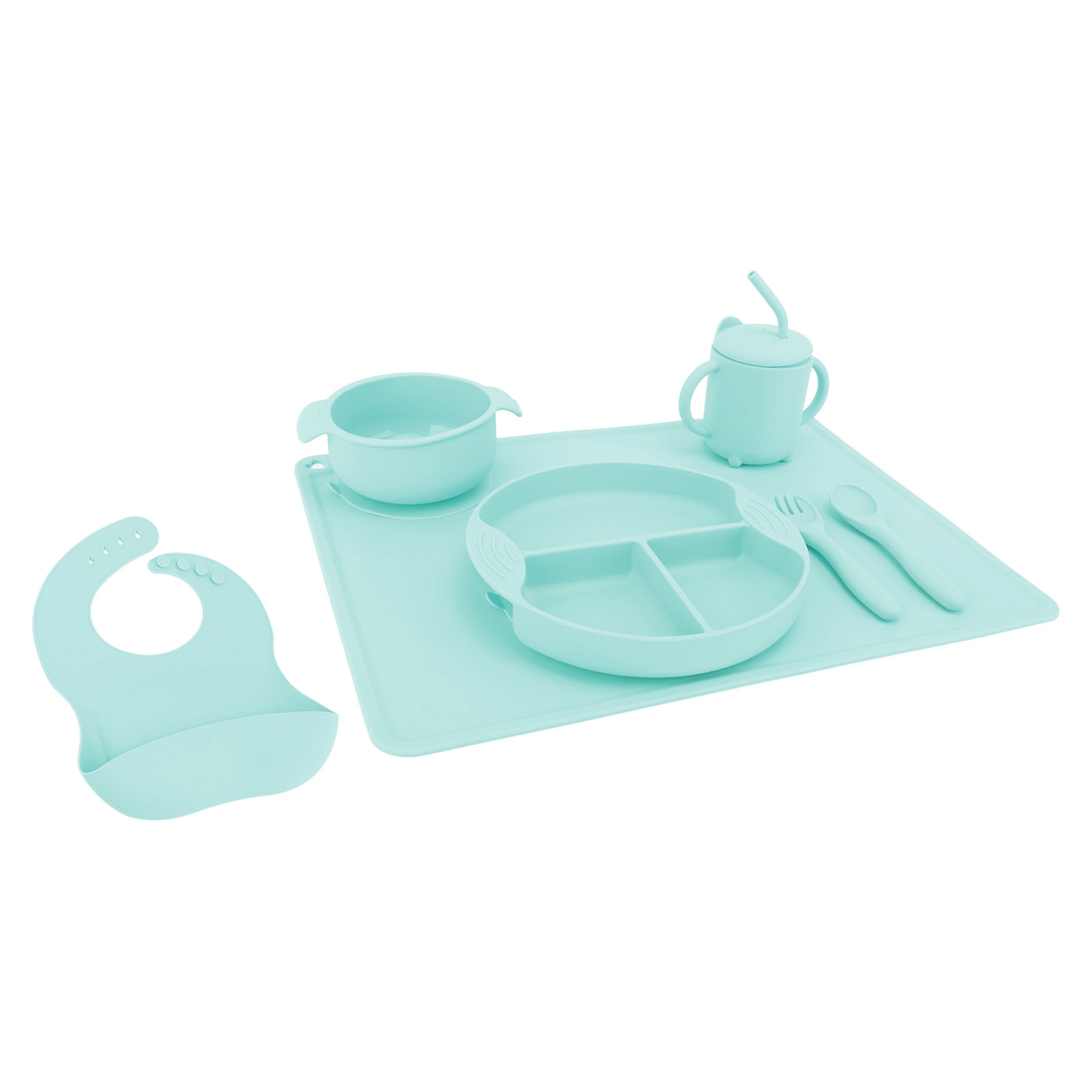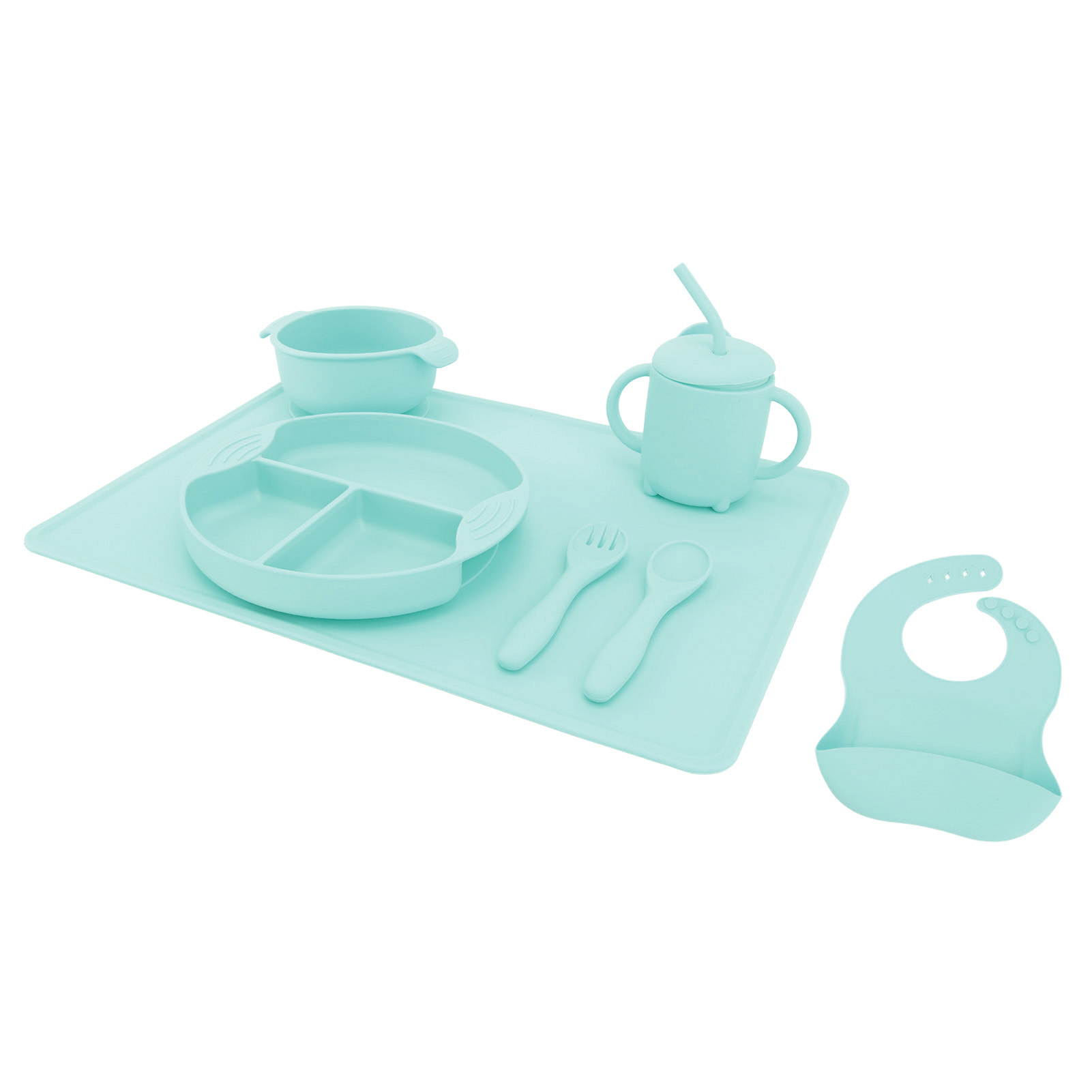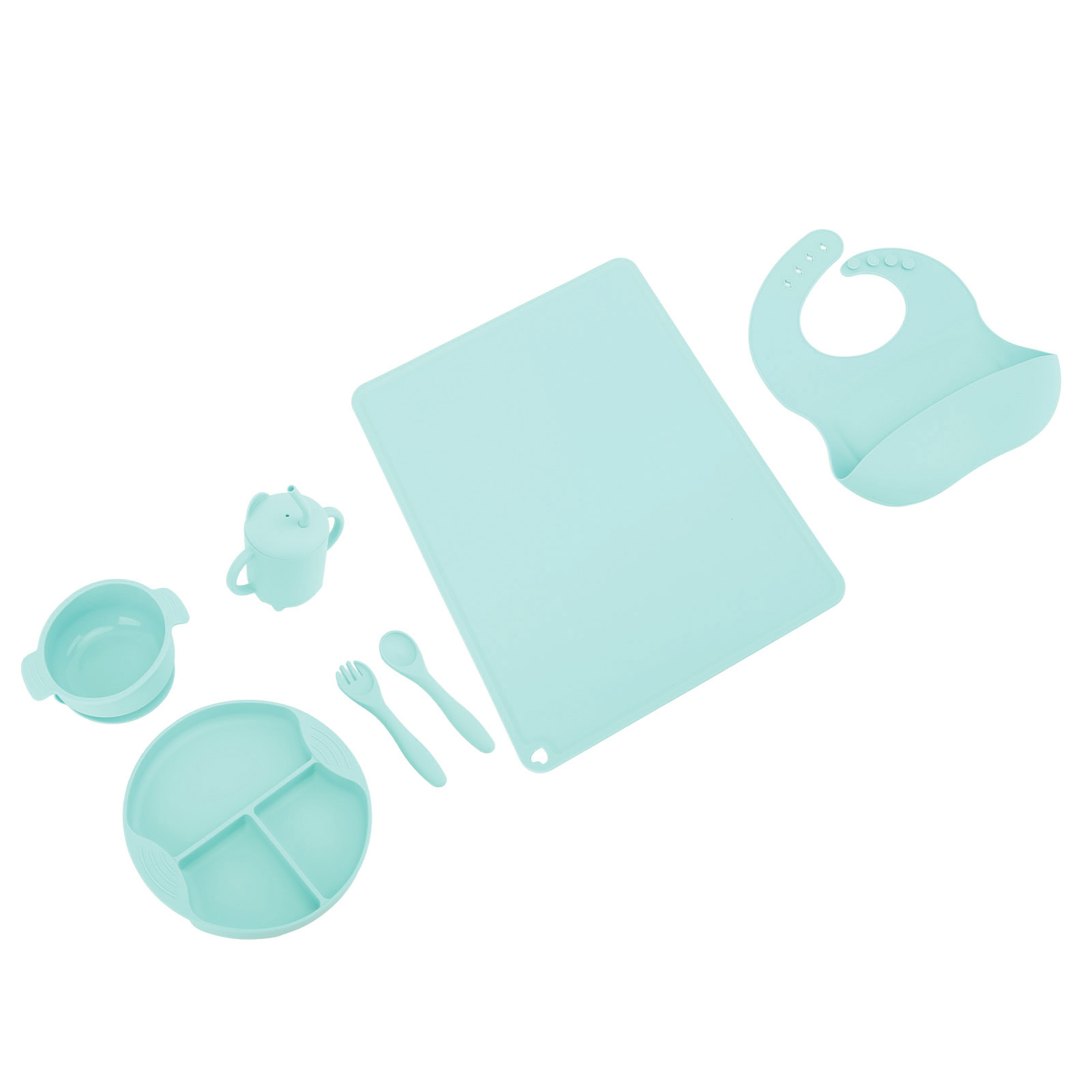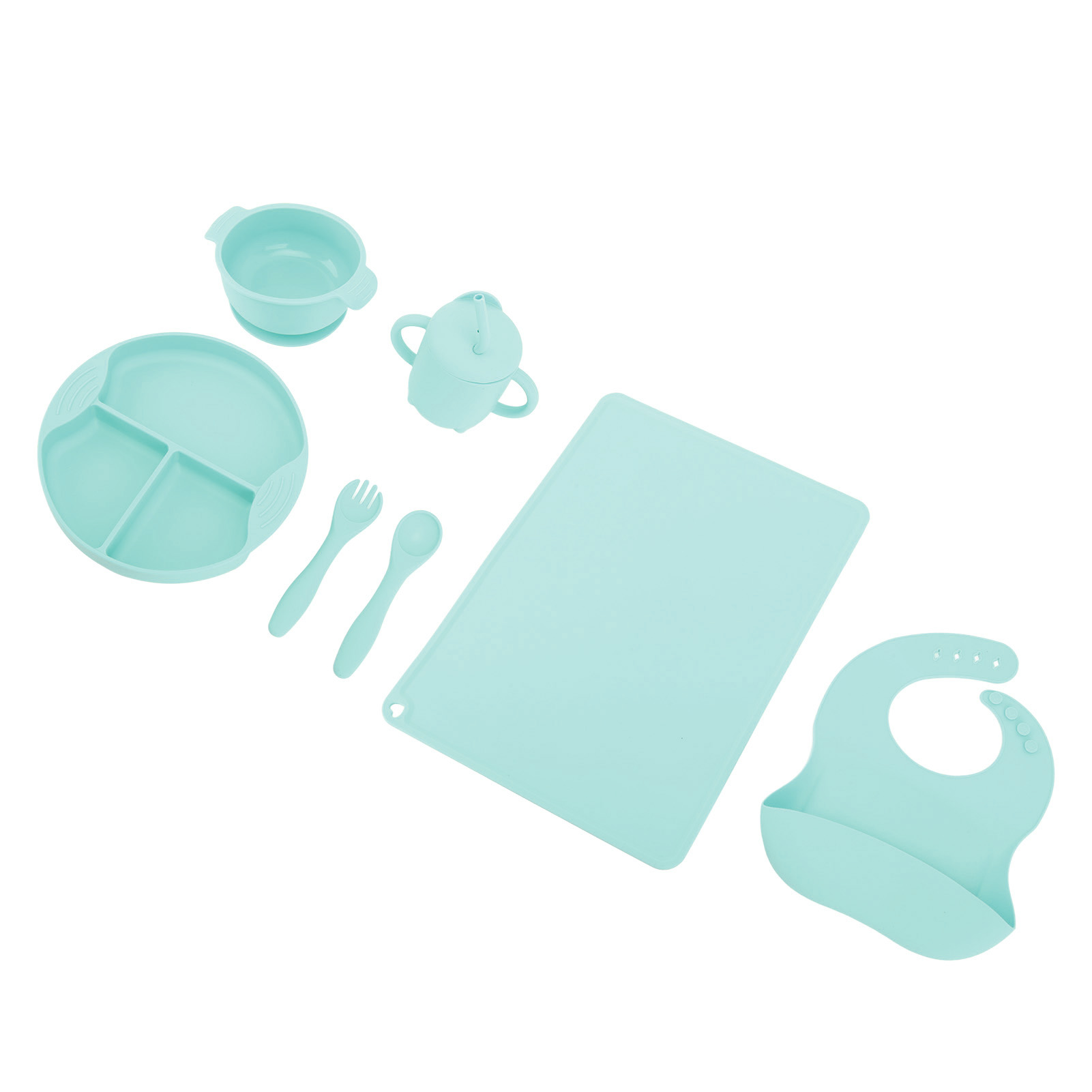 Set of 7 Silicone Baby Feeding Set Bib Spoon Fork Cup Suction Bowl Divided Plates Led Weaning Supplies Blue