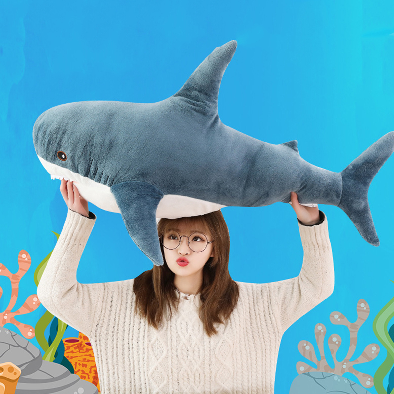 Shark Pillows Stuffed Animal Plush Soft Fluffy Funny Gifts for Brave Boy's and Girl's Room Shark Decor Blue 45cm/17.72in