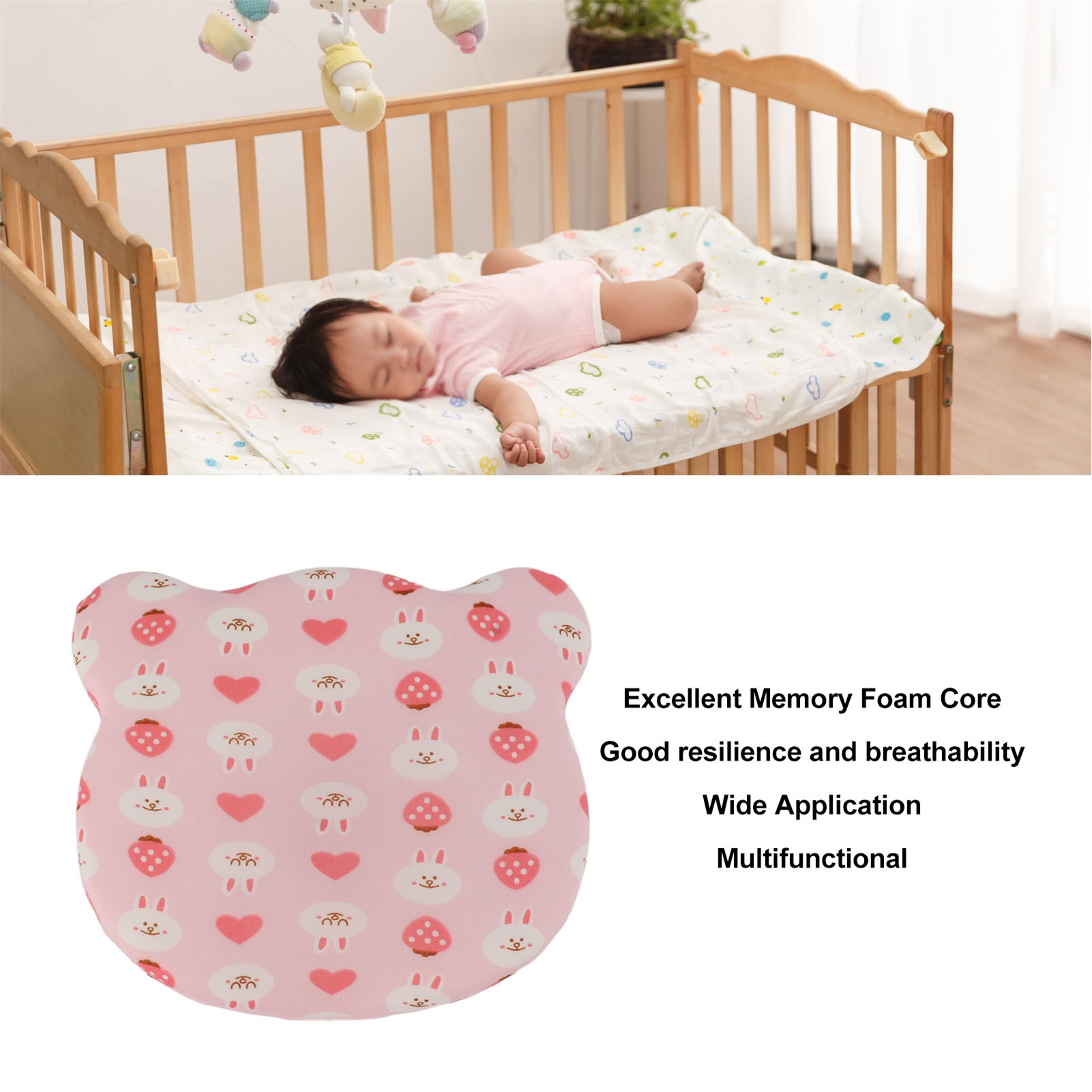 1、Excellent Memory Foam Core: This baby pillow is made of excellent quality memory foam core with good resilience and breathability, which can keep the pillow elastic and comfortable for a long time and provide stable support for your baby. 2、Suitable Shape: This baby pillow is shaped to fit the curve of your baby's head, providing comfortable support to help your baby fall asleep. 3、Pure Cotton Fabric: This baby pillow is made of pure cotton fabric, which is soft and comfortable and not easy to irritate your baby's skin. 4、Multifunctional: This baby pillow is not only suitable for baby's sleep, but also can be used as a nursing item to bring comfort and stable support during baby's feeding, cuddling, etc., to protect baby's cervical spine health. 5、Wide Application: This baby pillow is removable and easy to clean, and is suitable for a variety of scenarios such as car seats, strollers and beds, which is easy to carry and provides maximum convenience for your baby.