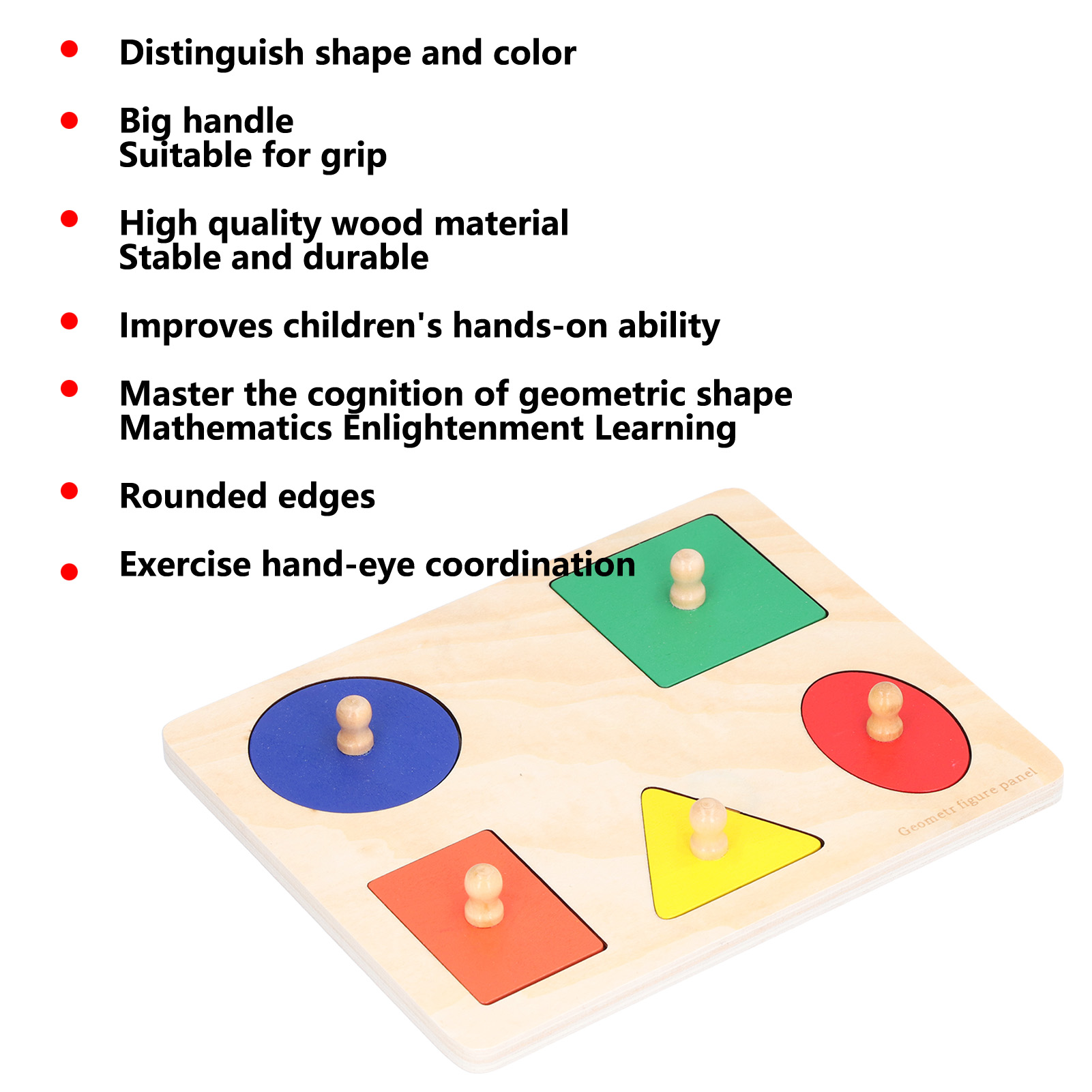 1、The shape puzzle is specially designed to help children distinguish different geometric shapes and colors. 2、Rounded and smooth edges, which can prevent your baby from being scratched during play. 3、It can not only help children distinguish geometric shapes, but also improve children's hand-eye coordination ability. 4、Using ergonomic handle design, which is easy to grasp and not easy to slip off. 5、Unique appearance, it would be a good choice to give it to your baby as a gift.