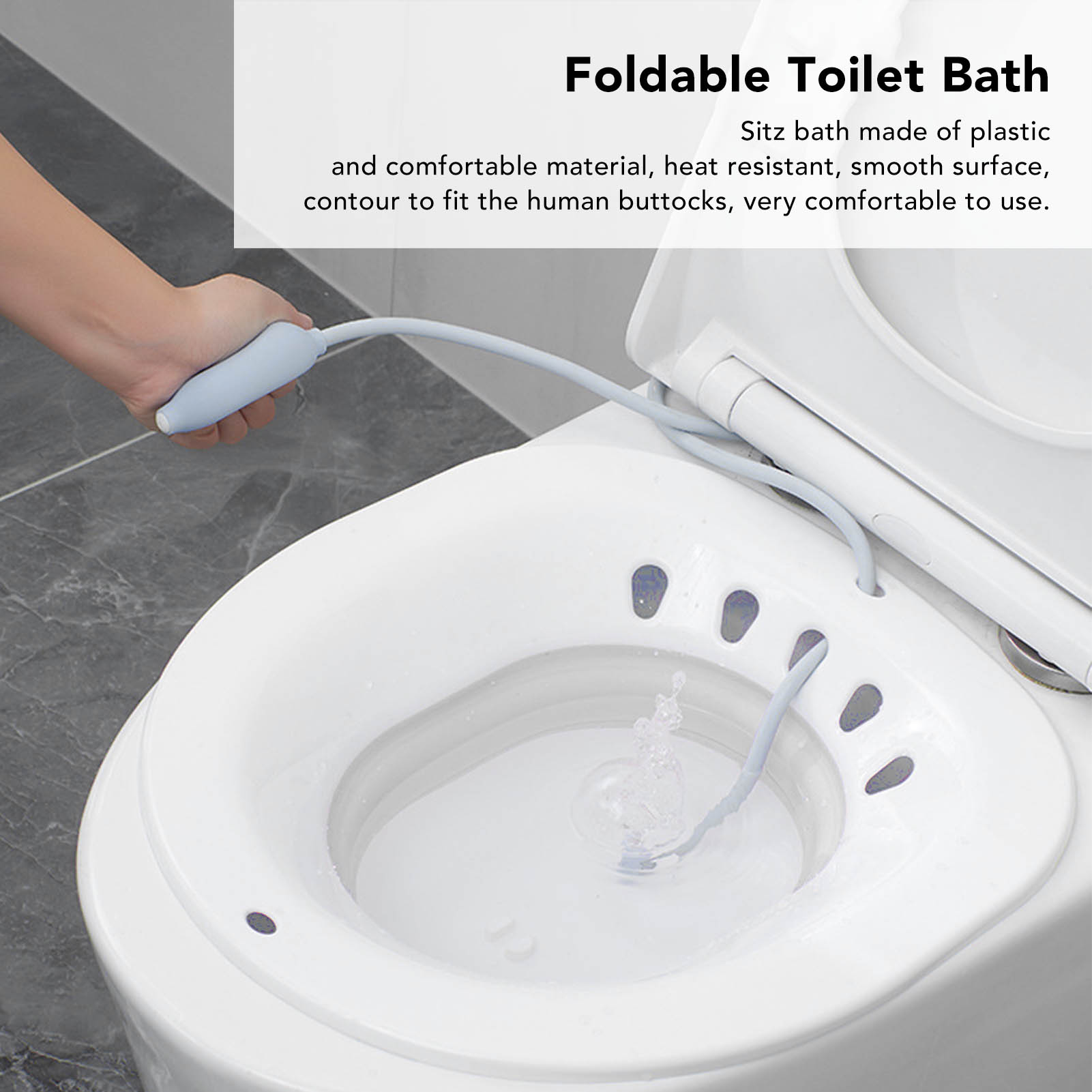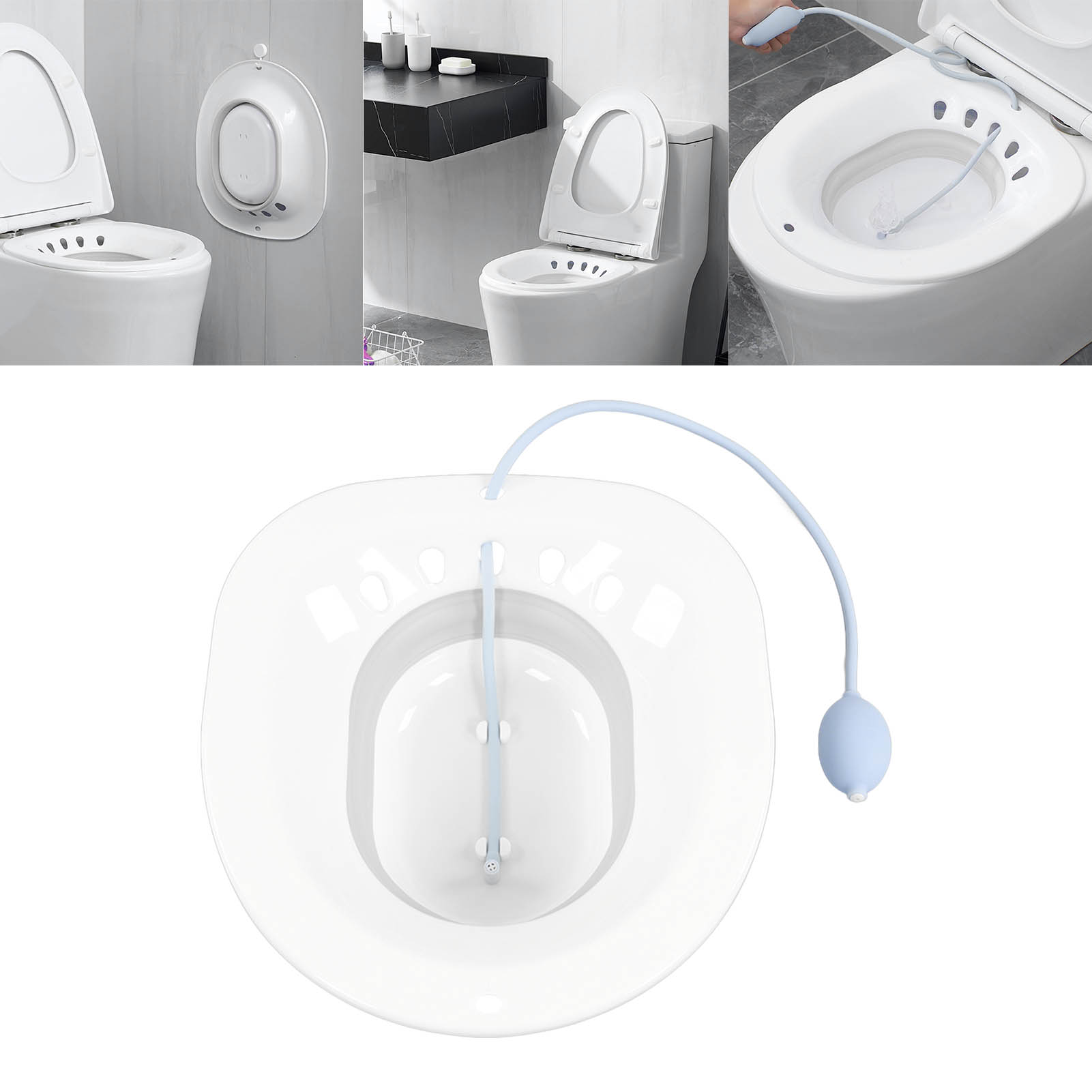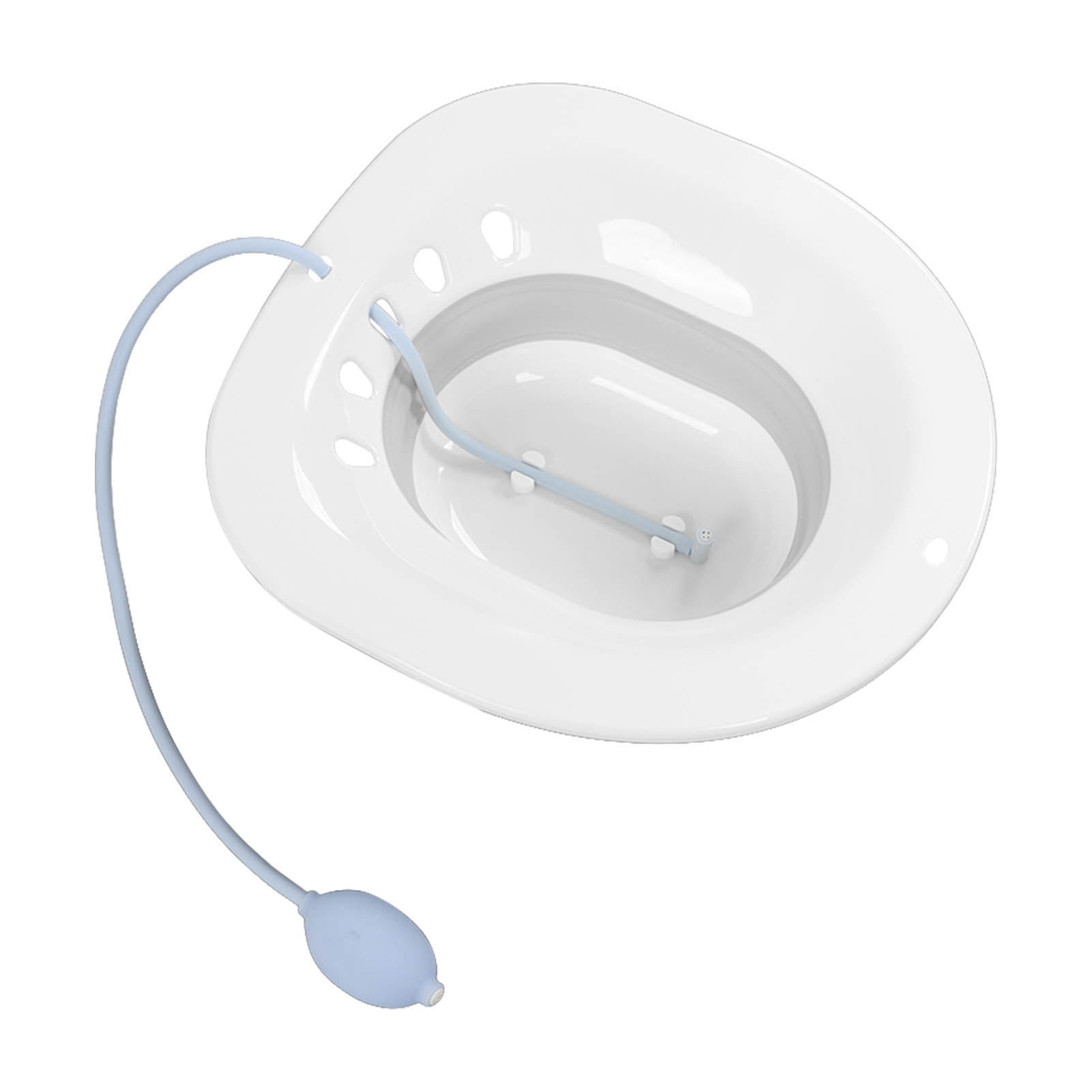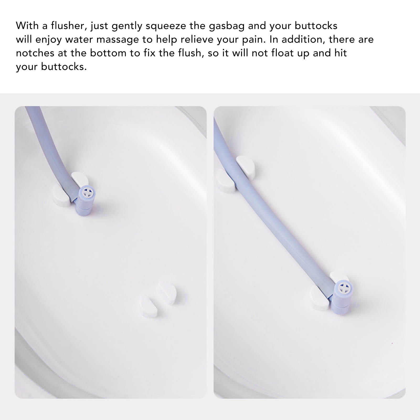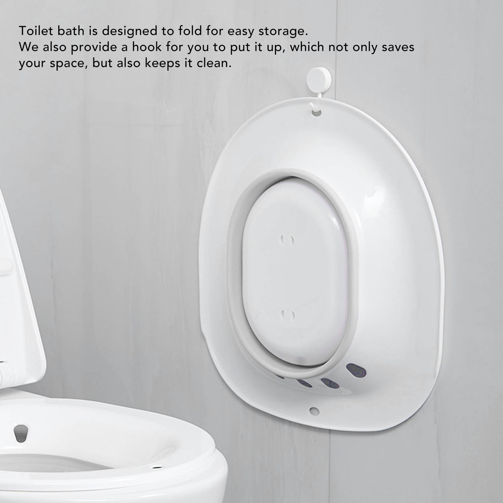 1、FOLDABLE: Toilet bath is designed to fold for easy storage. We also provide a hook for you to put it up, which not only saves your space, but also keeps it clean. 2、COMFORTABLE: Sitz bath made of plastic and comfortable material, heat resistant, smooth surface, contour to fit the human buttocks, very comfortable to use. 3、OVERFLOW PREVENTION: There are 5 water outlets at the back of the sitz bath. When the water level is too high, it will automatically flow into the toilet, so you don't have to worry about water overflowing and wetting the floor. 4、OWN CARE: Add warm water, mugwort and bath salts to the basin and sit and soak to help reduce pain. Suitable for postpartum, and prostatitis patients. Ideal for your own care routine! 5、WATER MASSAGE: With a flusher, just gently squeeze the gasbag and your buttocks will enjoy water massage to help relieve your pain. In addition, there are notches at the bottom to fix the flush, so it will not float up and hit your buttocks.