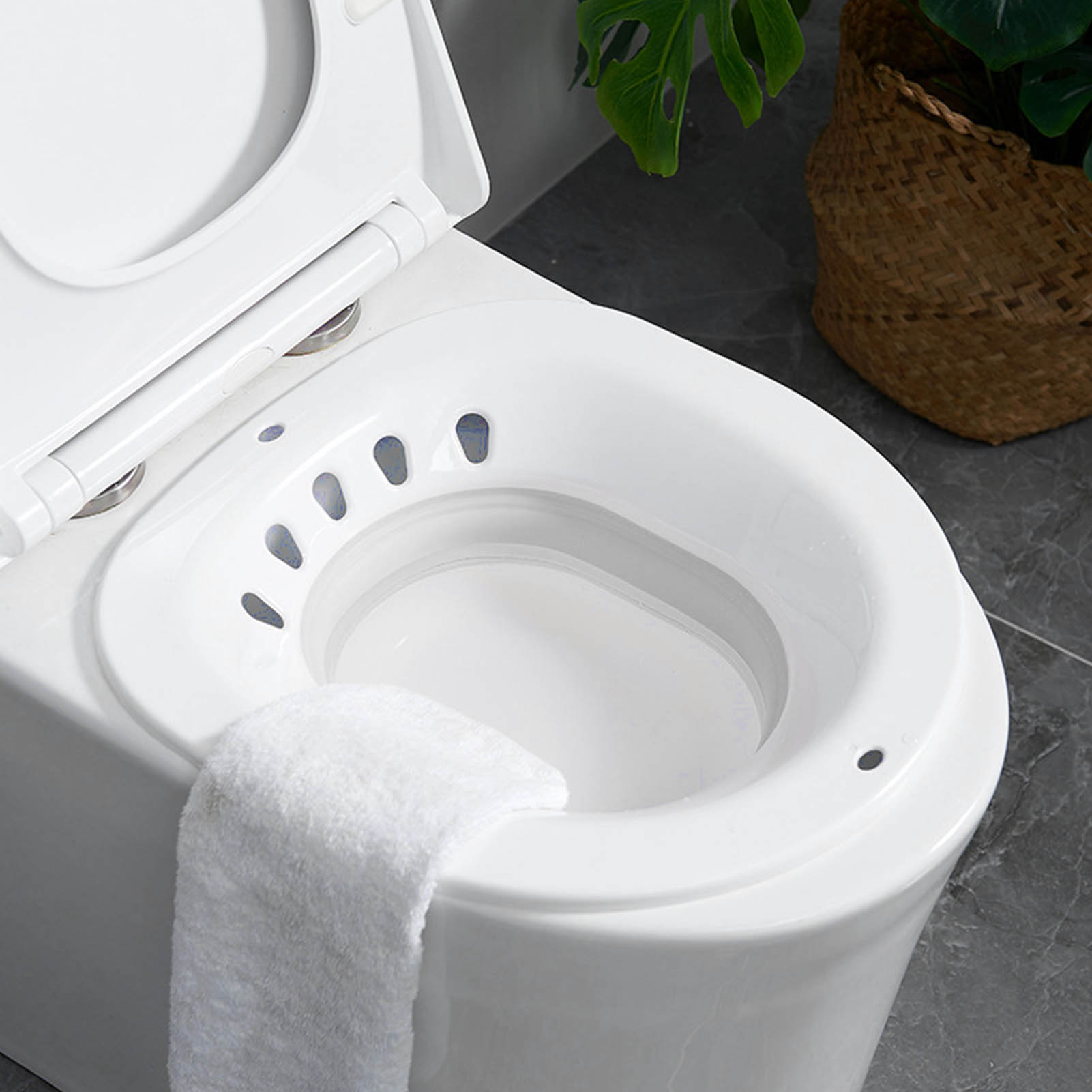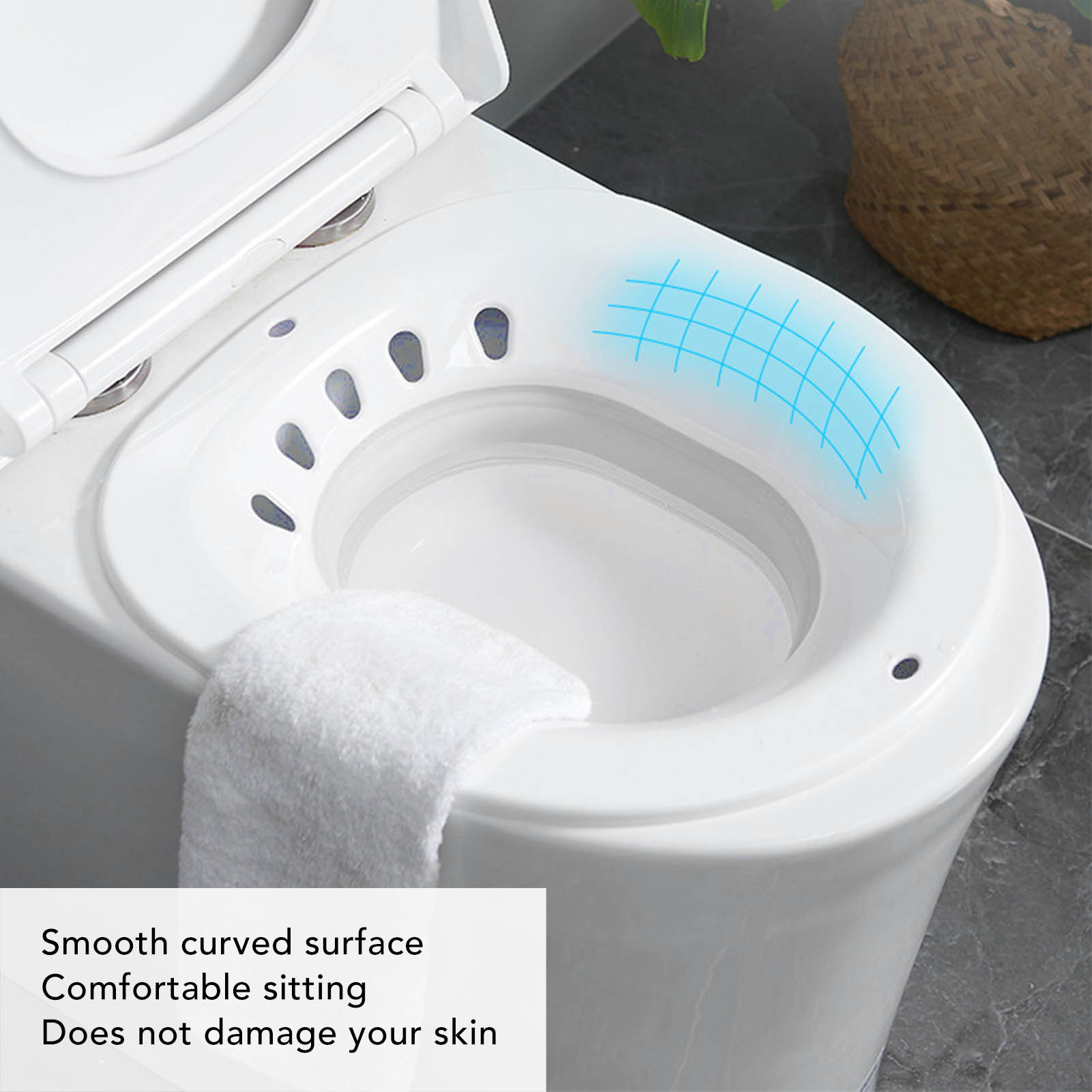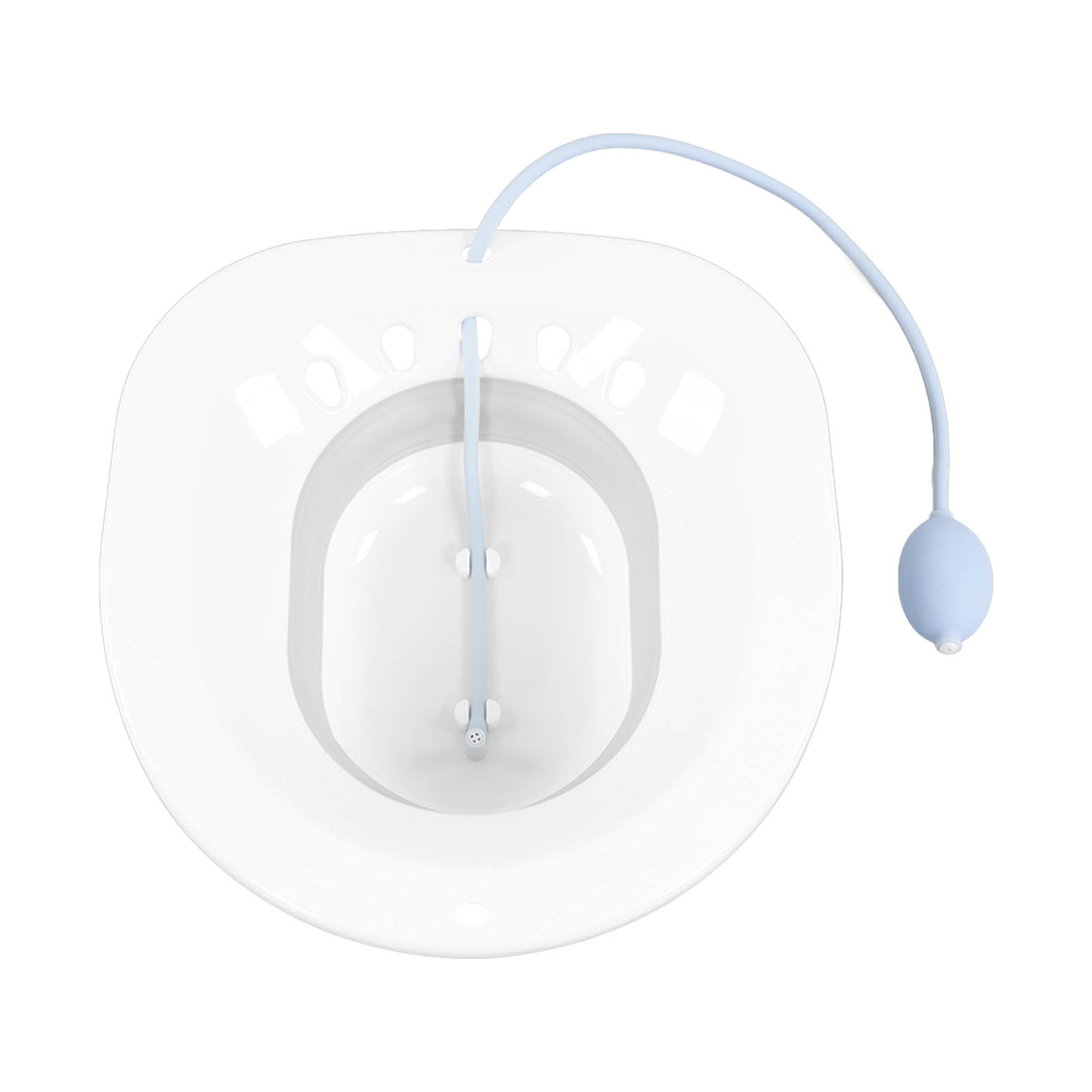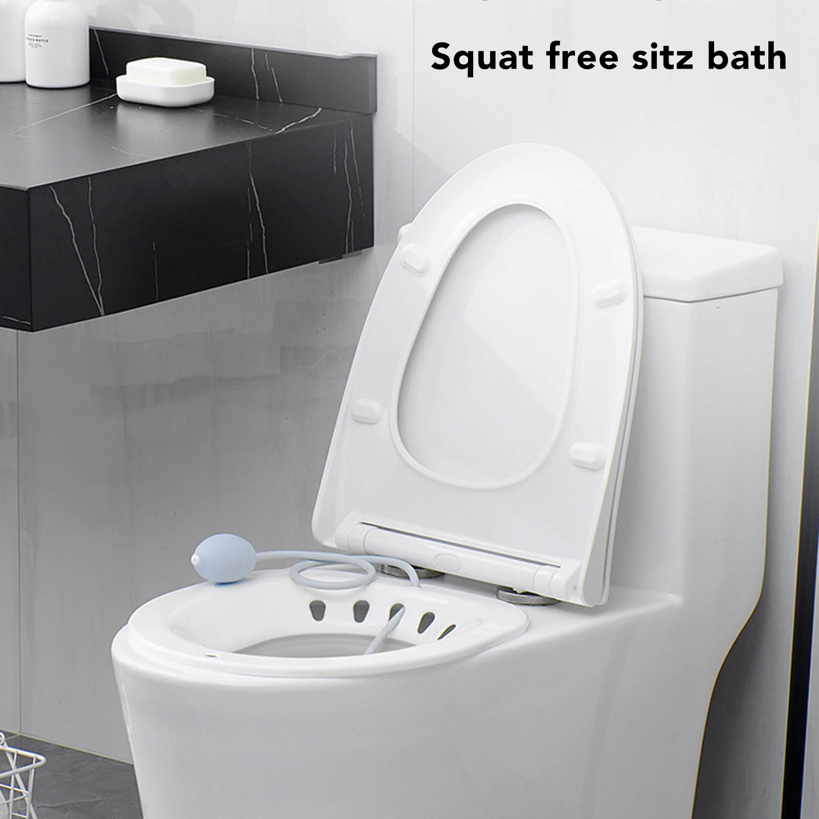 1、FOLDABLE: Toilet bath is designed to fold for easy storage. We also provide a hook for you to put it up, which not only saves your space, but also keeps it clean. 2、COMFORTABLE: Sitz bath made of plastic and comfortable material, heat resistant, smooth surface, contour to fit the human buttocks, very comfortable to use. 3、OVERFLOW PREVENTION: There are 5 water outlets at the back of the sitz bath. When the water level is too high, it will automatically flow into the toilet, so you don't have to worry about water overflowing and wetting the floor. 4、OWN CARE: Add warm water, mugwort and bath salts to the basin and sit and soak to help reduce pain. Suitable for postpartum, and prostatitis patients. Ideal for your own care routine! 5、WATER MASSAGE: With a flusher, just gently squeeze the gasbag and your buttocks will enjoy water massage to help relieve your pain. In addition, there are notches at the bottom to fix the flush, so it will not float up and hit your buttocks.