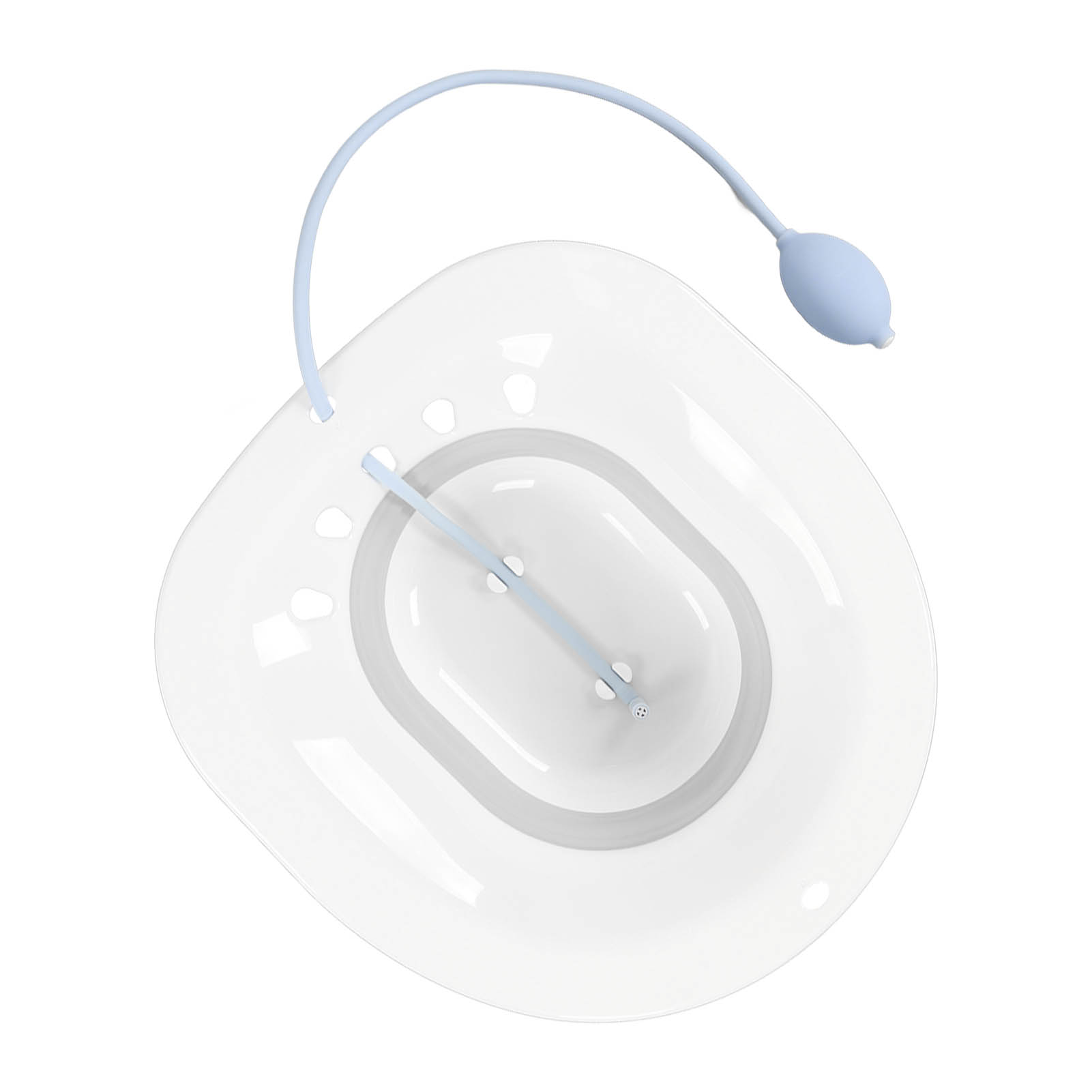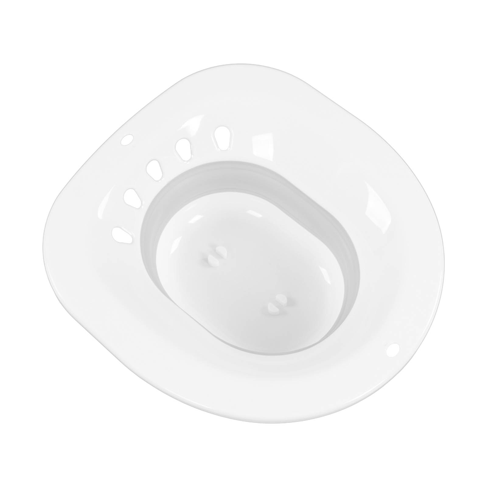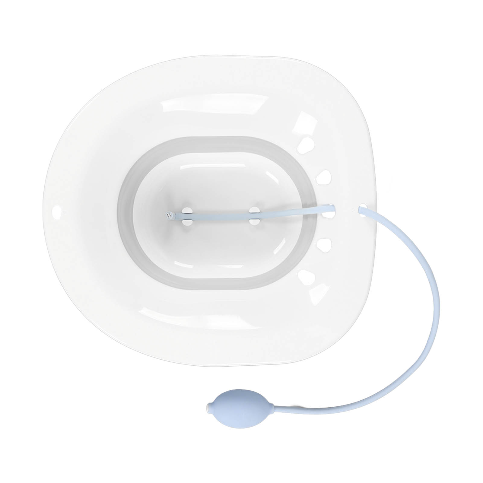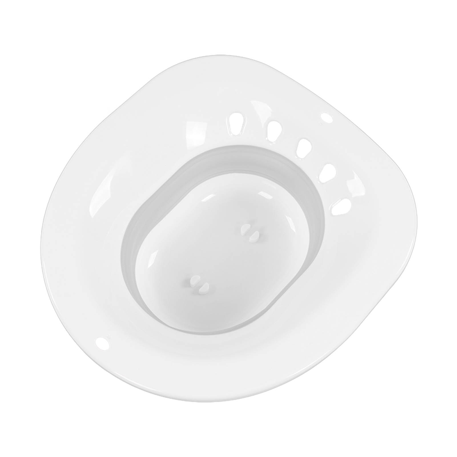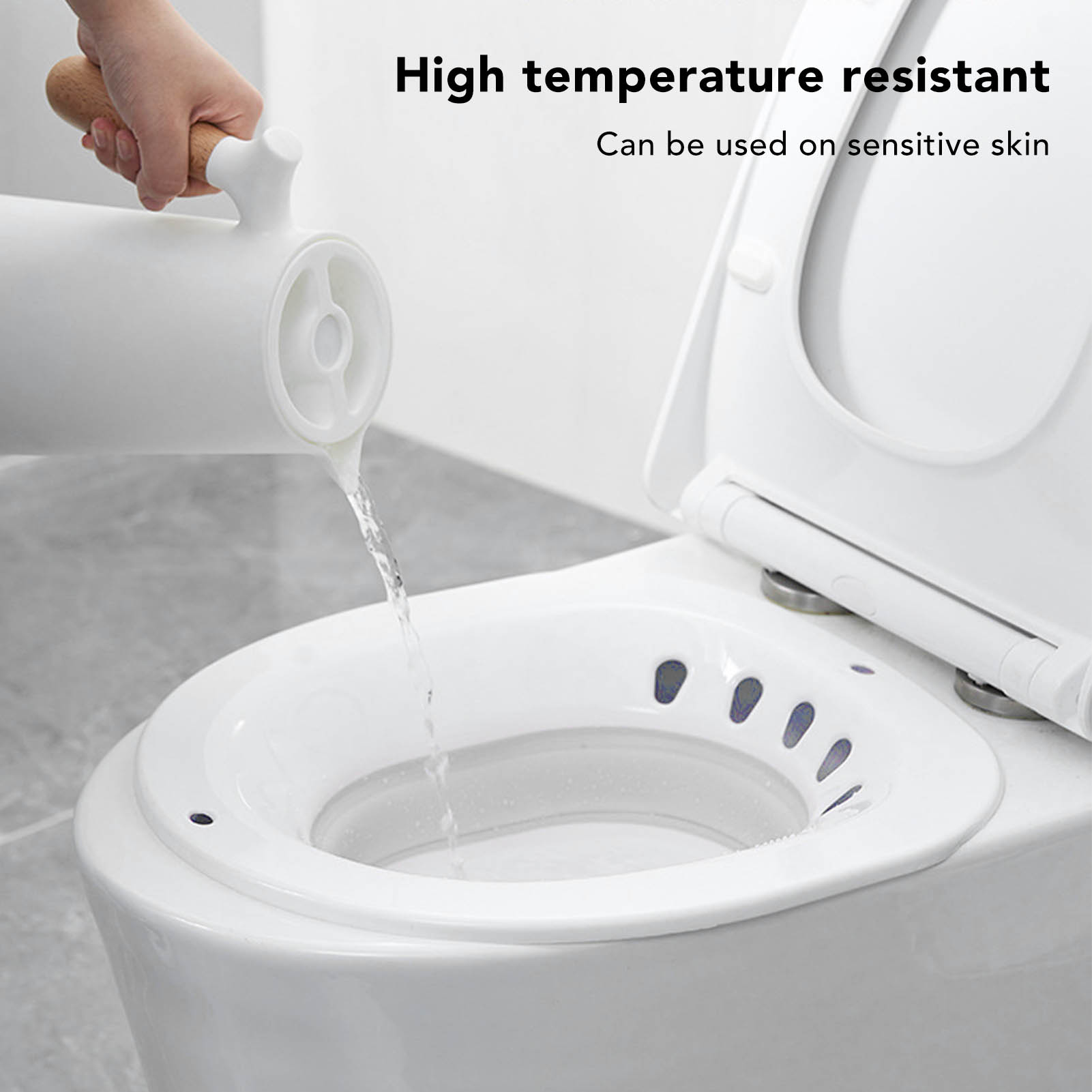 1、FOLDABLE: Toilet bath is designed to fold for easy storage. We also provide a hook for you to put it up, which not only saves your space, but also keeps it clean. 2、COMFORTABLE: Sitz bath made of plastic and comfortable material, heat resistant, smooth surface, contour to fit the human buttocks, very comfortable to use. 3、OVERFLOW PREVENTION: There are 5 water outlets at the back of the sitz bath. When the water level is too high, it will automatically flow into the toilet, so you don't have to worry about water overflowing and wetting the floor. 4、OWN CARE: Add warm water, mugwort and bath salts to the basin and sit and soak to help reduce pain. Suitable for postpartum, and prostatitis patients. Ideal for your own care routine! 5、WATER MASSAGE: With a flusher, just gently squeeze the gasbag and your buttocks will enjoy water massage to help relieve your pain. In addition, there are notches at the bottom to fix the flush, so it will not float up and hit your buttocks.