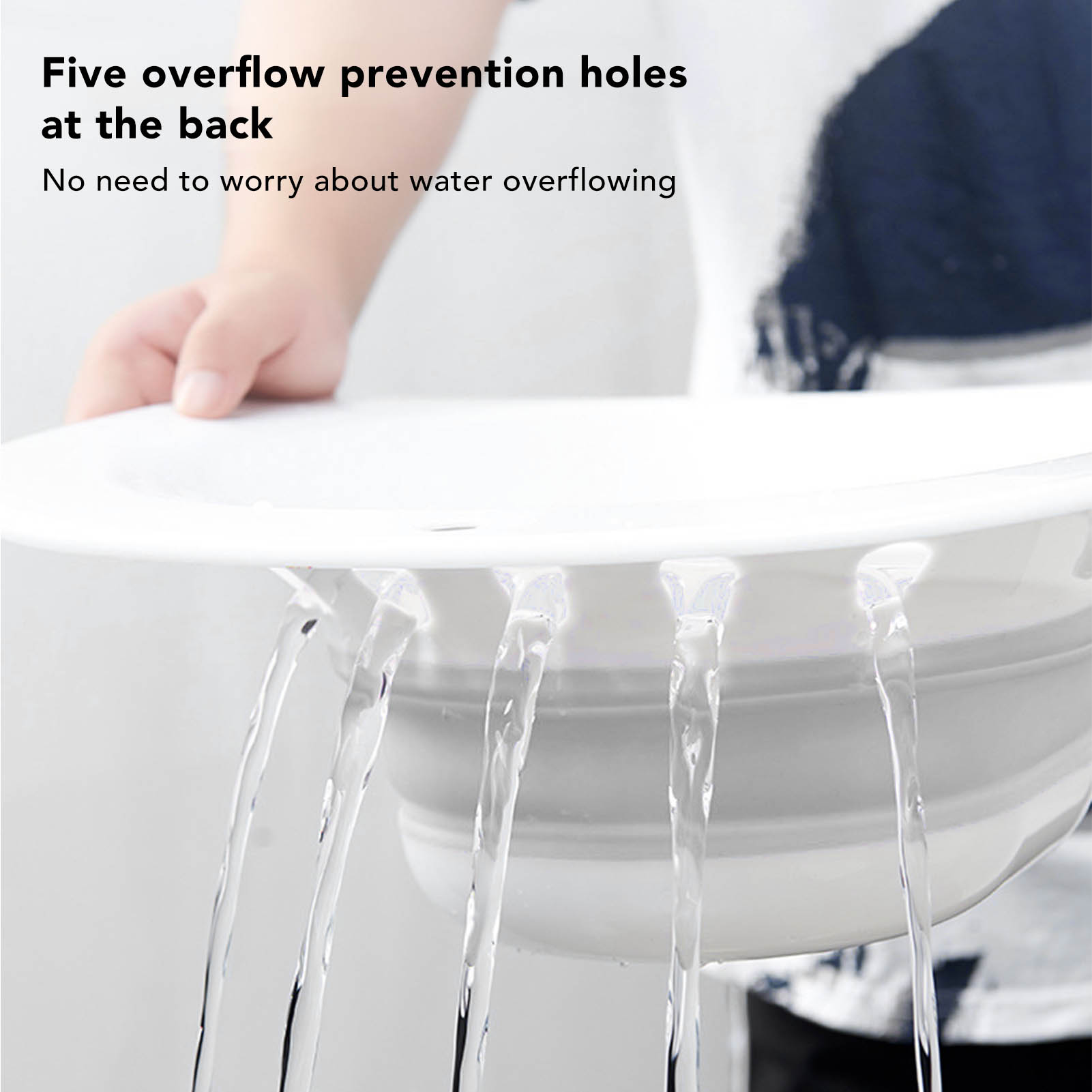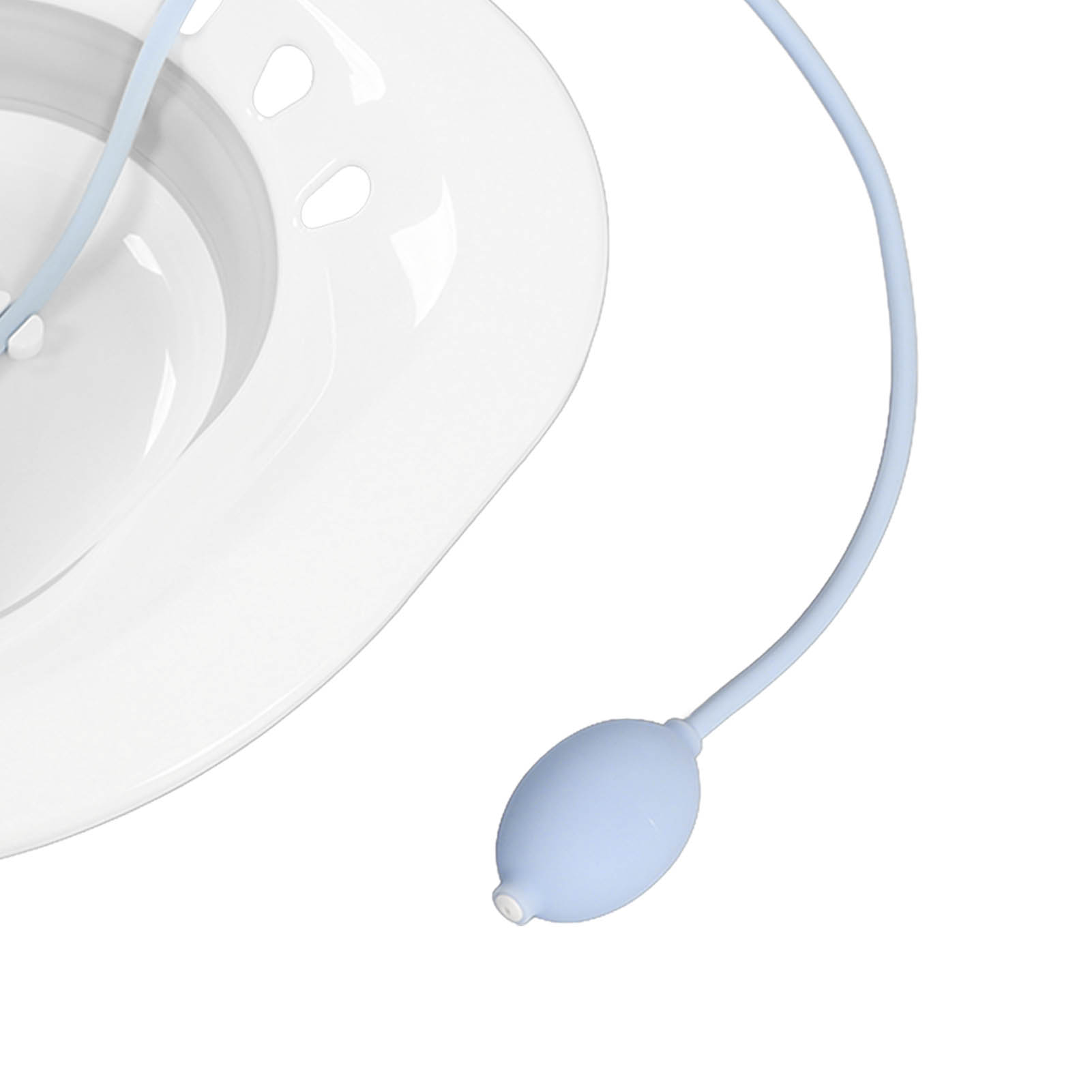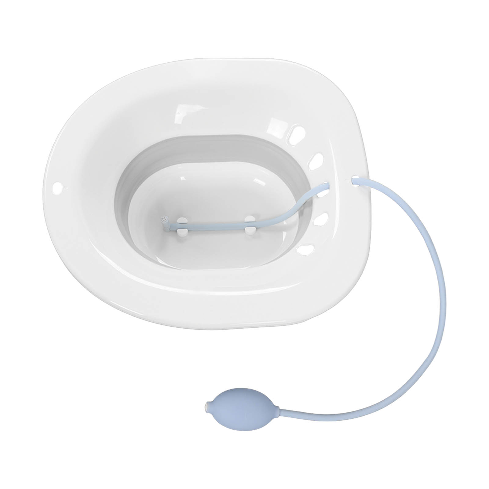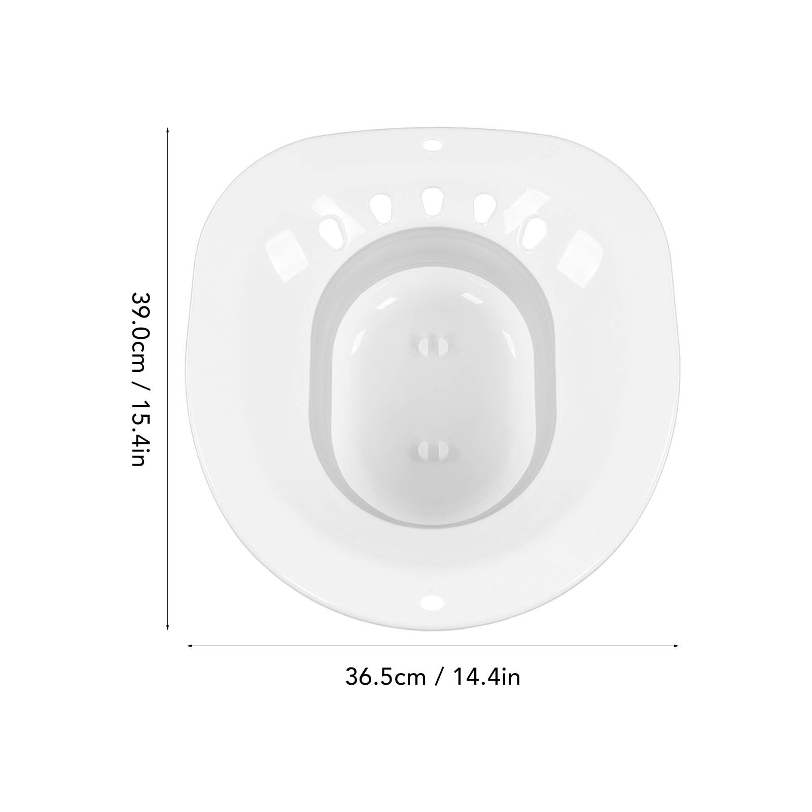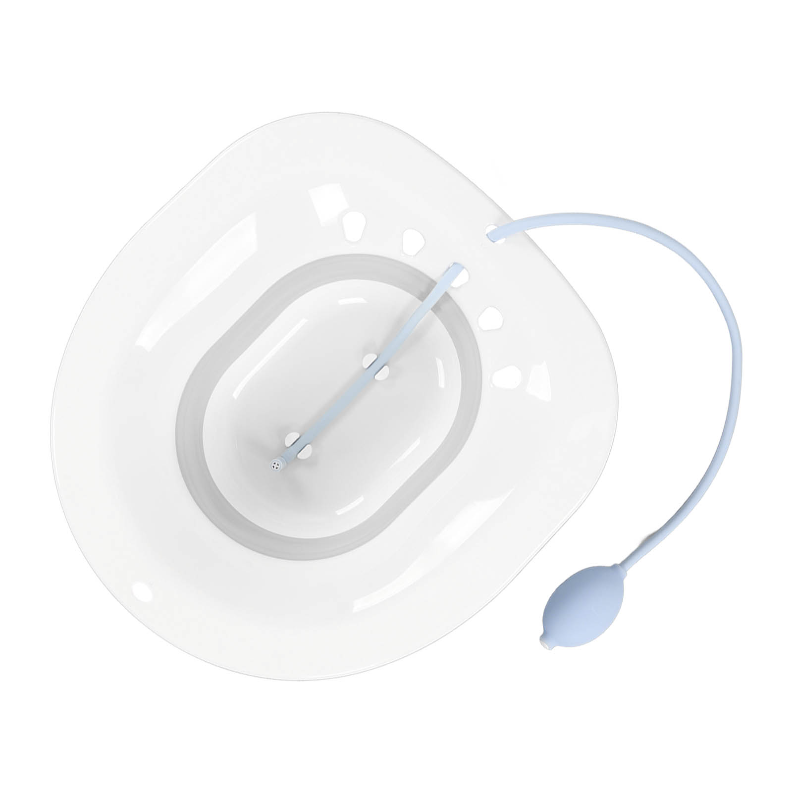 1、FOLDABLE: Toilet bath is designed to fold for easy storage. We also provide a hook for you to put it up, which not only saves your space, but also keeps it clean. 2、COMFORTABLE: Sitz bath made of plastic and comfortable material, heat resistant, smooth surface, contour to fit the human buttocks, very comfortable to use. 3、OVERFLOW PREVENTION: There are 5 water outlets at the back of the sitz bath. When the water level is too high, it will automatically flow into the toilet, so you don't have to worry about water overflowing and wetting the floor. 4、OWN CARE: Add warm water, mugwort and bath salts to the basin and sit and soak to help reduce pain. Suitable for postpartum, and prostatitis patients. Ideal for your own care routine! 5、WATER MASSAGE: With a flusher, just gently squeeze the gasbag and your buttocks will enjoy water massage to help relieve your pain. In addition, there are notches at the bottom to fix the flush, so it will not float up and hit your buttocks.
