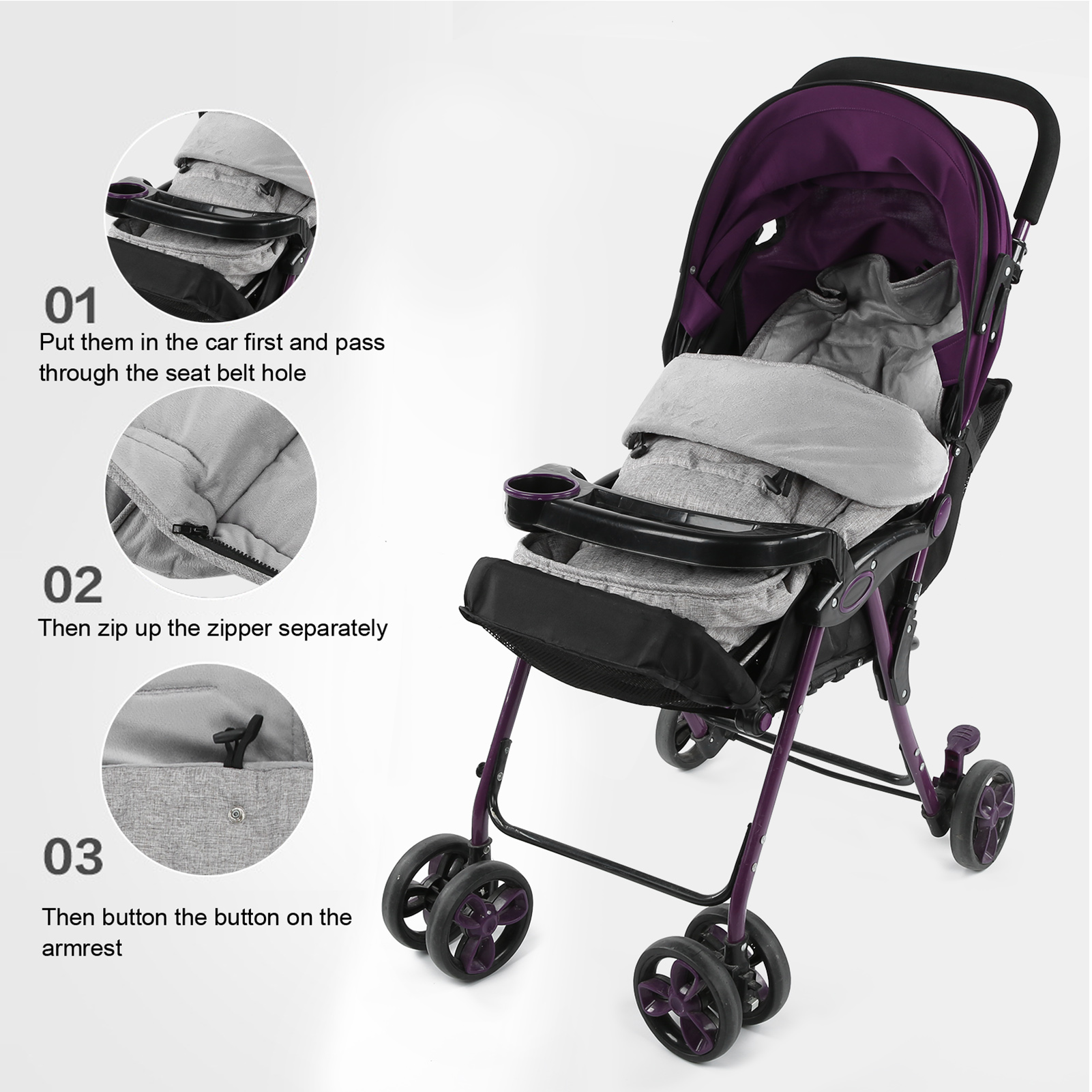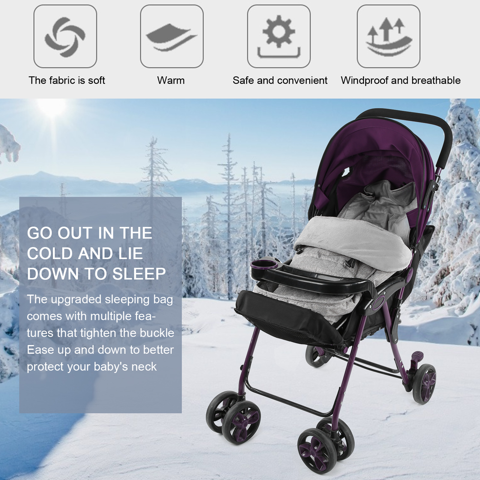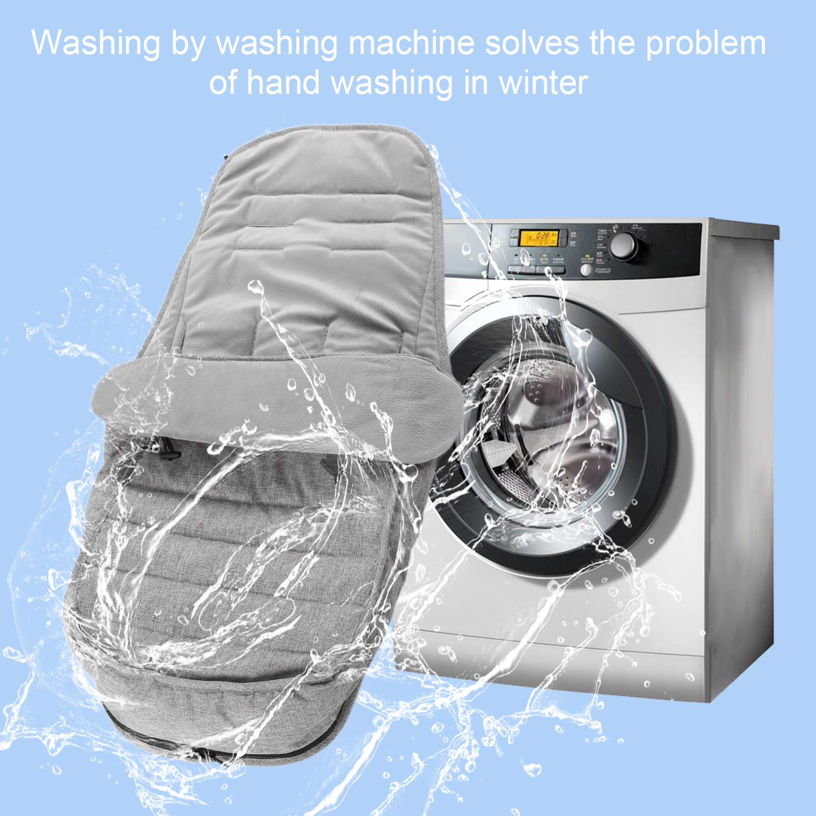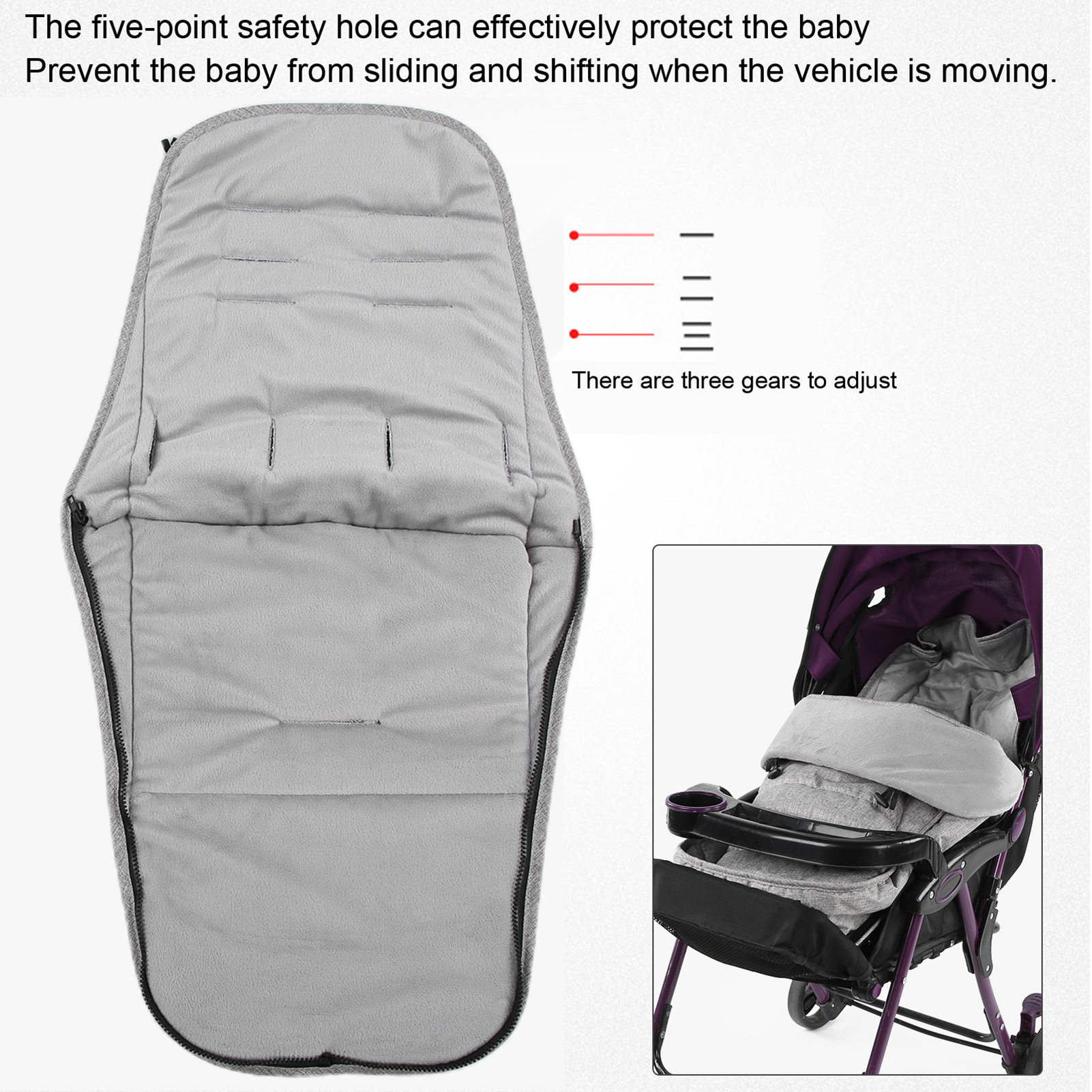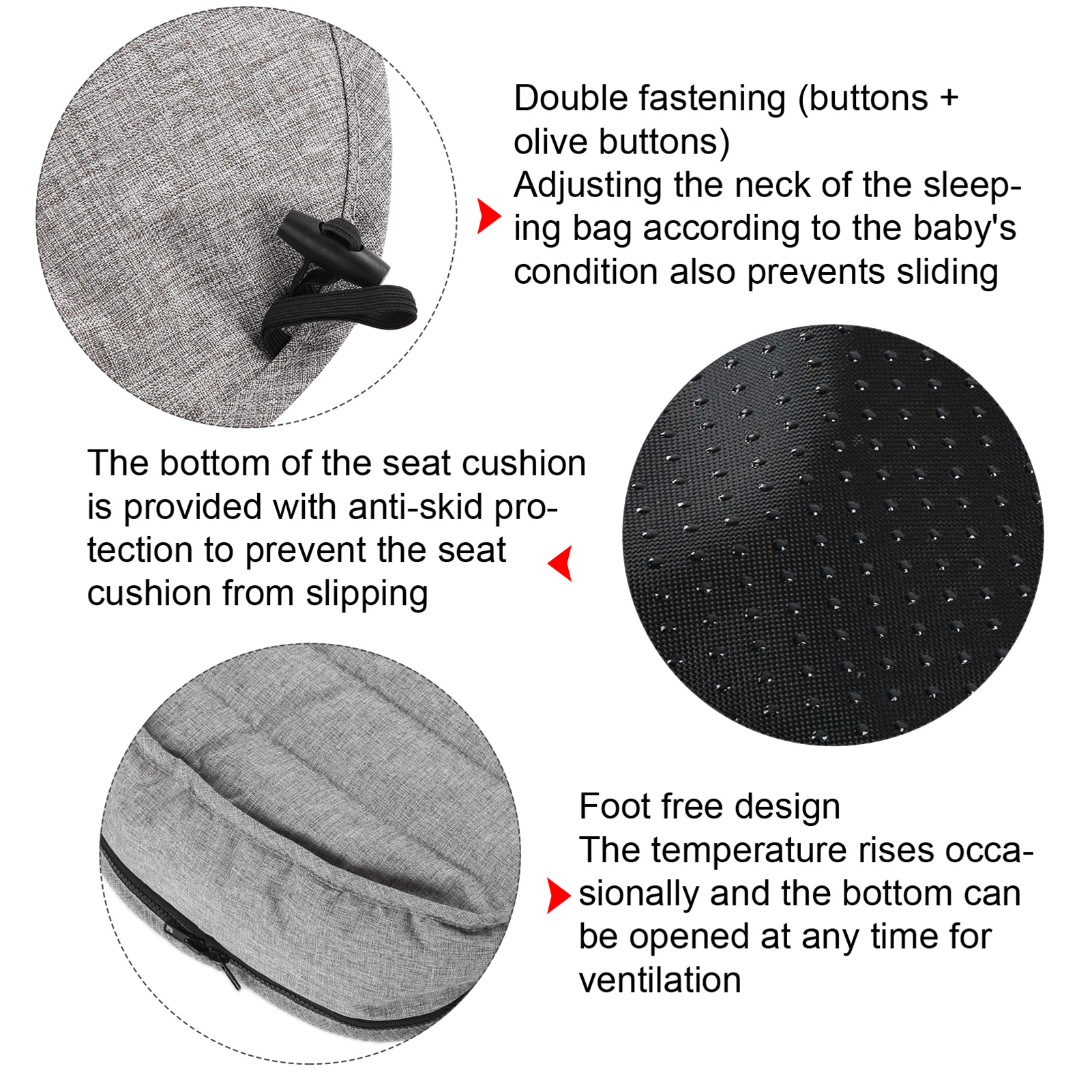 1、Waterproof, windproof and dirt proof, it protect your child in cold and rainy weather and soft wool stuffing can adjust the temperature and drain the water, keeping your child dry and warm. 2、With 11 reserved slots, it is suitable for 3 or 5 point seatbelt strollers and can be fixed to the stroller, 100% Safe and adjustable. 3、The non‑slip nail on the back of the foot cover prevents the foot cover from slipping. 4、Machine washable and accompanying with extra waterproof storage bag, the folding sleeping bags are easy to carry. 5、The five‑point safety hole can effectively protect the baby and prevent the baby from sliding and shifting when the vehicle is moving.