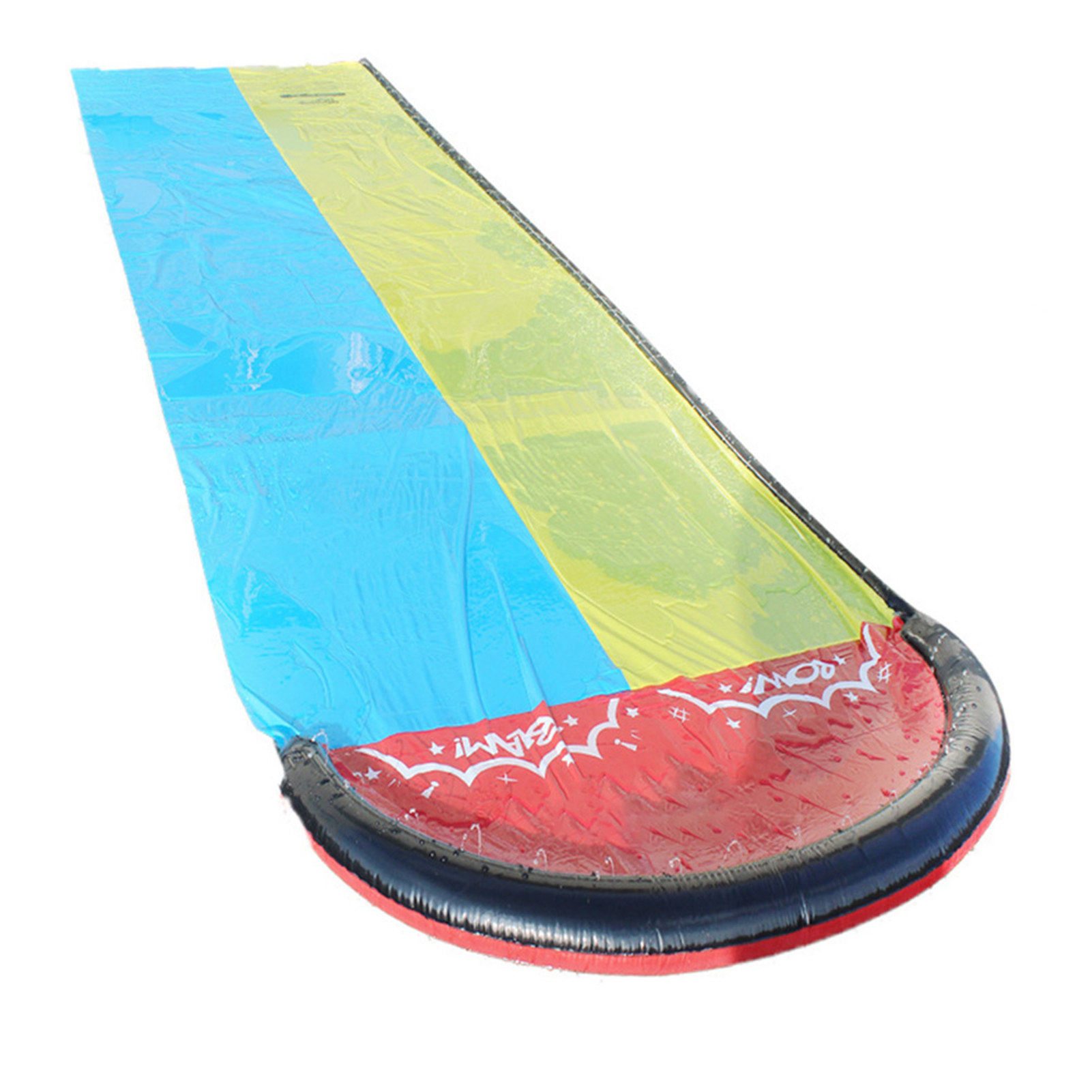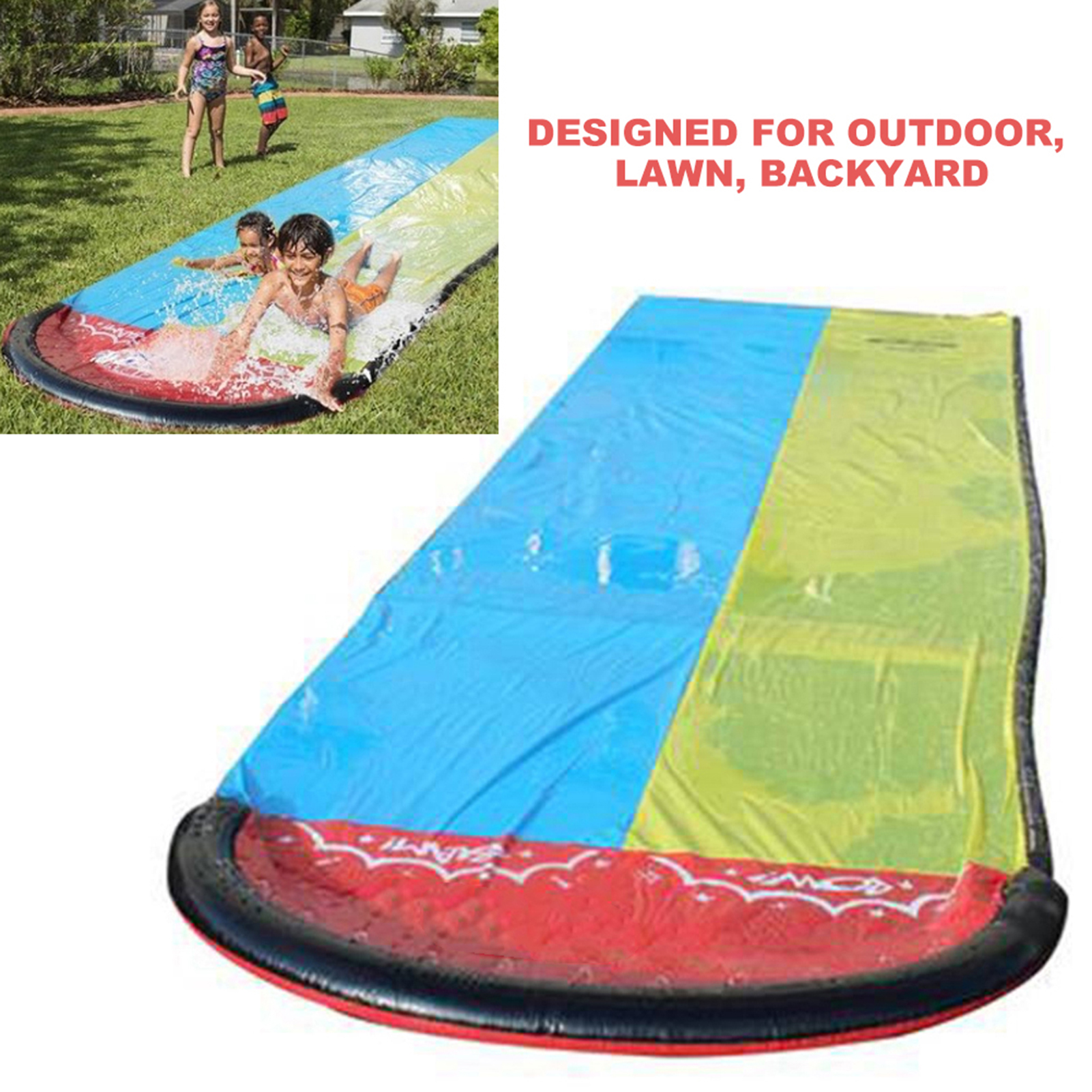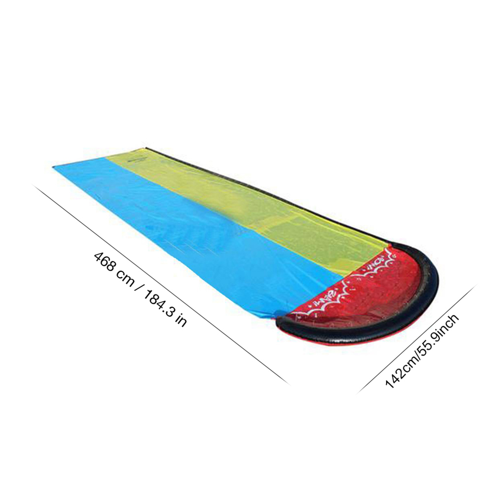 1、Designed for outdoor, lawn, backyard and has plenty of space, about 468cm / 184.3in long and 142cm / 55.9in wide. 2、Dual color playing track with sprinkler bumpers and a splashing pool. 3、The slide is equipped with a built-in body board to provide protection from sliding off and an air cushion to help prevent sliding. 4、Easy to use, the end of the slide is equipped with a water hose attachment to connect the water to the slide. 5、Great for fun, can be used by children and adults, can be used in family gatherings, your child's birthday parties and other occasion.
