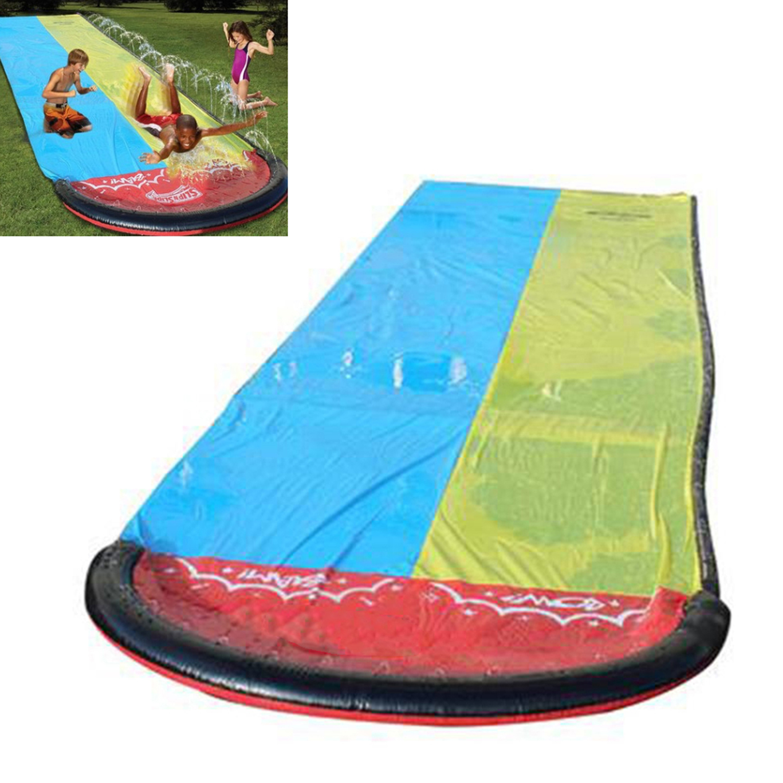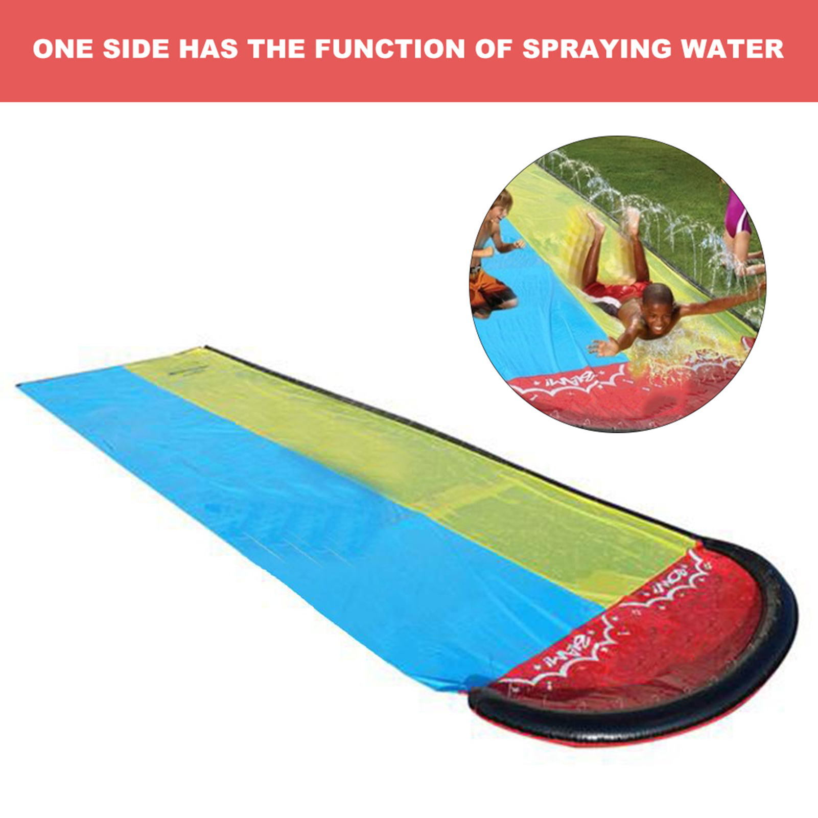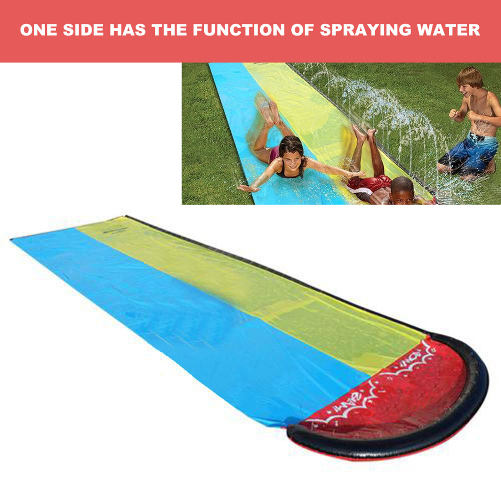 1、Designed for outdoor, lawn, backyard and has plenty of space, about 468cm / 184.3in long and 142cm / 55.9in wide. 2、Dual color playing track with sprinkler bumpers and a splashing pool. 3、The slide is equipped with a built-in body board to provide protection from sliding off and an air cushion to help prevent sliding. 4、Easy to use, the end of the slide is equipped with a water hose attachment to connect the water to the slide. 5、Great for fun, can be used by children and adults, can be used in family gatherings, your child's birthday parties and other occasion.