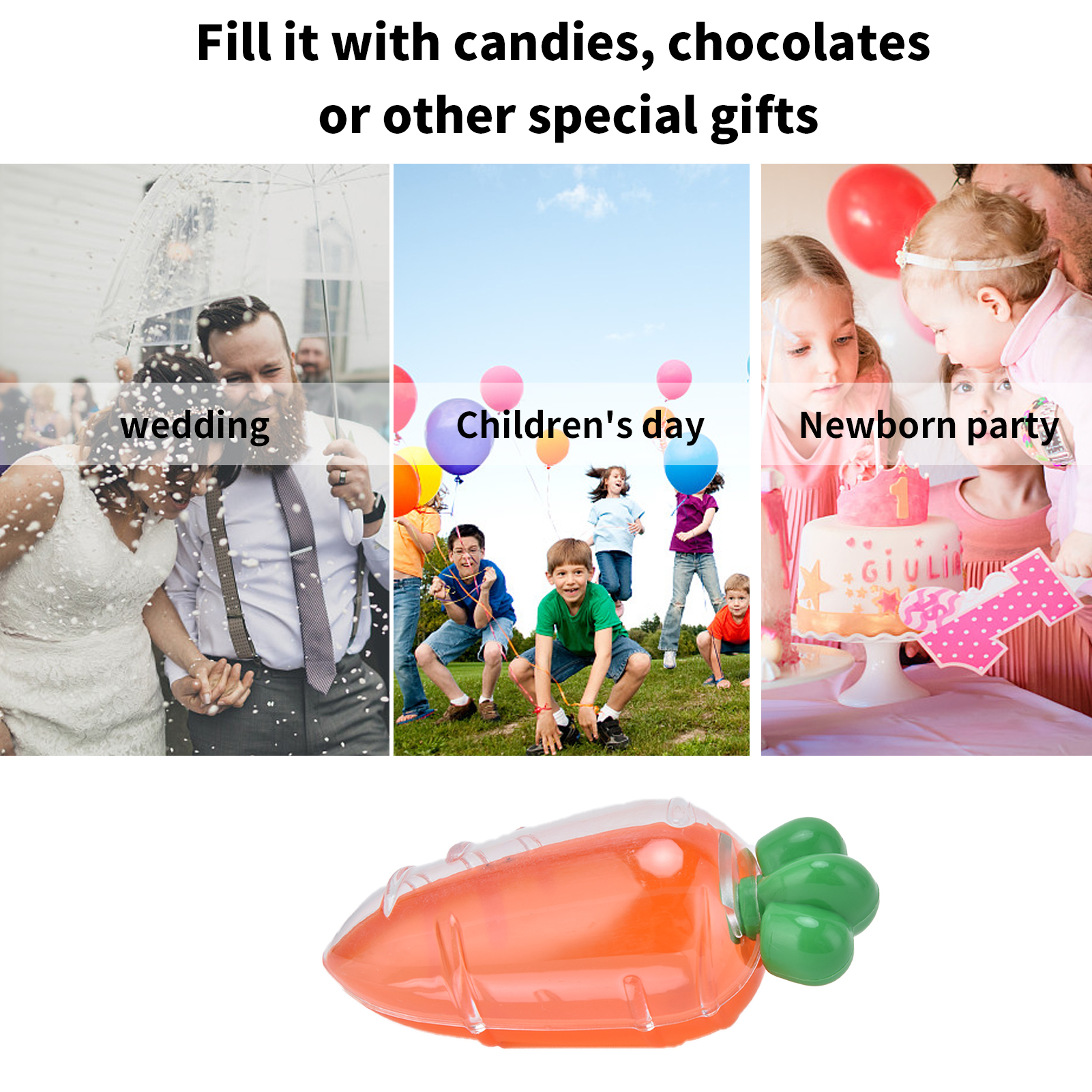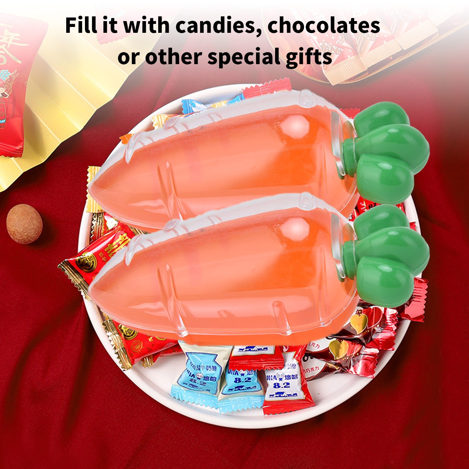1、Used for weddings, children's day, newborn parties, baby hundred‑day celebrations, birthday parties and other festive occasion. 2、The storage box is small in size, light in weight, portable and easy to carry and store. 3、The box is strong and durable, can withstand daily wear and tear, and is not easy to break or deform. 4、Smooth and round, bright color, strong sealing performance, can be opened and closed. 5、The appearance has a carrot shape design, and it can be filled with candies, chocolates, etc.