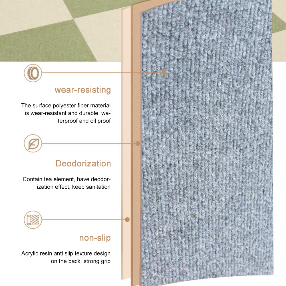 1、The surface layer is made of polyester fiber, wear-resistant, non-slip, water and oil repellent. The middle layer contains tea ingredients and has the function of deodorizing. The bottom layer is made of acrylic resin, with a non-slip texture design, strong grip, and self-adhesive without glue. 2、 The thin and light design does not affect the door opening and closing, and the sweeping robot can also pass easily, which is convenient for cleaning the vacuum cleaner. 3、 It can be cut at will according to the site, and the cutting surface is not open. It is convenient to lay corners or corners. It is widely used in living rooms, bedrooms, study rooms, restaurants, kitchens, balconies, children's rooms, commercial places, etc. 4、 Can be used multiple times and supports machine wash.