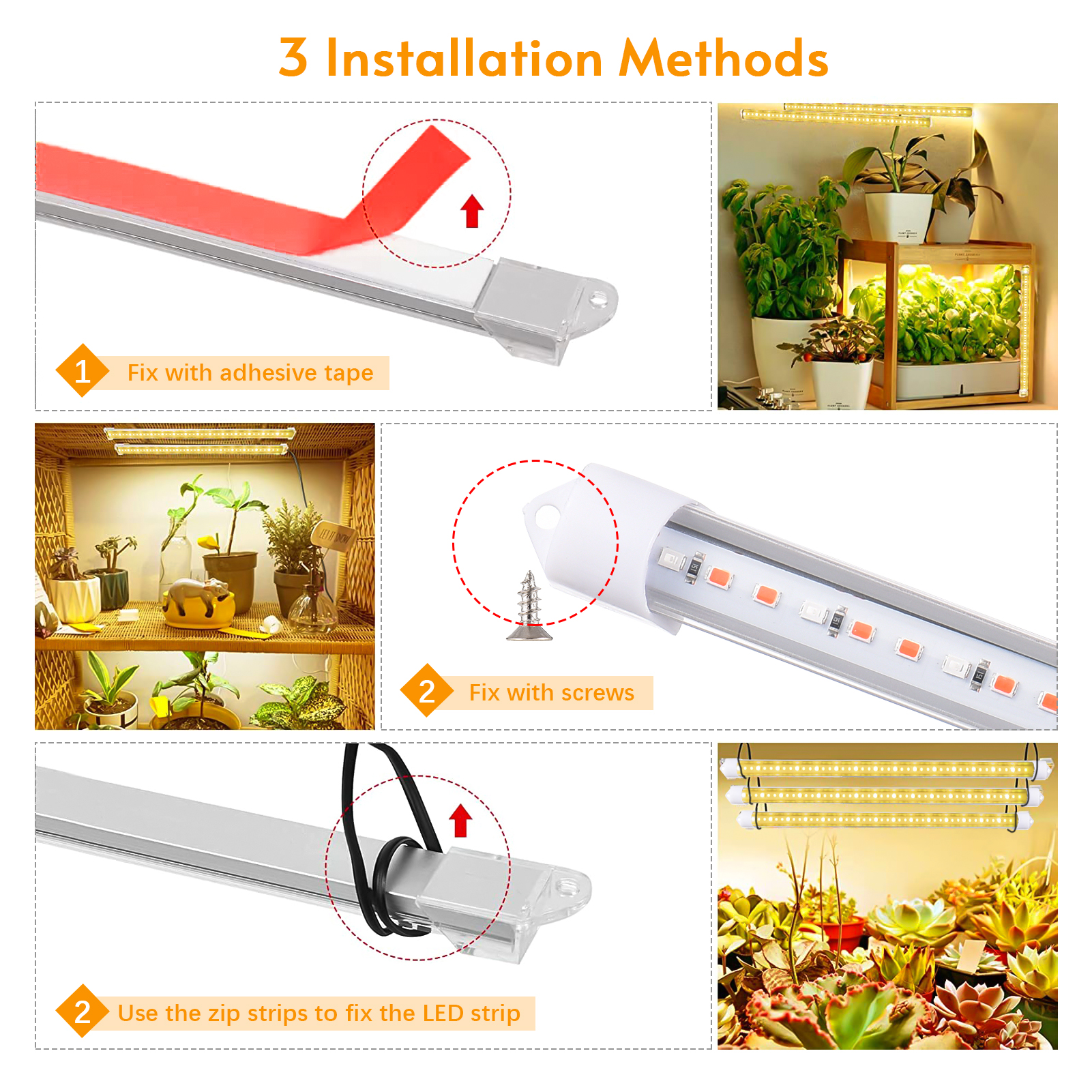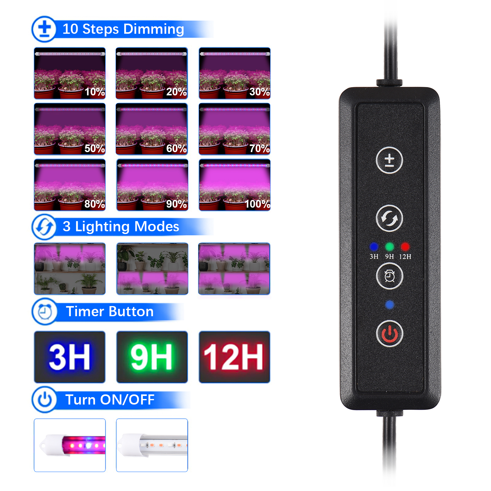1、【Full Spectrum Grow Light】Emitting wavelengths from 380nm to 800nm that cloest to natural light, so it can speed up photosynthesis to promote fast growth of indoor plants. 2、【10 Adjustable Dimmable Levels \u0026 3 Working Modes】This LED grow lights have 10 adjustable brightness levels from 10% to 100% to meet various stages of plant growth, 3 Lighting Spectrum modes for you to choose: 3/3/6 light strips on or off to control. 3、【Auto Turn On / Off Timer】This led grow light strips has a memory function which can be set up to turn off after 3H/6H/12H, it could automatically turn on and off at the same time the next day.