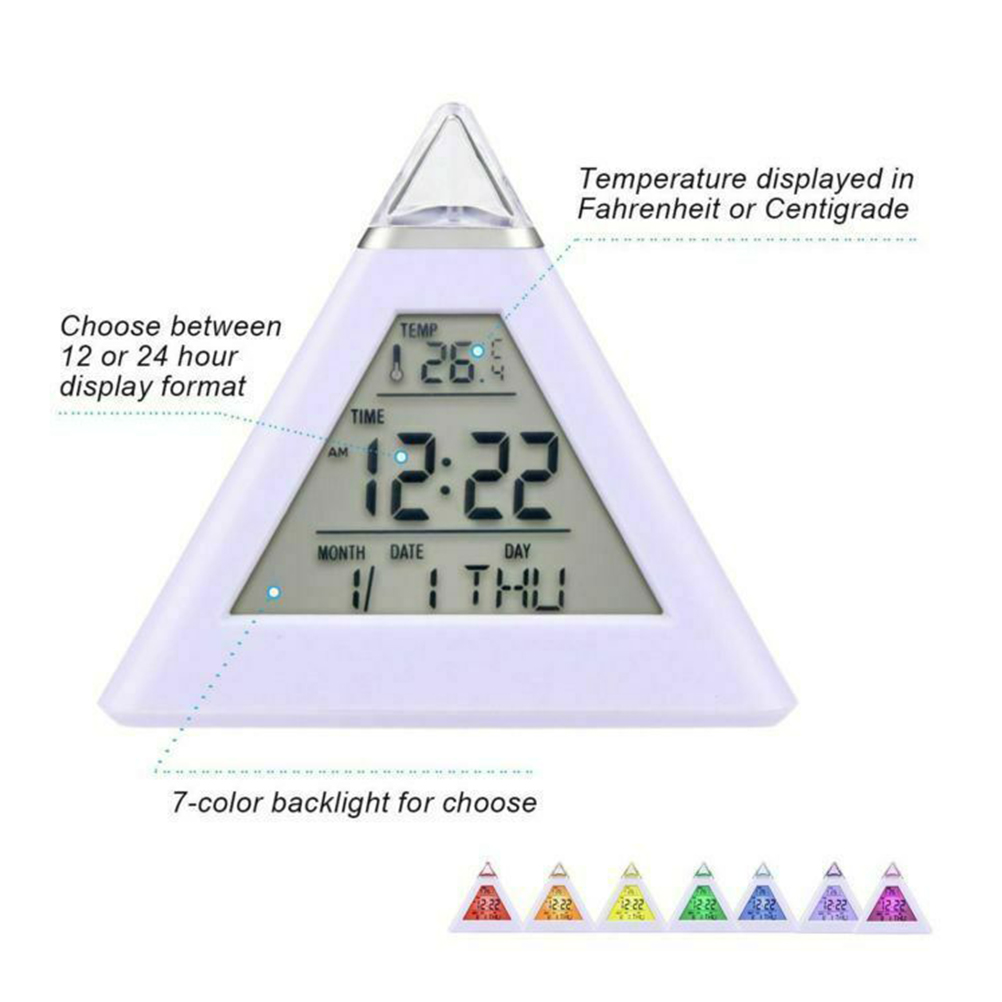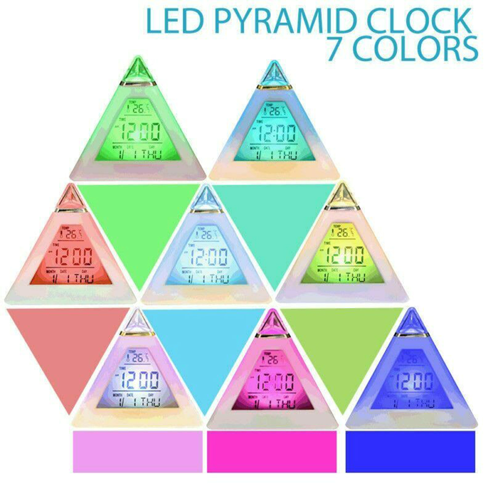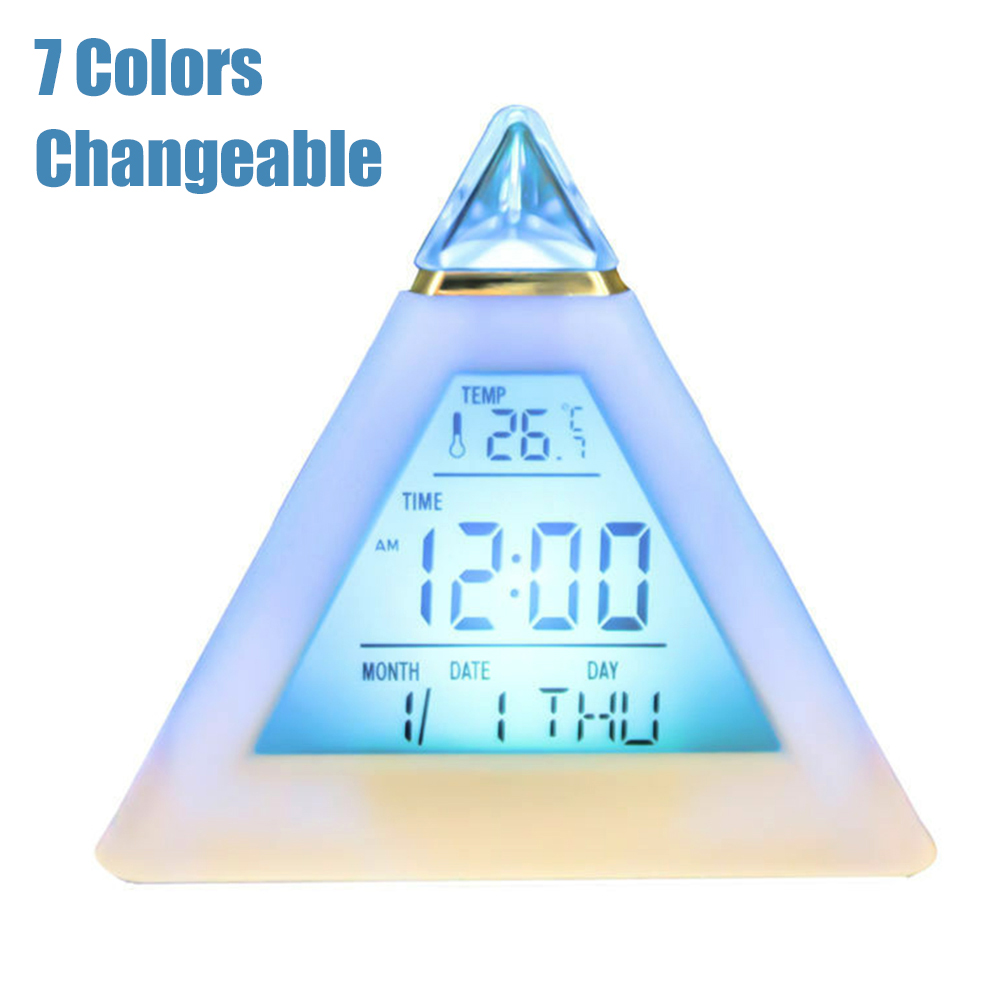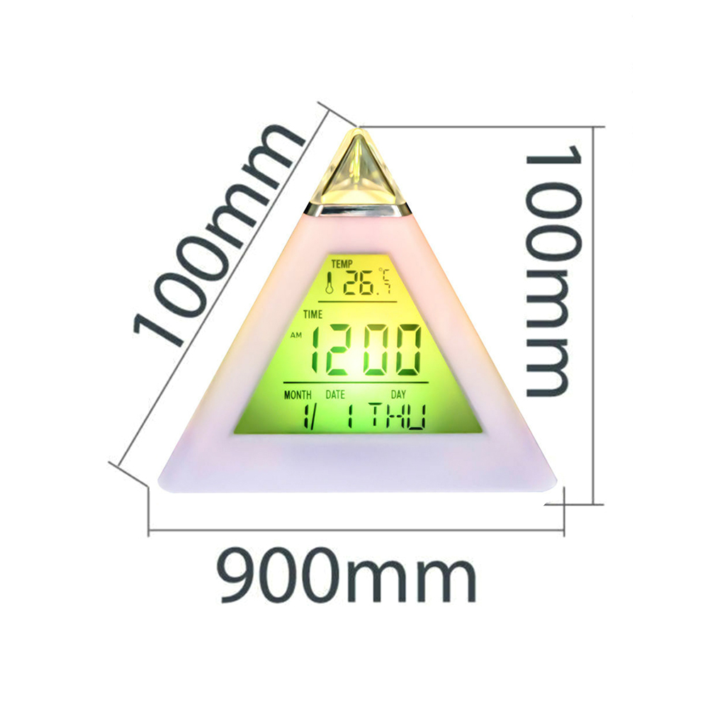 1、100% Brand new and high quality. 2、 -Pyramid-shaped 7 LED color changing alarm clock. 3、 - Displays temperature time, date (from 2000 to 2099), day. 4、 -12/24 hours format and C/F conversion are alternatives. 5、 -Timing alarm. 6、 -Can be placed in the car, office and home. 7、 -This clock has a music alarm clock and sleepyhead mode. 8、 -Temperature Mode: Sensing the environment temperature automatically, and this alarm clock can make the interconversion between Celsius and Fahrenheit temperature.