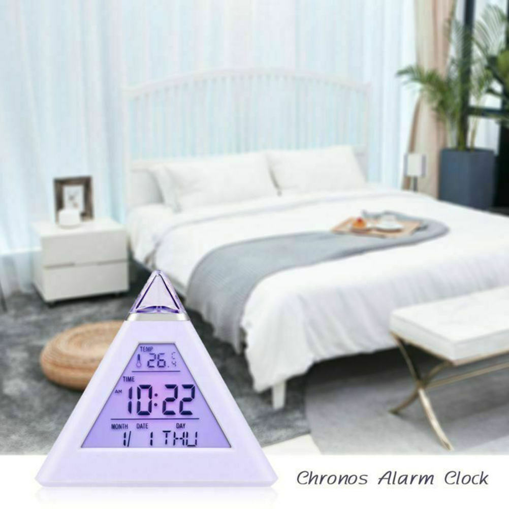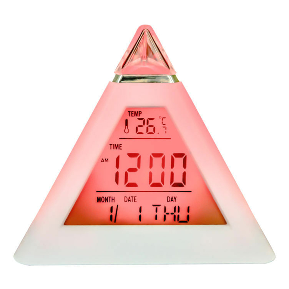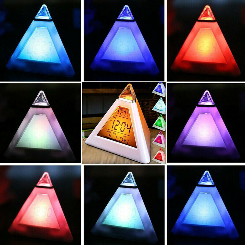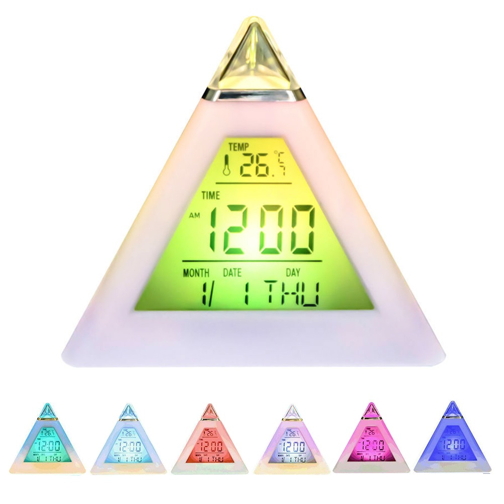 1、100% Brand new and high quality. 2、 -Pyramid-shaped 7 LED color changing alarm clock. 3、 - Displays temperature time, date (from 2000 to 2099), day. 4、 -12/24 hours format and C/F conversion are alternatives. 5、 -Timing alarm. 6、 -Can be placed in the car, office and home. 7、 -This clock has a music alarm clock and sleepyhead mode. 8、 -Temperature Mode: Sensing the environment temperature automatically, and this alarm clock can make the interconversion between Celsius and Fahrenheit temperature.