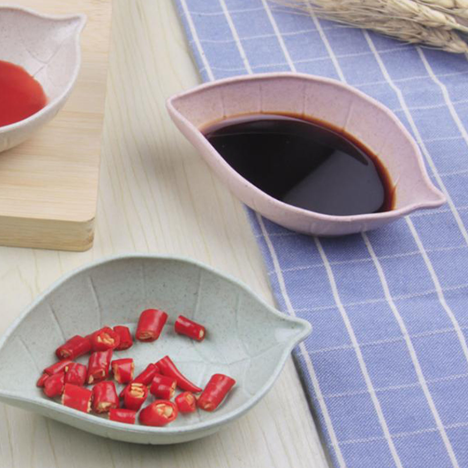 1、Versatile Usage: Leaf shaped dish has a wide range of usage and is perfect for holding soy sauce, chili, side dishes, and more. 2、Leaf Shaped: Simple and fashionable, sauce dishes have a leaf shape, which is able to add a refreshing and stylish touch to your dining table. 3、Refreshing Color: Available in Nordic inspired colors, snack plate dish can make a beautiful scenery on your dining table. 4、Premium Material: Made from high grade wheat orange straw, seasoning dish ensures safe usage while being environmentally protective. 5、Easy to Clean: Leaf snack tray with fine craftsmanship is designed to be easy to use and clean, which is convenient and practical for you.