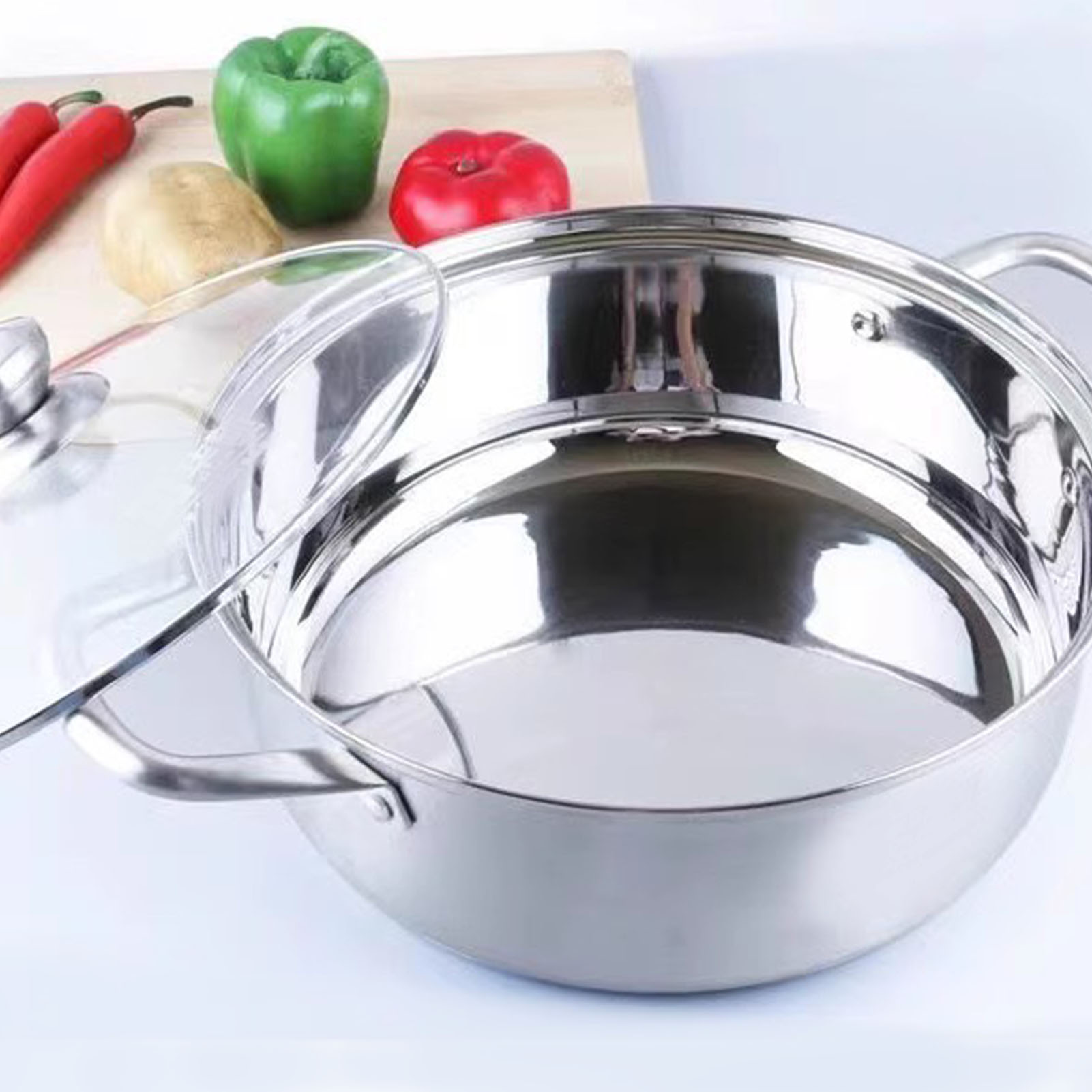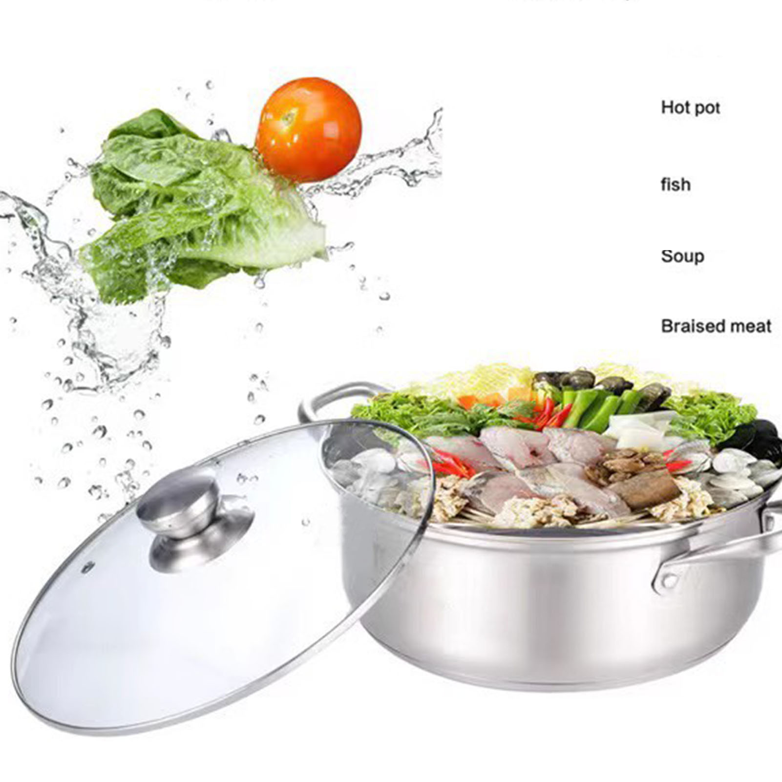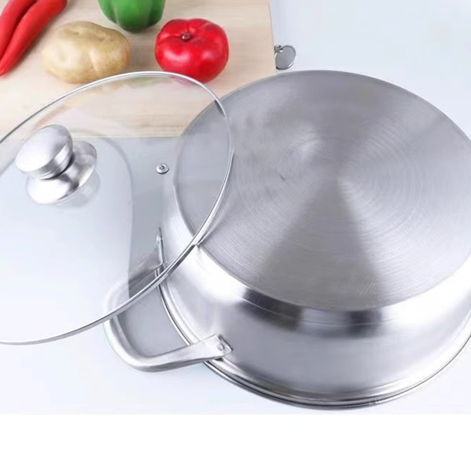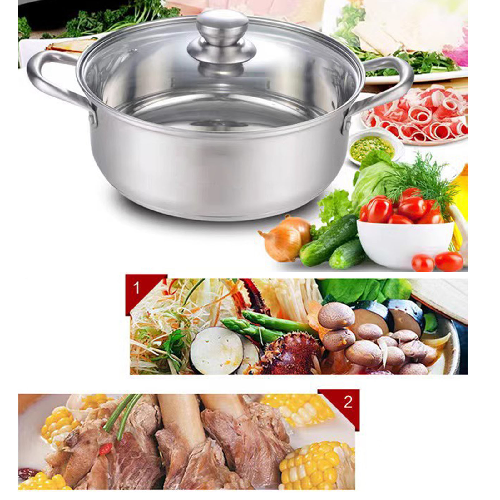 1、Thicken Bottom Design: Designed with a thickened double bottom design, unique hot pot ensures even heating for more efficient cooking. 2、Even Heat Distribution: With the thickened double bottom design, this pot effectively improves heat conduction efficiency, ensuring even heating for ingredients. 3、Easy To Clean: The smoothing stainless steel surface is easy to clean and does not leave behind food residue, which is saving time and effort. 4、Multi Functional Usage: Suitable for both home and commercial use, this pot is compatible with induction cooktops and gas burners, catering to different cooking needs. 5、Stainless Steel Material: Constructed with stainless steel material, thermal pot is heatproof and highly durable, which is ensuring long lasting performance.